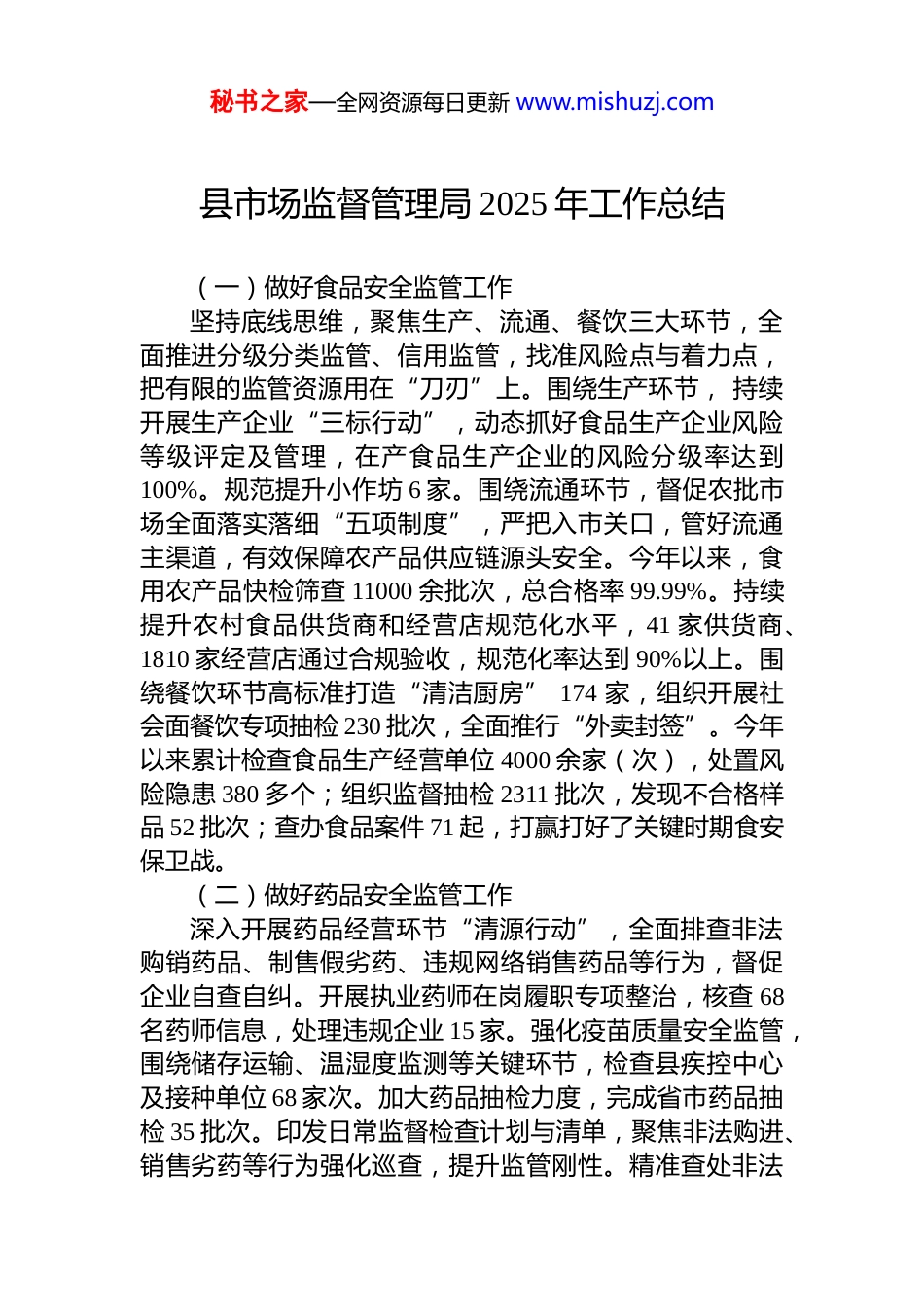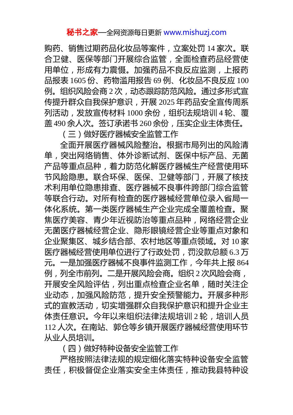 秘书之家—全网资源每日更新 www.mishuzj.com县市场监督管理局 2025 年工作总结(一)做好食品安全监管工作坚持底线思维,聚焦生产、流通、餐饮三大环节,全面推进分级分类监管、信用监管,找准风险点与着力点,把有限的监管资源用在“刀刃”上。围绕生产环节, 持续开展生产企业“三标行动”,动态抓好食品生产企业风险等级评定及管理,在产食品生产企业的风险分级率达到100%。规范提升小作坊 6 家。围绕流通环节,督促农批市场全面落实落细“五项制度”,严把入市关口,管好流通主渠道,有效保障农产品供应链源头安全。今年以来,食用农产品快检筛查 11000 余批次,总合格率 99.99%。持续提升农村食品供货商和经营店规范化水平,41 家供货商、1810 家经营店通过合规验收,规范化率达到 90%以上。围绕餐饮环节高标准打造“清洁厨房” 174 家,组织开展社会面餐饮专项抽检 230 批次,全面推行“外卖封签”。今年以来累计检查食品生产经营单位 4000 余家(次),处置风险隐患 380 多个;组织监督抽检 2311 批次,发现不合格样品 52 批次;查办食品案件 71 起,打赢打好了关键时期食安保卫战。(二)做好药品安全监管工作深入开展药品经营环节“清源行动”,全面排查非法购销药品、制售假劣药、违规网络销售药品等行为,督促企业自查自纠。开展执业药师在岗履职专项整治,核查 68名药师信息,处理违规企业 15 家。强化疫苗质量安全监管,围绕储存运输、温湿度监测等关键环节,检查县疾控中心及接种单位 68 家次。加大药品抽检力度,完成省市药品抽检 35 批次。印发日常监督检查计划与清单,聚焦非法购进、销售劣药等行为强化巡查,提升监管刚性。精准查处非法秘书之家—全网资源每日更新 www.mishuzj.com购药、销售过期药品化妆品等案件,立案处罚 14 家次。联合卫健、医保等部门开展综合监管,全面检查药品经营使用单位,形成有力震慑。加强药品不良反应监测,上报药品报表 1605 份、药物滥用报告 69 例、化妆品不良反应 100例。组织风险会商 2 次,动态跟踪防范风险。通过多形式宣传提升群众自我保护意识,开展 2025 年药品安全宣传周系列活动,发放宣传材料 1000 余份,组织法规培训 4 轮、覆盖 490 余人次。签订承诺书 260 余份,压实企业主体责任。(三)做好医疗器械安全监管工作全面开展医疗器械风险整治。根据市局列出的风险清单,突出网络销售、体外诊断试剂、医保中标产品、无菌产品等重点品种,着力防范化解医疗器械生产经营使用环节风险隐患。联合环保、医保、卫健等部门,开展了核技术利用单位隐患排查、医疗器械不良事件跨部门综合监管等联合行动。对所有检查的医疗器械经营单位录入省局一体化系统。第一类医疗器械生产企业完成全覆盖检查。聚焦医疗美容、青少年近视防治等重点品种,网络经营企业无菌医疗器械经营企业、隐形眼镜经营企业等重点对象和企业聚集区、城乡结合部、农村地区等重点领域。对 10 家医疗器械经营使用单位进行了行政处罚,罚没款总额 6.3 万元。一是加强医疗器械不良事件监测工作,今年共上报 864例,列全市前列。二是开展风险会商。组织 2 次风险会商,开展安全风险评估,列出重点检查企业名单,随时关注企业动态,加强风险防范,提升安全预警能力。开展多种形式的宣教活动,切实增强群众自我保护意识和提升企业主体责任意识。今年以来组织法律法规培训 2 轮,培训人员112 人次。在南站、郭仓等乡镇开展医疗器械经营使用环节从业人员培训。(四)做好特种设备安全监管工作严格按照法律法规的规定细化落实特种设备安全监管责任,积极督促企业落实安全主体责任,推动我县特种设秘书之家—全网资源每日更新 www.mishuzj.com备安全形势持续稳定向好,不断筑牢我县特种设备安全屏障。2025 年,以治本攻坚三年行动方案为纲领,结合实际开展种设备安全隐患排查整治行动、城镇燃气管道设施专项整治行动、大型游乐设施安全检查行动,做好法定节假日期间、中高考期间及重大活动期间特种设备安全保障工作等,所有的行动做到有检查、有记录、有台帐,实现问题隐患实现闭环管理。开展“民...