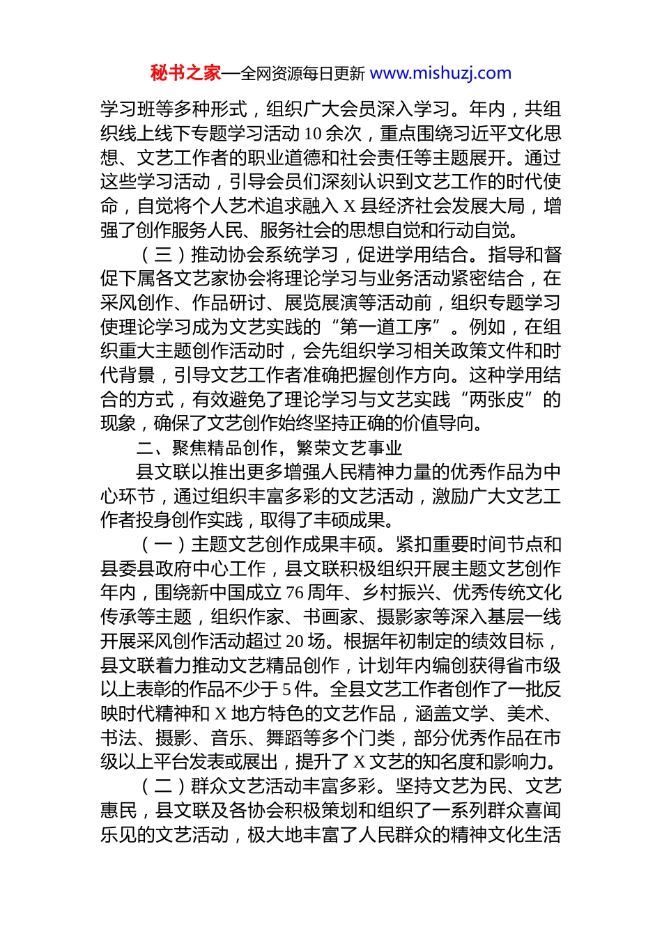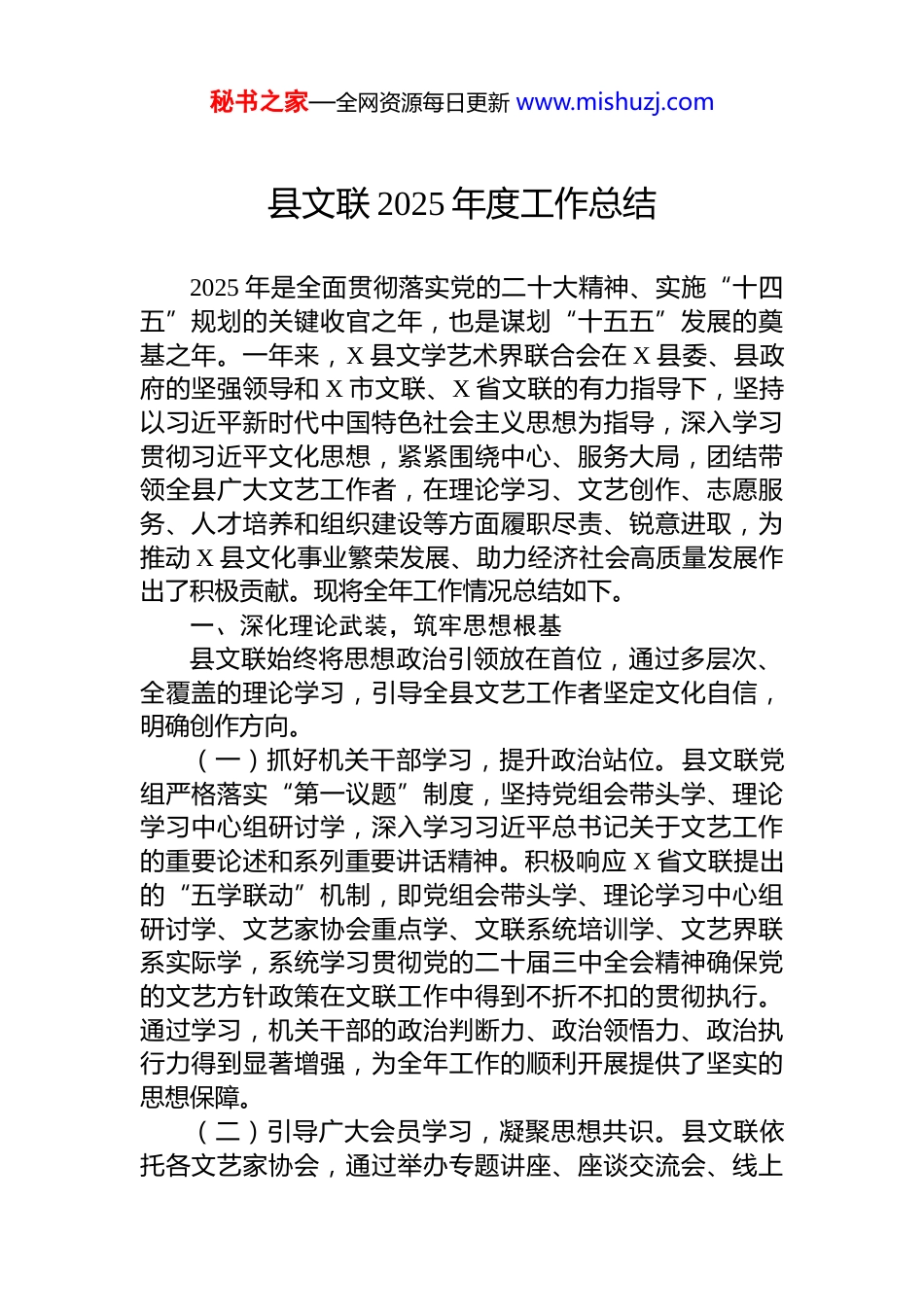 秘书之家—全网资源每日更新 www.mishuzj.com县文联 2025 年度工作总结2025 年是全面贯彻落实党的二十大精神、实施“十四五”规划的关键收官之年,也是谋划“十五五”发展的奠基之年。一年来,X 县文学艺术界联合会在 X 县委、县政府的坚强领导和 X 市文联、X 省文联的有力指导下,坚持以习近平新时代中国特色社会主义思想为指导,深入学习贯彻习近平文化思想,紧紧围绕中心、服务大局,团结带领全县广大文艺工作者,在理论学习、文艺创作、志愿服务、人才培养和组织建设等方面履职尽责、锐意进取,为推动 X 县文化事业繁荣发展、助力经济社会高质量发展作出了积极贡献。现将全年工作情况总结如下。一、深化理论武装,筑牢思想根基县文联始终将思想政治引领放在首位,通过多层次、全覆盖的理论学习,引导全县文艺工作者坚定文化自信,明确创作方向。(一)抓好机关干部学习,提升政治站位。县文联党组严格落实“第一议题”制度,坚持党组会带头学、理论学习中心组研讨学,深入学习习近平总书记关于文艺工作的重要论述和系列重要讲话精神。积极响应 X 省文联提出的“五学联动”机制,即党组会带头学、理论学习中心组研讨学、文艺家协会重点学、文联系统培训学、文艺界联系实际学,系统学习贯彻党的二十届三中全会精神确保党的文艺方针政策在文联工作中得到不折不扣的贯彻执行。通过学习,机关干部的政治判断力、政治领悟力、政治执行力得到显著增强,为全年工作的顺利开展提供了坚实的思想保障。(二)引导广大会员学习,凝聚思想共识。县文联依托各文艺家协会,通过举办专题讲座、座谈交流会、线上秘书之家—全网资源每日更新 www.mishuzj.com学习班等多种形式,组织广大会员深入学习。年内,共组织线上线下专题学习活动 10 余次,重点围绕习近平文化思想、文艺工作者的职业道德和社会责任等主题展开。通过这些学习活动,引导会员们深刻认识到文艺工作的时代使命,自觉将个人艺术追求融入 X 县经济社会发展大局,增强了创作服务人民、服务社会的思想自觉和行动自觉。(三)推动协会系统学习,促进学用结合。指导和督促下属各文艺家协会将理论学习与业务活动紧密结合,在采风创作、作品研讨、展览展演等活动前,组织专题学习使理论学习成为文艺实践的“第一道工序”。例如,在组织重大主题创作活动时,会先组织学习相关政策文件和时代背景,引导文艺工作者准确把握创作方向。这种学用结合的方式,有效避免了理论学习与文艺实践“两张皮”的现象,确保了文艺创作始终坚持正确的价值导向。二、聚焦精品创作,繁荣文艺事业县文联以推出更多增强人民精神力量的优秀作品为中心环节,通过组织丰富多彩的文艺活动,激励广大文艺工作者投身创作实践,取得了丰硕成果。(一)主题文艺创作成果丰硕。紧扣重要时间节点和县委县政府中心工作,县文联积极组织开展主题文艺创作年内,围绕新中国成立 76 周年、乡村振兴、优秀传统文化传承等主题,组织作家、书画家、摄影家等深入基层一线开展采风创作活动超过 20 场。根据年初制定的绩效目标,县文联着力推动文艺精品创作,计划年内编创获得省市级以上表彰的作品不少于 5 件。全县文艺工作者创作了一批反映时代精神和 X 地方特色的文艺作品,涵盖文学、美术、书法、摄影、音乐、舞蹈等多个门类,部分优秀作品在市级以上平台发表或展出,提升了 X 文艺的知名度和影响力。(二)群众文艺活动丰富多彩。坚持文艺为民、文艺惠民,县文联及各协会积极策划和组织了一系列群众喜闻乐见的文艺活动,极大地丰富了人民群众的精神文化生活秘书之家—全网资源每日更新 www.mishuzj.com年初,成功举办“非遗迎新·年味 X”为主题的 2025 年迎新春剪纸比赛暨书赠春联文艺演出志愿服务活动,营造了欢乐祥和的节日氛围。为传承和弘扬地方特色文化,县文联于 10 月在 X 镇成功举办了 2025 年 X 傩戏大赛暨新时代文明实践示范活动,吸引了大量群众参与和观看,有效推动了地方戏曲的保护与传承。此外,县文联还积极引导和支持各协会根据自身特点开展活动,如作家协会举办作品分享会、摄影家协会举办采风摄影展、音乐家协会组...