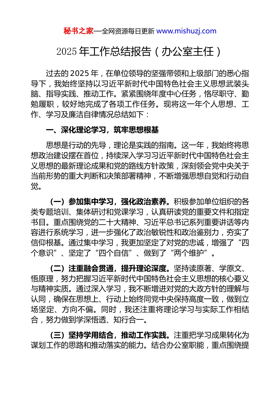 秘书之家—全网资源每日更新 www.mishuzj.com2025 年工作总结报告(办公室主任)过去的 2025 年,在单位领导的坚强带领和上级部门的悉心指导下,我始终坚持以习近平新时代中国特色社会主义思想武装头脑、指导实践、推动工作。紧紧围绕年度中心任务,恪尽职守、勤勉履职,较好地完成了各项工作任务。现将这一年个人思想、工作、学习及廉洁自律情况总结如下:一、深化理论学习,筑牢思想根基思想是行动的先导,理论是实践的指南。这一年,我始终将思想政治建设摆在首位,持续深入学习习近平新时代中国特色社会主义思想的最新理论成果和党的路线方针政策,深刻领会党中央关于当前形势的重大判断和决策部署精神,不断增强思想自觉和行动自觉。(一)参加集中学习,强化政治素养。积极参加单位组织的各类专题培训、集体研讨和党课学习,认真研读党的重要文件和指定书目。重点围绕党的二十大精神、习近平总书记系列重要讲话等内容进行系统学习,进一步强化了政治敏锐性和政治鉴别力,夯实了信仰根基。通过集中学习,我更加坚定了对党的忠诚,增强了“四个意识”、坚定了“四个自信”、做到了“两个维护”。(二)注重融会贯通,提升理论深度。坚持读原著、学原文、悟原理,努力把握习近平新时代中国特色社会主义思想的核心要义与精神实质。通过深入学习,我不断增进对党的大政方针的理解与认同,确保在思想上、行动上始终同党中央保持高度一致,做到立场坚定、方向不偏。同时,我还注重将理论学习与实际工作相结合,努力做到学深悟透、知行合一。(三)坚持学用结合,推动工作实践。注重把学习成果转化为谋划工作的思路和推动落实的能力。结合办公室职能,重点围绕提秘书之家—全网资源每日更新 www.mishuzj.com升服务保障水平、优化运行机制等方面进行思考探索。在日常工作中,我努力将所学理论运用到实际工作中,在参谋助手、协调运转、服务保障等工作中体现学习成效,实现新的进步。例如,在起草重要文稿时,我能够运用所学理论,准确把握工作方向和重点,使文稿更具针对性和指导性。二、聚焦主责主业,扎实推进工作这一年,我严格对照年初计划与年度安排,认真履行岗位职责,积极推进各项工作,努力为单位的发展贡献自己的力量。(一)着力文稿起草审核,提升以文辅政质效。独立或参与起草各类通知、报告、讲话稿、总结等材料 50 余份,累计约 20 万字。审核各部门报送文稿 60 余篇,严把政策、内容与文字关,确保规范准确。在文稿起草过程中,我注重深入调研、精心构思,努力使文稿内容丰富、逻辑严谨、语言流畅。牵头完成的《关于单位年度工作情况的汇报》《关于推进某项重点工作的实施方案》等文稿,得到了领导的肯定和好评。(二)做好会议活动保障,确保运转规范有序。协助组织筹备年度工作会、季度工作推进会、专题协调会等各类会议 10 余次,细致做好会场布置、材料准备、纪要记录等环节。完成上级调研及外部接待任务 5 次,做到方案周全、衔接顺畅、服务到位。在会议活动保障工作中,我始终以高度的责任感和严谨的工作态度,确保每一个环节都不出差错。同时,我还注重与各部门的沟通协调,共同做好会议活动的组织筹备工作,为单位的工作顺利开展提供了有力保障。(三)加强信息报送宣传,展现单位工作成效。围绕中心工作,及时收集、整理、报送工作动态与经验类信息 30 余条,被上级采纳或刊发 15 条。协助更新内部宣传平台内容 20 期,有效展示单位形象与成效。在信息报送宣传工作中,我注重捕捉工作亮点和特色,及时准确地向上级部门和社会各界展示单位的工作成果和秘书之家—全网资源每日更新 www.mishuzj.com发展动态。同时,我还积极参与单位的宣传策划工作,为提升单位的知名度和美誉度做出了积极贡献。(四)有序推进日常运转,夯实基础服务支撑。平稳处理收发文、印章管理、档案整理、机要通信等常规事务,优化文件传阅流程,保障日常运转高效、规范、有序。在日常工作中,我注重细节、注重效率,认真做好每一项工作。同时,我还积极探索创新工作方法,不断提高工作质量和效率。例如,通过建立文件电子台账,实现了文件的快速检索和查阅,提高...