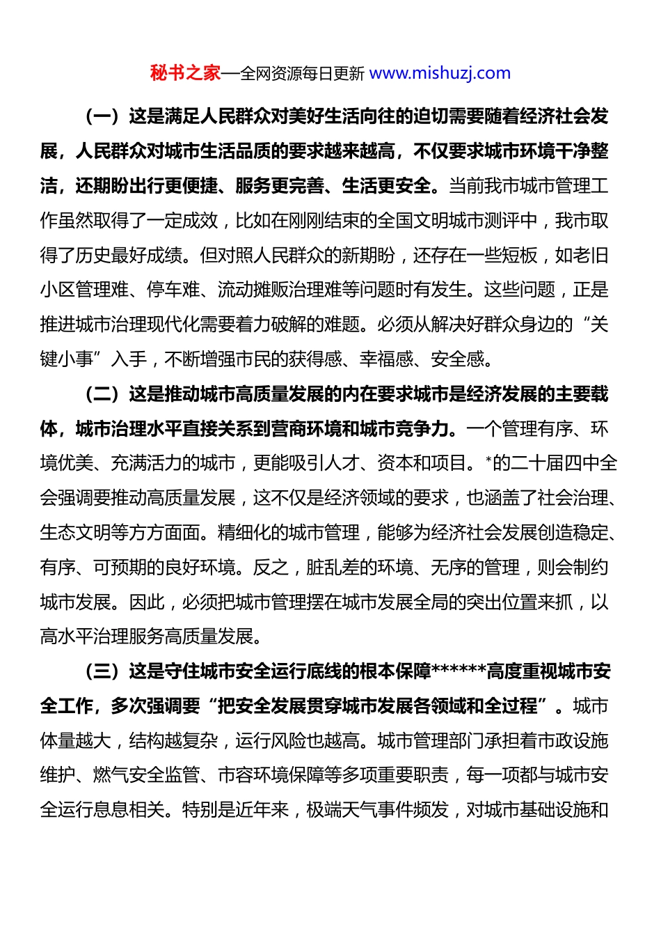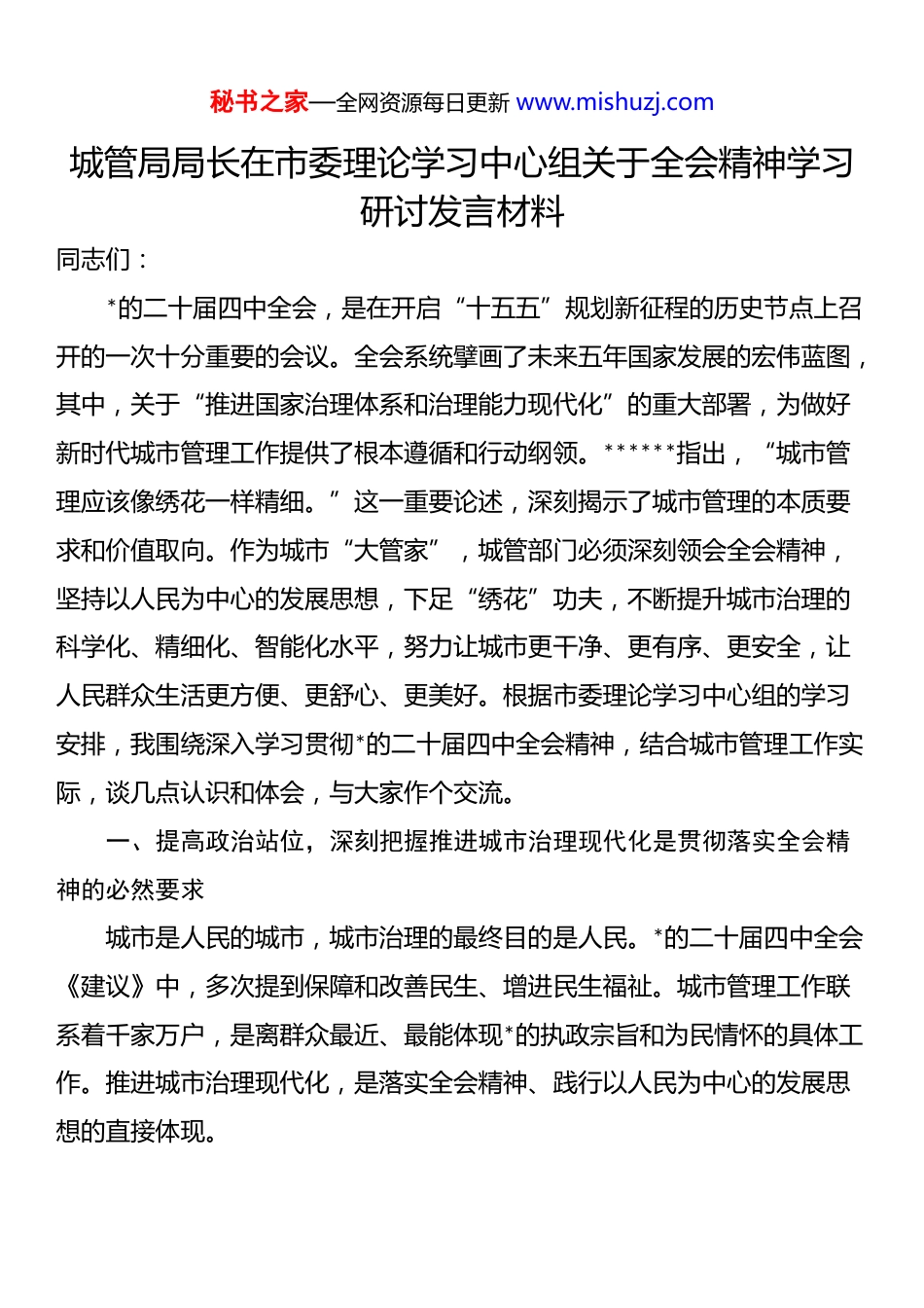 秘书之家—全网资源每日更新 www.mishuzj.com城管局局长在市委理论学习中心组关于全会精神学习研讨发言材料同志们:*的二十届四中全会,是在开启“十五五”规划新征程的历史节点上召开的一次十分重要的会议。全会系统擘画了未来五年国家发展的宏伟蓝图,其中,关于“推进国家治理体系和治理能力现代化”的重大部署,为做好新时代城市管理工作提供了根本遵循和行动纲领。******指出,“城市管理应该像绣花一样精细。”这一重要论述,深刻揭示了城市管理的本质要求和价值取向。作为城市“大管家”,城管部门必须深刻领会全会精神,坚持以人民为中心的发展思想,下足“绣花”功夫,不断提升城市治理的科学化、精细化、智能化水平,努力让城市更干净、更有序、更安全,让人民群众生活更方便、更舒心、更美好。根据市委理论学习中心组的学习安排,我围绕深入学习贯彻*的二十届四中全会精神,结合城市管理工作实际,谈几点认识和体会,与大家作个交流。一、提高政治站位,深刻把握推进城市治理现代化是贯彻落实全会精神的必然要求城市是人民的城市,城市治理的最终目的是人民。*的二十届四中全会《建议》中,多次提到保障和改善民生、增进民生福祉。城市管理工作联系着千家万户,是离群众最近、最能体现*的执政宗旨和为民情怀的具体工作。推进城市治理现代化,是落实全会精神、践行以人民为中心的发展思想的直接体现。秘书之家—全网资源每日更新 www.mishuzj.com(一)这是满足人民群众对美好生活向往的迫切需要随着经济社会发展,人民群众对城市生活品质的要求越来越高,不仅要求城市环境干净整洁,还期盼出行更便捷、服务更完善、生活更安全。当前我市城市管理工作虽然取得了一定成效,比如在刚刚结束的全国文明城市测评中,我市取得了历史最好成绩。但对照人民群众的新期盼,还存在一些短板,如老旧小区管理难、停车难、流动摊贩治理难等问题时有发生。这些问题,正是推进城市治理现代化需要着力破解的难题。必须从解决好群众身边的“关键小事”入手,不断增强市民的获得感、幸福感、安全感。(二)这是推动城市高质量发展的内在要求城市是经济发展的主要载体,城市治理水平直接关系到营商环境和城市竞争力。一个管理有序、环境优美、充满活力的城市,更能吸引人才、资本和项目。*的二十届四中全会强调要推动高质量发展,这不仅是经济领域的要求,也涵盖了社会治理、生态文明等方方面面。精细化的城市管理,能够为经济社会发展创造稳定、有序、可预期的良好环境。反之,脏乱差的环境、无序的管理,则会制约城市发展。因此,必须把城市管理摆在城市发展全局的突出位置来抓,以高水平治理服务高质量发展。(三)这是守住城市安全运行底线的根本保障******高度重视城市安全工作,多次强调要“把安全发展贯穿城市发展各领域和全过程”。城市体量越大,结构越复杂,运行风险也越高。城市管理部门承担着市政设施维护、燃气安全监管、市容环境保障等多项重要职责,每一项都与城市安全运行息息相关。特别是近年来,极端天气事件频发,对城市基础设施和秘书之家—全网资源每日更新 www.mishuzj.com应急管理能力提出了更高要求。必须树牢底线思维,增强忧患意识,运用现代化手段加强对城市运行风险的监测、预警和处置,坚决防范和遏制重特大安全事故发生,确保城市生命线安全。二、聚焦主责主业,以“绣花”功夫全面提升城市治理现代化水平学习贯彻全会精神,关键在行动,落脚在实效。市城管局将对标全会提出的新部署新要求,聚焦群众关切,靶向发力、精准施策,奋力在推进城市治理现代化上实现新突破。(一)着力在“智慧赋能”上实现新突破,让城市管理更聪明全会《建议》提出要“加快数字社会建设步伐”。我们将抢抓数字时代机遇,大力推进智慧城管建设,为城市装上“智慧大脑”。一是建强一个平台。全面升级我市数字化城市管理服务中心,整合市政、环卫、园林、执法等各类数据资源,构建“一网统管”的城市运行管理服务平台,实现“一屏观全域、一键管全城”。力争到 2026 年底,平台数据归集率达到 90%以上,事项办结率稳定在 98%以上。二是推广一批应用。在井盖、路灯、公厕、垃圾...