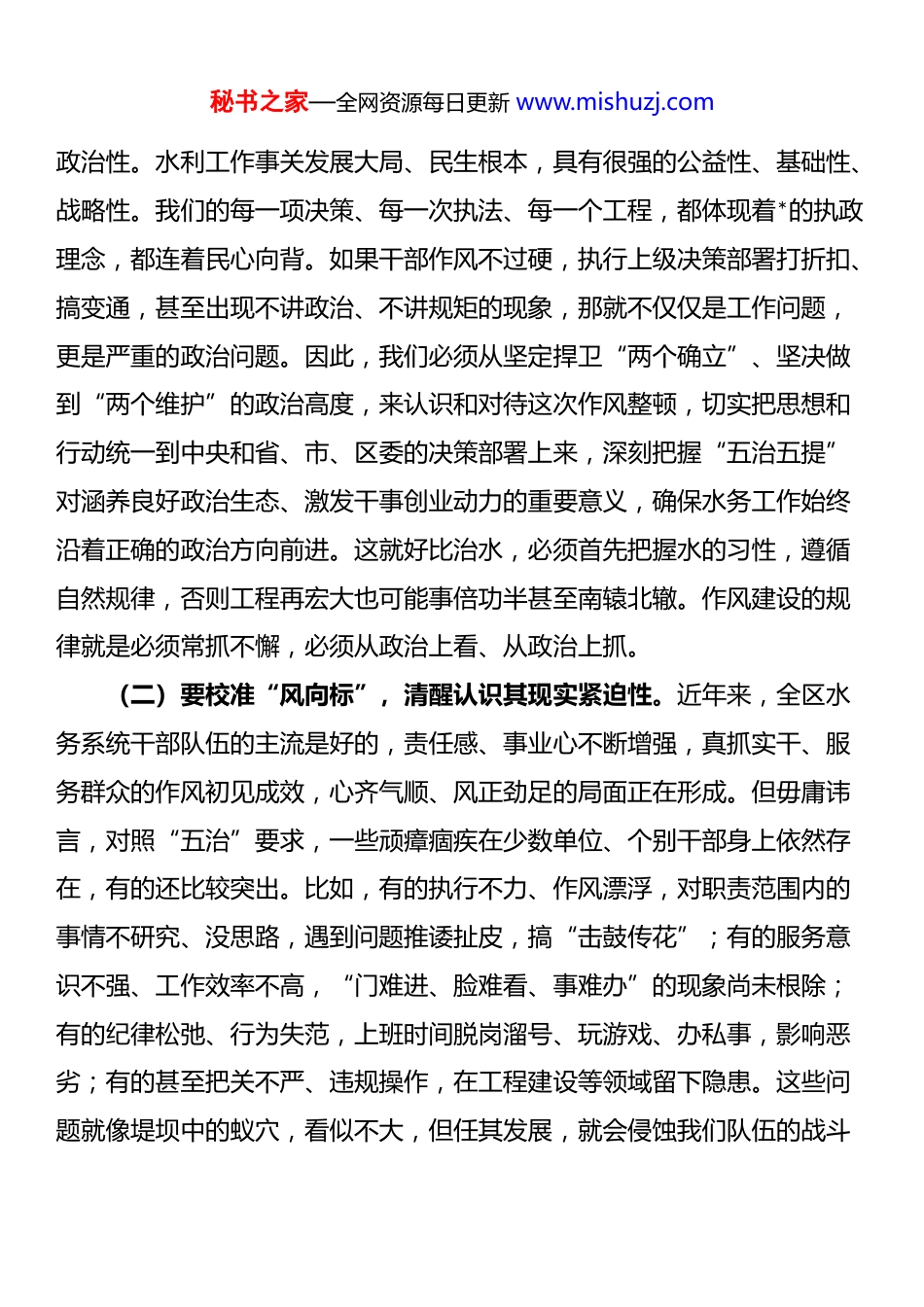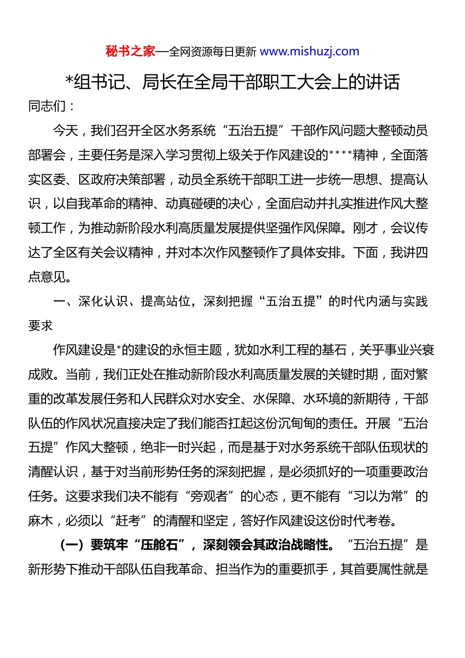 秘书之家—全网资源每日更新 www.mishuzj.com*组书记、局长在全局干部职工大会上的讲话同志们:今天,我们召开全区水务系统“五治五提”干部作风问题大整顿动员部署会,主要任务是深入学习贯彻上级关于作风建设的****精神,全面落实区委、区政府决策部署,动员全系统干部职工进一步统一思想、提高认识,以自我革命的精神、动真碰硬的决心,全面启动并扎实推进作风大整顿工作,为推动新阶段水利高质量发展提供坚强作风保障。刚才,会议传达了全区有关会议精神,并对本次作风整顿作了具体安排。下面,我讲四点意见。一、深化认识、提高站位,深刻把握“五治五提”的时代内涵与实践要求作风建设是*的建设的永恒主题,犹如水利工程的基石,关乎事业兴衰成败。当前,我们正处在推动新阶段水利高质量发展的关键时期,面对繁重的改革发展任务和人民群众对水安全、水保障、水环境的新期待,干部队伍的作风状况直接决定了我们能否扛起这份沉甸甸的责任。开展“五治五提”作风大整顿,绝非一时兴起,而是基于对水务系统干部队伍现状的清醒认识,基于对当前形势任务的深刻把握,是必须抓好的一项重要政治任务。这要求我们决不能有“旁观者”的心态,更不能有“习以为常”的麻木,必须以“赶考”的清醒和坚定,答好作风建设这份时代考卷。(一)要筑牢“压舱石”,深刻领会其政治战略性。“五治五提”是新形势下推动干部队伍自我革命、担当作为的重要抓手,其首要属性就是秘书之家—全网资源每日更新 www.mishuzj.com政治性。水利工作事关发展大局、民生根本,具有很强的公益性、基础性、战略性。我们的每一项决策、每一次执法、每一个工程,都体现着*的执政理念,都连着民心向背。如果干部作风不过硬,执行上级决策部署打折扣、搞变通,甚至出现不讲政治、不讲规矩的现象,那就不仅仅是工作问题,更是严重的政治问题。因此,我们必须从坚定捍卫“两个确立”、坚决做到“两个维护”的政治高度,来认识和对待这次作风整顿,切实把思想和行动统一到中央和省、市、区委的决策部署上来,深刻把握“五治五提”对涵养良好政治生态、激发干事创业动力的重要意义,确保水务工作始终沿着正确的政治方向前进。这就好比治水,必须首先把握水的习性,遵循自然规律,否则工程再宏大也可能事倍功半甚至南辕北辙。作风建设的规律就是必须常抓不懈,必须从政治上看、从政治上抓。(二)要校准“风向标”,清醒认识其现实紧迫性。近年来,全区水务系统干部队伍的主流是好的,责任感、事业心不断增强,真抓实干、服务群众的作风初见成效,心齐气顺、风正劲足的局面正在形成。但毋庸讳言,对照“五治”要求,一些顽瘴痼疾在少数单位、个别干部身上依然存在,有的还比较突出。比如,有的执行不力、作风漂浮,对职责范围内的事情不研究、没思路,遇到问题推诿扯皮,搞“击鼓传花”;有的服务意识不强、工作效率不高,“门难进、脸难看、事难办”的现象尚未根除;有的纪律松弛、行为失范,上班时间脱岗溜号、玩游戏、办私事,影响恶劣;有的甚至把关不严、违规操作,在工程建设等领域留下隐患。这些问题就像堤坝中的蚁穴,看似不大,但任其发展,就会侵蚀我们队伍的战斗秘书之家—全网资源每日更新 www.mishuzj.com力,损害水务部门的形象,最终危及水利事业发展的根基。开展“五治五提”整顿,就是要直击这些痛点、堵点,进行一次彻底的“大扫除”,祛病强身,这已是刻不容缓。(三)要树立“新标杆”,充分理解其发展引领性。作风建设的最终目的是为了推动发展、服务人民。区委区政府明确提出要建设“老家*县·宜美*”,水是生态之基,水利是发展之要。我们的作风如何,直接关系到水资源能否可持续利用,关系到大大小小的水利工程能否成为放心工程、廉洁工程,关系到防汛抗旱的指令能否高效畅通,关系到每家每户的饮水安全能否保障。这次作风整顿,强调要注重统筹结合,推动中心工作,其深意就在于要以作风的大转变,促效能的大提升,带动水利事业的大发展。我们要通过整顿,使“负责、献身、求是”的水利行业精神在新时代焕发新的光彩,引导广大干部把心思用在推动发展上,把精力投到为民服务中,以过硬作风创造...