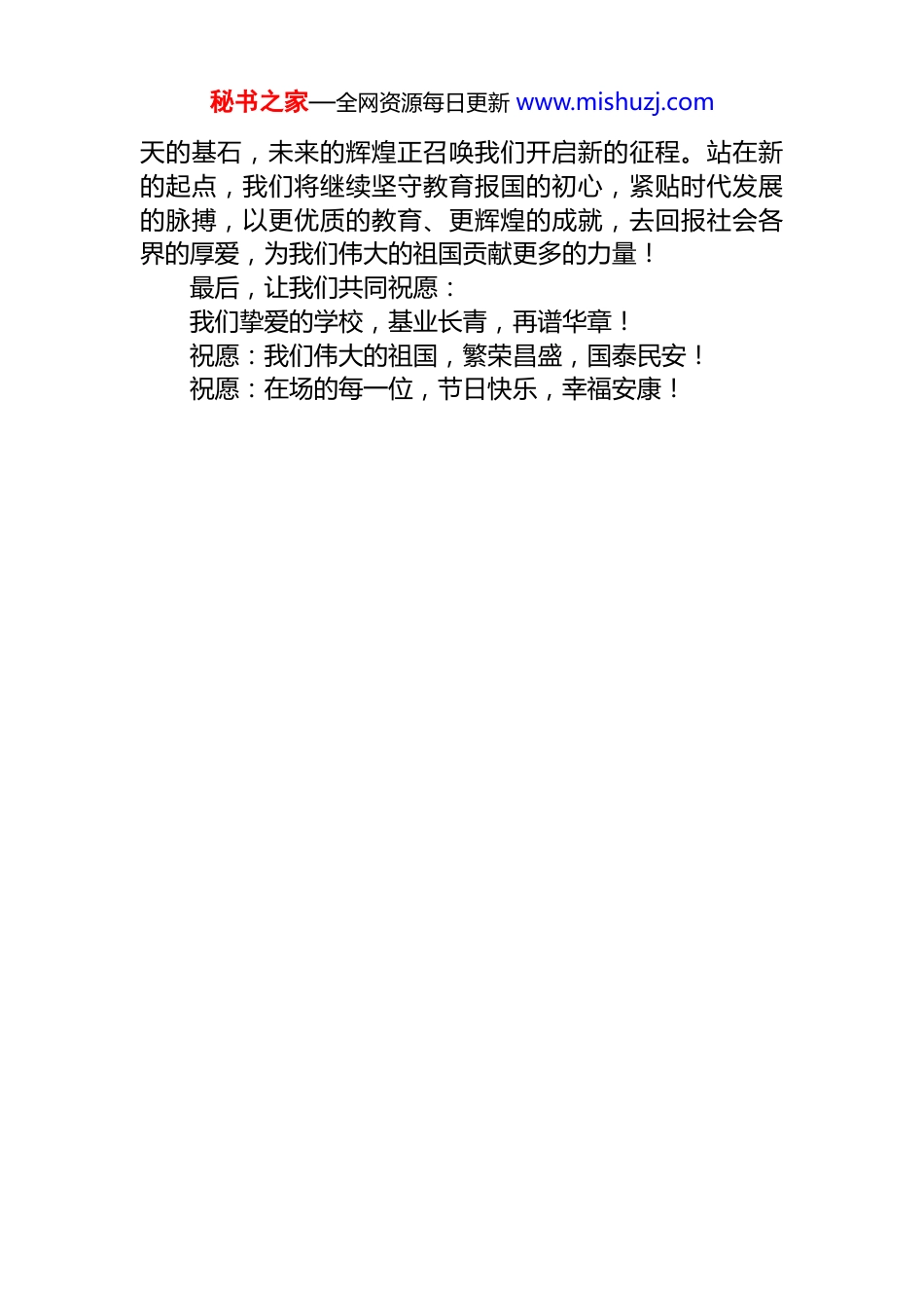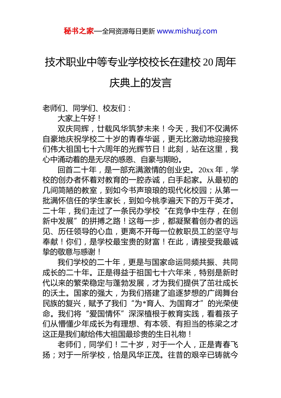 秘书之家—全网资源每日更新 www.mishuzj.com技术职业中等专业学校校长在建校 20 周年庆典上的发言老师们、同学们、校友们:大家上午好!双庆同辉,廿载风华筑梦未来!今天,我们不仅满怀自豪地庆祝学校二十岁的青春华诞,更无比激动地迎接我们伟大祖国七十六周年的光辉节日!此刻,站在这里,我心中涌动着的是无尽的感恩、自豪与期盼。回首二十年,是一部充满激情的创业史。20xx 年,学校的创办者怀着对教育的一腔赤诚,白手起家。从最初的几间简陋的教室,到如今书声琅琅的现代化校园;从第一批满怀信任的学生家长,到如今桃李遍天下的万千英才。二十年,我们走过了一条民办学校“在竞争中生存,在创新中发展”的拼搏之路!这每一步,都凝聚着创办者的远见、历任领导的心血,更离不开每一位教职员工的坚守与奉献!你们,是学校最宝贵的财富!在此,请接受我最诚挚的敬意与感谢!我们学校的二十年,更是与国家命运同频共振、共同成长的二十年。正是得益于祖国七十六年来,特别是新时代以来的繁荣稳定与蓬勃发展,才为我们提供了茁壮成长的沃土。国家的强大,为我们搭建了追逐梦想的广阔舞台民族的复兴,赋予了我们“为*育人、为国育才”的光荣使命。我们将“爱国情怀”深深植根于教育实践,看着孩子们从懵懂少年成长为有理想、有本领、有担当的栋梁之才这正是我们献给伟大祖国最珍贵的生日礼物!老师们,同学们!二十岁,对于一个人,正是青春飞扬;对于一所学校,恰是风华正茂。往昔的艰辛已铸就今秘书之家—全网资源每日更新 www.mishuzj.com天的基石,未来的辉煌正召唤我们开启新的征程。站在新的起点,我们将继续坚守教育报国的初心,紧贴时代发展的脉搏,以更优质的教育、更辉煌的成就,去回报社会各界的厚爱,为我们伟大的祖国贡献更多的力量!最后,让我们共同祝愿:我们挚爱的学校,基业长青,再谱华章!祝愿:我们伟大的祖国,繁荣昌盛,国泰民安!祝愿:在场的每一位,节日快乐,幸福安康!