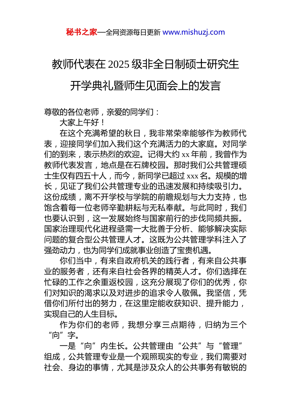 秘书之家—全网资源每日更新 www.mishuzj.com教师代表在 2025 级非全日制硕士研究生开学典礼暨师生见面会上的发言尊敬的各位老师,亲爱的同学们:大家上午好!在这个充满希望的秋日,我非常荣幸能够作为教师代表,迎接同学们加入我们这个充满活力的大家庭。对同学们的到来,表示热烈的欢迎。记得大约 xx 年前,我曾作为教师代表发言,地点是在石牌校园。那时我们公共管理硕士生仅有四五十人,而今,新同学已超过 xxx 名。规模的增长,见证了我们公共管理专业的迅速发展和持续吸引力。这份成绩,离不开学校与学院的前瞻规划与大力支持,也饱含着每一位老师辛勤耕耘与无私奉献。与此同时,我们也要认识到,这一发展始终与国家前行的步伐同频共振。国家治理现代化进程亟需一大批善于分析、能够解决实际问题的复合型公共管理人才。这既为公共管理学科注入了强劲动力,也为同学们成就事业创造了宝贵机遇。你们当中,有来自政府机关的践行者,有来自公共事业的服务者,还有来自社会各界的精英人才。你们选择在忙碌的工作之余重返校园,这充分展现了你们的优秀,你们对知识的渴求以及对进步的追求令人敬佩。我坚信,凭借你们所付出的努力,在这里定能收获知识、提升能力,实现自己的人生目标。作为你们的老师,我想分享三点期待,归纳为三个“向”字。一是“向”内生长。公共管理由“公共”与“管理”组成,公共管理专业是一个观照现实的专业,我们需要对社会、身边的事情,尤其是涉及众人的公共事务有敏锐的秘书之家—全网资源每日更新 www.mishuzj.com感知与体会。我们要“以公共的眼光来理解管理,以管理的视角来审视公共”。也就是说,“管理要以公共为前提公共要以管理为依归。”鉴于此,希望同学们在学习与工作中坚守公共价值,敬畏公共价值,谨记人民的需求就是公共管理,做心系家国的担当者,让每一次行动都多一分温度。二是“向”上思考。公共管理不仅在于知识传授,更在于思维方式的革新。这一学科需要融合政治学、社会学法学、经济学等多学科知识和多维度视角来剖析公共问题致力于培养兼具专业深度与跨界视野的 t 型人才。同学们来自不同单位和岗位,日常忙于具体事务,然而,“具体问题的解决”实则是深度思考的结果。所以,希望同学们将自身学习、工作中遇到的问题,置于国家发展趋势以及世界大环境中来思考。多阅读理论书籍,密切关注国家政策持续提升“提问的能力”,做“能解题、会破题”的治理者。三是“向”下砺行。公共管理硕士的学习,是一场“带着问题来,揣着办法走”的成长之旅。希望同学们勇于迎接挑战,扎根一线,倾听最真挚的民声,用脚步丈量最真实的民情。将工作中的真问题带入课堂思索,再将课堂上的新思路带回岗位践行。要把论文写在祖国大地上,写在社区街巷中,写在办事窗口前,做知行合一的实践者多年以后,若有人因你们的某一项决策、某一项改革,生活得更美好,内心感到更温暖,那便是对我们这份工作最珍贵的回馈。希望同学们能牢记“向内生长、向上思考、向下砺行”这三点期待,真正做到“胸怀天下担使命,知行合一启新程”。最后,衷心祝愿各位同学在新的学习阶段学有所获、学以致用,也祝各位老师工作顺利,生活愉快!谢谢大家!秘书之家—全网资源每日更新 www.mishuzj.com