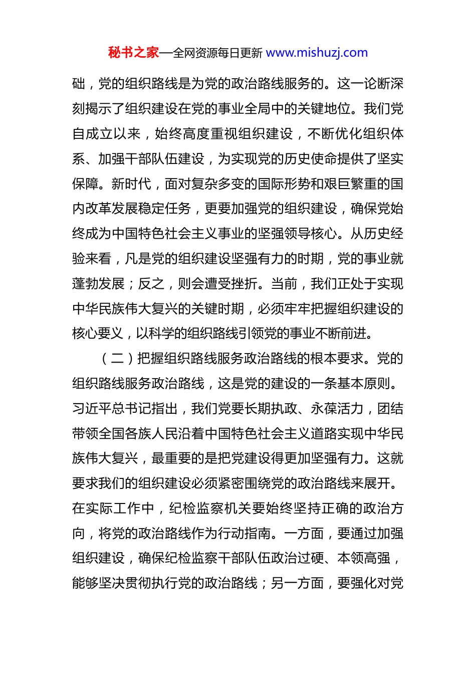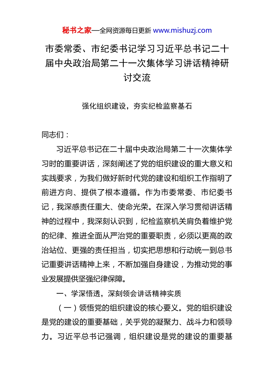 秘书之家—全网资源每日更新 www.mishuzj.com市委常委、市纪委书记学习习近平总书记二十届中央政治局第二十一次集体学习讲话精神研讨交流 强化组织建设,夯实纪检监察基石同志们:习近平总书记在二十届中央政治局第二十一次集体学习时的重要讲话,深刻阐述了党的组织建设的重大意义和实践要求,为我们做好新时代党的建设和组织工作指明了前进方向、提供了根本遵循。作为市委常委、市纪委书记,我深感责任重大、使命光荣。在深入学习贯彻讲话精神的过程中,我深刻认识到,纪检监察机关肩负着维护党的纪律、推进全面从严治党的重要职责,必须以更高的政治站位、更强的责任担当,切实把思想和行动统一到总书记重要讲话精神上来,不断加强自身建设,为推动党的事业发展提供坚强纪律保障。一、学深悟透,深刻领会讲话精神实质(一)领悟党的组织建设的核心要义。党的组织建设是党的建设的重要基础,关乎党的凝聚力、战斗力和领导力。习近平总书记强调,组织建设是党的建设的重要基秘书之家—全网资源每日更新 www.mishuzj.com础,党的组织路线是为党的政治路线服务的。这一论断深刻揭示了组织建设在党的事业全局中的关键地位。我们党自成立以来,始终高度重视组织建设,不断优化组织体系、加强干部队伍建设,为实现党的历史使命提供了坚实保障。新时代,面对复杂多变的国际形势和艰巨繁重的国内改革发展稳定任务,更要加强党的组织建设,确保党始终成为中国特色社会主义事业的坚强领导核心。从历史经验来看,凡是党的组织建设坚强有力的时期,党的事业就蓬勃发展;反之,则会遭受挫折。当前,我们正处于实现中华民族伟大复兴的关键时期,必须牢牢把握组织建设的核心要义,以科学的组织路线引领党的事业不断前进。(二)把握组织路线服务政治路线的根本要求。党的组织路线服务政治路线,这是党的建设的一条基本原则。习近平总书记指出,我们党要长期执政、永葆活力,团结带领全国各族人民沿着中国特色社会主义道路实现中华民族伟大复兴,最重要的是把党建设得更加坚强有力。这就要求我们的组织建设必须紧密围绕党的政治路线来展开。在实际工作中,纪检监察机关要始终坚持正确的政治方向,将党的政治路线作为行动指南。一方面,要通过加强组织建设,确保纪检监察干部队伍政治过硬、本领高强,能够坚决贯彻执行党的政治路线;另一方面,要强化对党秘书之家—全网资源每日更新 www.mishuzj.com的政治路线贯彻执行情况的监督检查,及时发现和纠正偏离政治路线的行为,为党的政治路线的顺利实施保驾护航。只有这样,才能真正实现组织路线服务政治路线的根本要求,推动党和国家事业不断向前发展。(三)明确贯彻落实组织路线的实践路径。新时代党的组织路线为加强党的组织建设提供了科学遵循,我们必须明确其具体的实践路径。习近平总书记强调,要抓好坚持和完善党的领导、坚持和发展中国特色社会主义,抓好用党的科学理论武装全党,抓好党的组织体系建设,抓好执政骨干队伍和人才队伍建设,抓好党的组织制度建设。这“五个抓好”为我们贯彻落实组织路线提供了清晰的工作思路。纪检监察机关要以此为指导,结合自身工作实际,积极探索实践。例如,在加强党的组织体系建设方面,要强化纪检监察系统的组织架构,完善上下级纪检监察机关之间的工作协调机制,提高组织效能;在执政骨干队伍和人才队伍建设方面,要注重选拔任用政治坚定、业务精通、敢于担当的纪检监察干部,加强干部培训,提升干部综合素质。通过扎实推进各项工作,切实将新时代党的组织路线落到实处。二、对标对表,检视纪检监察工作不足(一)组织建设的体制机制短板。当前,纪检监察组秘书之家—全网资源每日更新 www.mishuzj.com织建设在体制机制方面仍存在一些短板。一是部分基层纪检监察机构设置不够合理,人员配备不足,导致监督执纪工作难以有效开展。一些乡镇纪委工作人员身兼数职,精力分散,无法专注于纪检监察业务。二是纪检监察机关内部的工作流程和协调机制有待优化。在一些复杂案件的办理过程中,不同部门之间的协作不够顺畅,信息沟通存在障碍,影响了办案效率。三是在与其他监督主体的协作配合上,还存在制度不...