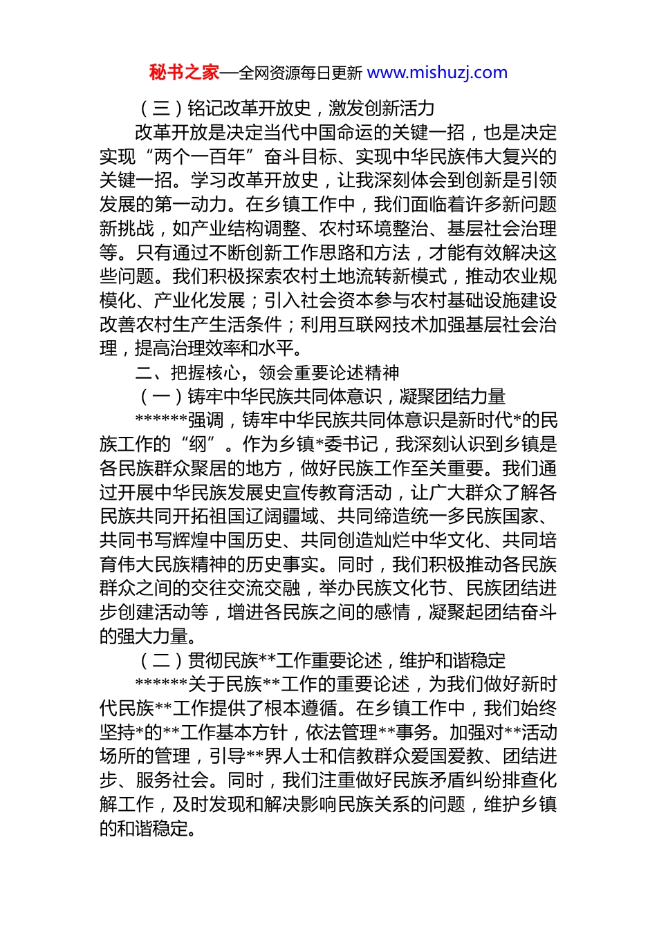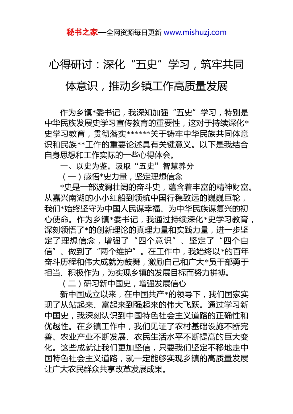 秘书之家—全网资源每日更新 www.mishuzj.com心得研讨:深化“五史”学习,筑牢共同体意识,推动乡镇工作高质量发展作为乡镇*委书记,我深知加强“五史”学习,特别是中华民族发展史学习宣传教育的重要性,这对于持续深化*史学习教育,贯彻落实******关于铸牢中华民族共同体意识和民族**工作的重要论述具有关键意义。以下是我结合自身思想和工作实际的一些心得体会。一、以史为鉴,汲取“五史”智慧养分(一)感悟*史力量,坚定理想信念*史是一部波澜壮阔的奋斗史,蕴含着丰富的精神财富。从嘉兴南湖的小小红船到领航中国行稳致远的巍巍巨轮,我们*始终坚守为中国人民谋幸福、为中华民族谋复兴的初心使命。作为乡镇*委书记,我通过持续深化*史学习教育,深刻领悟了*的创新理论的真理力量和实践力量,进一步坚定了理想信念,增强了“四个意识”、坚定了“四个自信”、做到了“两个维护”。在工作中,我始终以*的百年奋斗历程和伟大成就为鼓舞,激励自己和广大*员干部勇于担当、积极作为,为实现乡镇的发展目标而努力拼搏。(二)研习新中国史,增强发展信心新中国成立以来,在中国共产*的领导下,我们国家实现了从站起来、富起来到强起来的伟大飞跃。通过学习新中国史,我深刻认识到中国特色社会主义道路的正确性和优越性。在乡镇工作中,我们见证了农村基础设施不断完善、农业产业不断发展、农民生活水平不断提高的巨大变化。这些成就让我们更加坚信,只要我们坚定不移地走中国特色社会主义道路,就一定能够实现乡镇的高质量发展让广大农民群众共享改革发展成果。秘书之家—全网资源每日更新 www.mishuzj.com(三)铭记改革开放史,激发创新活力改革开放是决定当代中国命运的关键一招,也是决定实现“两个一百年”奋斗目标、实现中华民族伟大复兴的关键一招。学习改革开放史,让我深刻体会到创新是引领发展的第一动力。在乡镇工作中,我们面临着许多新问题新挑战,如产业结构调整、农村环境整治、基层社会治理等。只有通过不断创新工作思路和方法,才能有效解决这些问题。我们积极探索农村土地流转新模式,推动农业规模化、产业化发展;引入社会资本参与农村基础设施建设改善农村生产生活条件;利用互联网技术加强基层社会治理,提高治理效率和水平。二、把握核心,领会重要论述精神(一)铸牢中华民族共同体意识,凝聚团结力量******强调,铸牢中华民族共同体意识是新时代*的民族工作的“纲”。作为乡镇*委书记,我深刻认识到乡镇是各民族群众聚居的地方,做好民族工作至关重要。我们通过开展中华民族发展史宣传教育活动,让广大群众了解各民族共同开拓祖国辽阔疆域、共同缔造统一多民族国家、共同书写辉煌中国历史、共同创造灿烂中华文化、共同培育伟大民族精神的历史事实。同时,我们积极推动各民族群众之间的交往交流交融,举办民族文化节、民族团结进步创建活动等,增进各民族之间的感情,凝聚起团结奋斗的强大力量。(二)贯彻民族**工作重要论述,维护和谐稳定******关于民族**工作的重要论述,为我们做好新时代民族**工作提供了根本遵循。在乡镇工作中,我们始终坚持*的**工作基本方针,依法管理**事务。加强对**活动场所的管理,引导**界人士和信教群众爱国爱教、团结进步、服务社会。同时,我们注重做好民族矛盾纠纷排查化解工作,及时发现和解决影响民族关系的问题,维护乡镇的和谐稳定。秘书之家—全网资源每日更新 www.mishuzj.com(三)坚持以人民为中心,增进民生福祉无论是铸牢中华民族共同体意识,还是做好民族**工作,最终的落脚点都是为了增进人民群众的福祉。在乡镇工作中,我们始终坚持以人民为中心的发展思想,把解决好人民群众最关心、最直接、最现实的利益问题作为一切工作的出发点和落脚点。加大对农村贫困群众的帮扶力度确保脱贫攻坚成果得到巩固拓展;加强农村教育、医疗、文化等公共服务体系建设,提高群众的生活质量;推进农村生态环境整治,打造美丽宜居乡村。三、学以致用,推动乡镇工作实践(一)加强基层 dj,夯实战斗堡垒乡镇*委是*在农村的基层组织,是领导农村各项事业发展的核心力量。我们以持续深化*史学习教育为契机,加强基层*组织建...