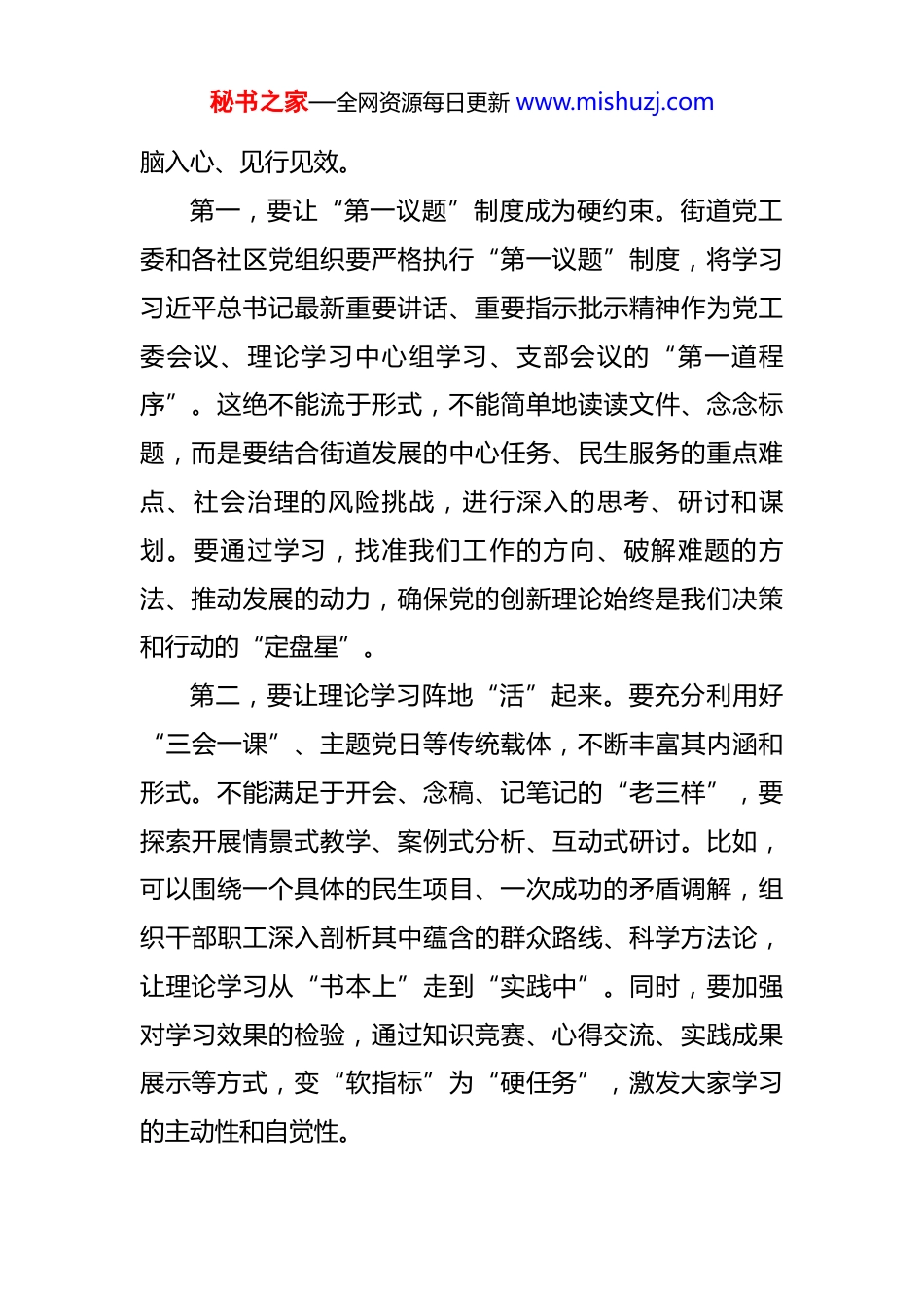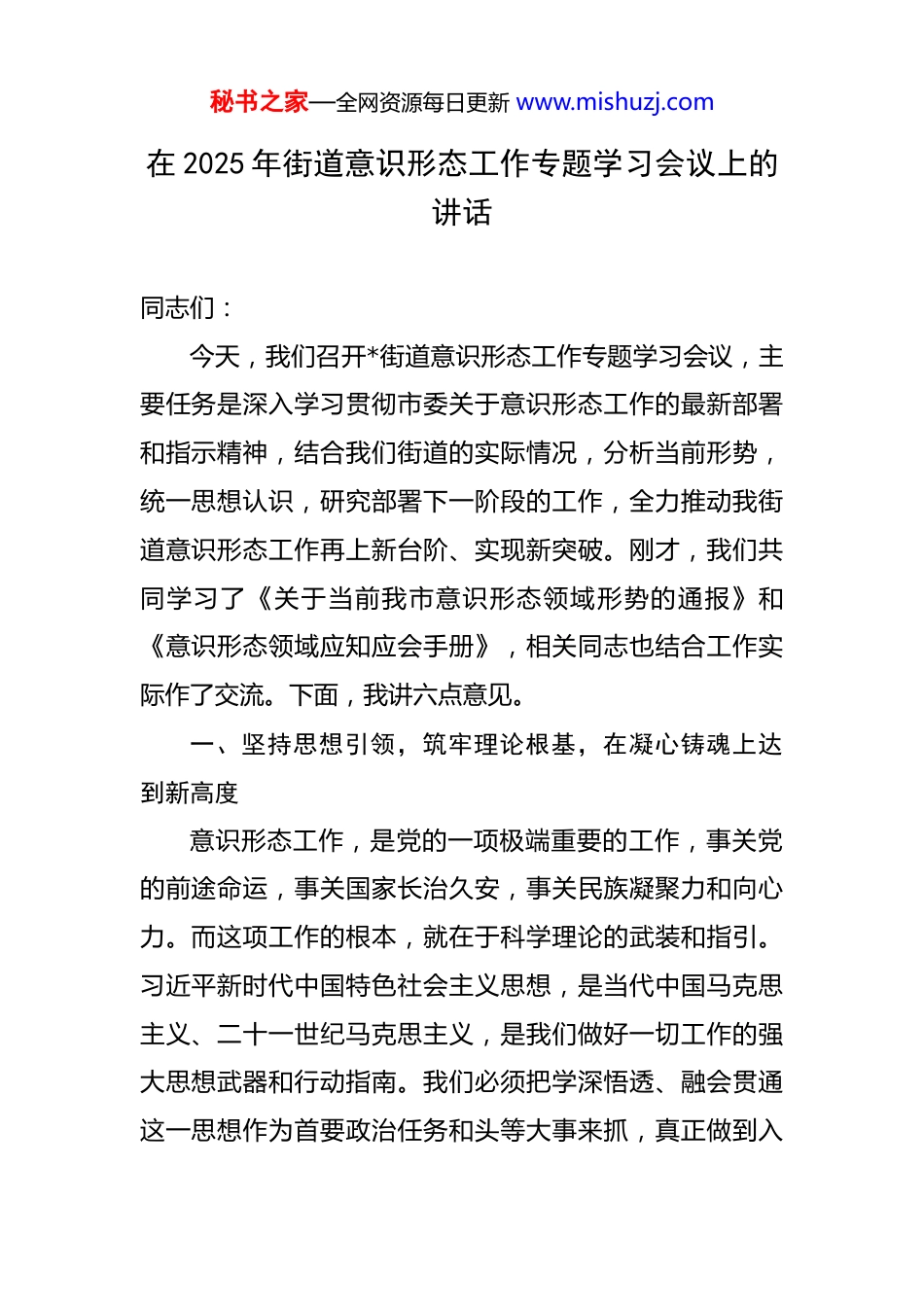 秘书之家—全网资源每日更新 www.mishuzj.com在 2025 年街道意识形态工作专题学习会议上的讲话 同志们:今天,我们召开*街道意识形态工作专题学习会议,主要任务是深入学习贯彻市委关于意识形态工作的最新部署和指示精神,结合我们街道的实际情况,分析当前形势,统一思想认识,研究部署下一阶段的工作,全力推动我街道意识形态工作再上新台阶、实现新突破。刚才,我们共同学习了《关于当前我市意识形态领域形势的通报》和《意识形态领域应知应会手册》,相关同志也结合工作实际作了交流。下面,我讲六点意见。一、坚持思想引领,筑牢理论根基,在凝心铸魂上达到新高度意识形态工作,是党的一项极端重要的工作,事关党的前途命运,事关国家长治久安,事关民族凝聚力和向心力。而这项工作的根本,就在于科学理论的武装和指引。习近平新时代中国特色社会主义思想,是当代中国马克思主义、二十一世纪马克思主义,是我们做好一切工作的强大思想武器和行动指南。我们必须把学深悟透、融会贯通这一思想作为首要政治任务和头等大事来抓,真正做到入秘书之家—全网资源每日更新 www.mishuzj.com脑入心、见行见效。第一,要让“第一议题”制度成为硬约束。街道党工委和各社区党组织要严格执行“第一议题”制度,将学习习近平总书记最新重要讲话、重要指示批示精神作为党工委会议、理论学习中心组学习、支部会议的“第一道程序”。这绝不能流于形式,不能简单地读读文件、念念标题,而是要结合街道发展的中心任务、民生服务的重点难点、社会治理的风险挑战,进行深入的思考、研讨和谋划。要通过学习,找准我们工作的方向、破解难题的方法、推动发展的动力,确保党的创新理论始终是我们决策和行动的“定盘星”。第二,要让理论学习阵地“活”起来。要充分利用好“三会一课”、主题党日等传统载体,不断丰富其内涵和形式。不能满足于开会、念稿、记笔记的“老三样”,要探索开展情景式教学、案例式分析、互动式研讨。比如,可以围绕一个具体的民生项目、一次成功的矛盾调解,组织干部职工深入剖析其中蕴含的群众路线、科学方法论,让理论学习从“书本上”走到“实践中”。同时,要加强对学习效果的检验,通过知识竞赛、心得交流、实践成果展示等方式,变“软指标”为“硬任务”,激发大家学习的主动性和自觉性。秘书之家—全网资源每日更新 www.mishuzj.com第三,要让理论宣讲“飞入寻常百姓家”。理论的价值在于指导实践,理论的生命力在于被群众掌握。我们要持续推动理论宣讲的分众化、精准化、通俗化。要组建一支由领导干部、社区书记、先进典型、退休老党员等组成的多元化宣讲队伍,针对不同群体的特点和需求,用“家常话”讲“大道理”,用“小故事”说“大格局”。可以结合社区文化活动、邻里节、居民议事会等契机,把宣讲台搬到居民广场、楼宇院落,让党的理论政策在潜移默化中融入群众的日常生活,成为引导群众、服务群众、凝聚群众的强大力量。二、深化团结教育,铸牢中华民族共同体意识,在民族工作上展现新作为我们*街道是一个多民族聚居的大家庭,做好民族工作、铸牢中华民族共同体意识,是我们意识形态工作的重要组成部分,也是维护社会和谐稳定的基石。习近平总书记关于加强和改进民族工作的重要思想,为我们指明了前进方向,提供了根本遵循。我们必须将其全面、准确、深入地贯彻到街道工作的各方面和全过程。要持续深化宣传教育的广度和深度。要将铸牢中华民族共同体意识这条主线,贯穿于社区宣传栏、电子显示屏、微信公众号等所有宣传阵地,营造“中华民族一家秘书之家—全网资源每日更新 www.mishuzj.com亲,同心共筑中国梦”的浓厚氛围。要常态化、制度化地组织干部群众学习党的民族理论政策和相关法律法规,引导大家深刻理解“五个认同”,明白“三个离不开”的道理,让民族团结的种子在每个人心中生根发芽。要不断创新民族团结进步创建活动的载体和形式。我们过去开展的“五个一群众工作法”“石榴籽同心筑梦”“三学一带一创”等系列活动,取得了很好的效果,形成了我们街道的特色品牌。下一步,要在此基础上进行提炼、升级和拓展。比如,“石榴籽同心筑梦”活动,...