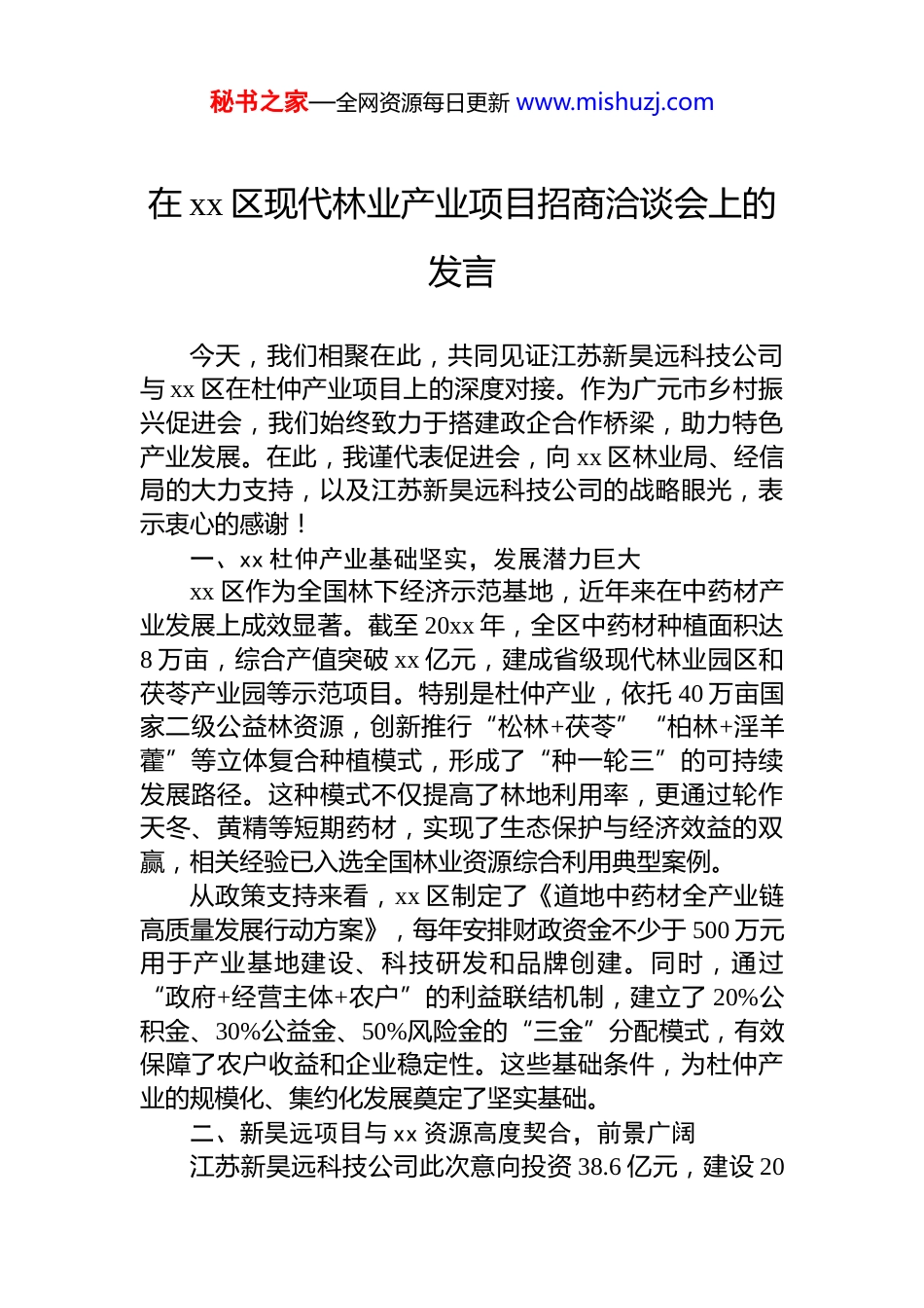 秘书之家—全网资源每日更新 www.mishuzj.com在 xx 区现代林业产业项目招商洽谈会上的发言今天,我们相聚在此,共同见证江苏新昊远科技公司与 xx 区在杜仲产业项目上的深度对接。作为广元市乡村振兴促进会,我们始终致力于搭建政企合作桥梁,助力特色产业发展。在此,我谨代表促进会,向 xx 区林业局、经信局的大力支持,以及江苏新昊远科技公司的战略眼光,表示衷心的感谢!一、xx 杜仲产业基础坚实,发展潜力巨大xx 区作为全国林下经济示范基地,近年来在中药材产业发展上成效显著。截至 20xx 年,全区中药材种植面积达8 万亩,综合产值突破 xx 亿元,建成省级现代林业园区和茯苓产业园等示范项目。特别是杜仲产业,依托 40 万亩国家二级公益林资源,创新推行“松林+茯苓”“柏林+淫羊藿”等立体复合种植模式,形成了“种一轮三”的可持续发展路径。这种模式不仅提高了林地利用率,更通过轮作天冬、黄精等短期药材,实现了生态保护与经济效益的双赢,相关经验已入选全国林业资源综合利用典型案例。从政策支持来看,xx 区制定了《道地中药材全产业链高质量发展行动方案》,每年安排财政资金不少于 500 万元用于产业基地建设、科技研发和品牌创建。同时,通过“政府+经营主体+农户”的利益联结机制,建立了 20%公积金、30%公益金、50%风险金的“三金”分配模式,有效保障了农户收益和企业稳定性。这些基础条件,为杜仲产业的规模化、集约化发展奠定了坚实基础。二、新昊远项目与 xx 资源高度契合,前景广阔江苏新昊远科技公司此次意向投资 38.6 亿元,建设 20秘书之家—全网资源每日更新 www.mishuzj.com万亩杜仲种植基地及配套加工产业园,这一规划与 xx 区的产业定位高度契合。从产业布局看,项目涵盖“种植-加工-文旅”全链条,与 xx 区打造“森林粮库”和生态产品价值实现机制的目标不谋而合。特别是 800 亩建设用地中,二产加工业可延伸杜仲叶茶、杜仲胶、杜仲籽油等精深加工产品,三产服务配套可结合 xx 古城、柏林古镇等文旅资源,打造杜仲康养体验基地,形成“药旅融合”新业态。从经济效益看,项目预计实现税收 3 亿元、解决就业8000 余人,这将极大增强 xx 区的产业竞争力和群众获得感。值得关注的是,杜仲叶已被纳入国家药食同源目录,其绿原酸、黄酮类等活性成分具有降三高、抗氧化等功效,市场需求持续增长。新昊远在山西、四川等地的杜仲项目实践表明,通过“公司+合作社+农户”模式,可带动户均年增收 1.5 万元以上,真正实现“一片叶子富一方百姓”。三、促进会将全力服务,推动项目落地见效作为乡村振兴的重要力量,促进会将充分发挥资源整合优势,为项目提供全方位支持:1.政策对接与资源整合我们将协助企业对接国储林项目、乡村振兴衔接资金等政策红利。例如,xx 区对中药材加工企业给予设备购置补贴和贷款贴息,对流转土地 1000 亩以上的经营主体最高奖励 10 万元。同时,促进会已与成都中医药大学、浙江省林科院等科研机构建立合作,可引入淫羊藿仿野生栽培、茯苓大棚种植等先进技术,提升种植效益。2.利益联结机制优化借鉴 xx 区“订单生产+保底收购”“租金+股金+薪金”等成熟模式,我们将推动企业与村集体、农户签订三方协议,明确保底分红比例和二次返利机制。例如,可参考黎生农业“4411”集体收益分配模式,将 40%收益用于农户分红,40%作为发展基金,确保群众长期受益。3.全链条服务保障秘书之家—全网资源每日更新 www.mishuzj.com在用地审批方面,我们将协助企业按照“立项-规划-协议签订-用地申请”流程,加快 20 万亩林地流转和 800 亩建设用地报批。同时,依托促进会与中应建新能源合作的“驭风行动”经验,探索“杜仲种植+光伏+旅游”的复合开发模式,进一步提升土地附加值。四、携手共进,共创杜仲产业新标杆杜仲产业是生态价值转化的典型代表,更是乡村振兴的重要抓手。xx 区有良好的资源禀赋和政策环境,新昊远公司有雄厚的资金实力和产业经验,促进会将发挥桥梁纽带作用,推动各方形成“政府引导、企业主导、群众参与”的发展合力。我们相信,通过三方深度合作,一定能将 xx 区打造成西南地区杜仲产业核心示范区,为全国提供“生态优先、绿色发展”的广元样本!