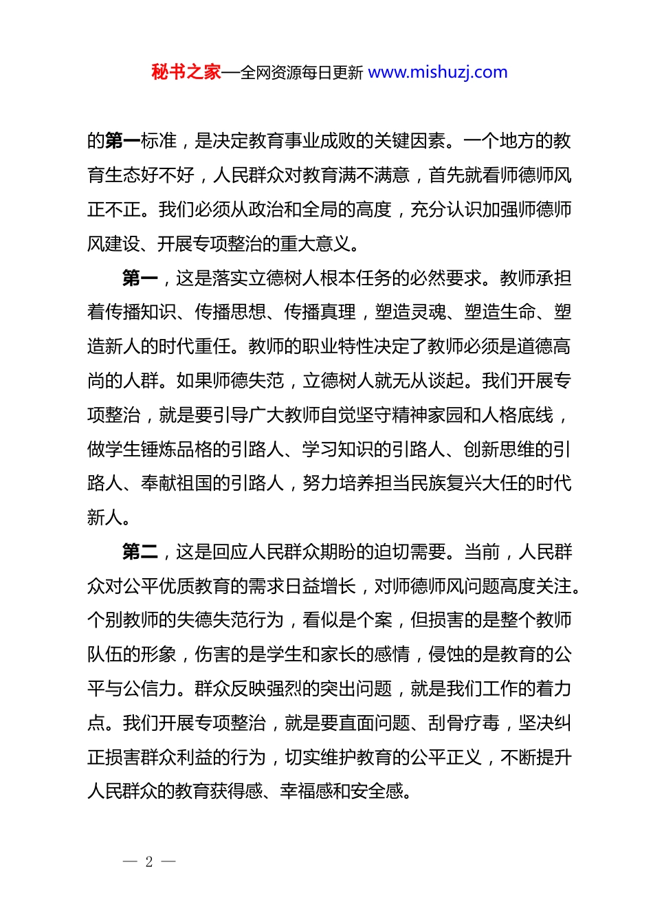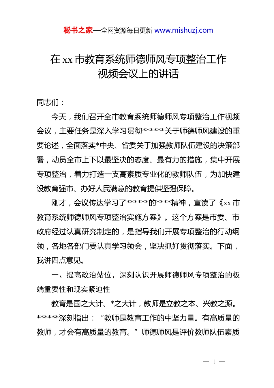 秘书之家—全网资源每日更新 www.mishuzj.com在 xx 市教育系统师德师风专项整治工作视频会议上的讲话同志们:今天,我们召开全市教育系统师德师风专项整治工作视频会议,主要任务是深入学习贯彻******关于师德师风建设的重要论述,全面落实*中央、省委关于加强教师队伍建设的决策部署,动员全市上下以最坚决的态度、最有力的措施,集中开展专项整治,着力打造一支高素质专业化的教师队伍,为加快建设教育强市、办好人民满意的教育提供坚强保障。刚才,会议传达学习了******的****精神,宣读了《xx 市教育系统师德师风专项整治实施方案》。这个方案是市委、市政府经过认真研究制定的,是指导我们开展专项整治的行动纲领,各地各部门要认真学习领会,坚决抓好贯彻落实。下面,我讲四点意见。一、提高政治站位,深刻认识开展师德师风专项整治的极端重要性和现实紧迫性教育是国之大计、*之大计,教师是立教之本、兴教之源。******深刻指出:“教师是教育工作的中坚力量。有高质量的教师,才会有高质量的教育。”师德师风是评价教师队伍素质— 1 —秘书之家—全网资源每日更新 www.mishuzj.com的第一标准,是决定教育事业成败的关键因素。一个地方的教育生态好不好,人民群众对教育满不满意,首先就看师德师风正不正。我们必须从政治和全局的高度,充分认识加强师德师风建设、开展专项整治的重大意义。第一,这是落实立德树人根本任务的必然要求。教师承担着传播知识、传播思想、传播真理,塑造灵魂、塑造生命、塑造新人的时代重任。教师的职业特性决定了教师必须是道德高尚的人群。如果师德失范,立德树人就无从谈起。我们开展专项整治,就是要引导广大教师自觉坚守精神家园和人格底线,做学生锤炼品格的引路人、学习知识的引路人、创新思维的引路人、奉献祖国的引路人,努力培养担当民族复兴大任的时代新人。第二,这是回应人民群众期盼的迫切需要。当前,人民群众对公平优质教育的需求日益增长,对师德师风问题高度关注。个别教师的失德失范行为,看似是个案,但损害的是整个教师队伍的形象,伤害的是学生和家长的感情,侵蚀的是教育的公平与公信力。群众反映强烈的突出问题,就是我们工作的着力点。我们开展专项整治,就是要直面问题、刮骨疗毒,坚决纠正损害群众利益的行为,切实维护教育的公平正义,不断提升人民群众的教育获得感、幸福感和安全感。— 2 —秘书之家—全网资源每日更新 www.mishuzj.com第三,这是推动教育高质量发展的关键之举。教育高质量发展的核心是人的高质量发展,首先是教师队伍的高质量发展。一支师德高尚、业务精湛的教师队伍,是教育质量最可靠的保障。反之,如果师德师风出现滑坡,教学水平再高也偏离了教育的正轨。我们开展专项整治,就是要旗帜鲜明地树立德才兼备、以德为先的导向,营造风清气正的育人环境,激发教师队伍的内生动力,为全市教育事业高质量发展注入源源不断的正能量。全市上下必须把思想和行动统一到市委、市政府的决策部署上来,切实增强抓好专项整治工作的责任感、使命感和紧迫感,以高度的政治自觉和行动自觉,把这项事关全局、事关长远的工作抓紧抓实抓出成效。二、正视突出问题,准确把握当前师德师风领域存在的风险与挑战长期以来,我市广大教师教书育人、爱岗敬业、无私奉献,为全市教育事业发展作出了重要贡献,主流是好的。但我们也要清醒地看到,受各种因素影响,师德师风领域还存在一些不容忽视的突出问题,必须引起我们高度重视。根据调研和日常掌握的情况,当前个别教师身上不同程度存在着“六化”现象:一是敬业之心退化。有的教师事业心不强,把教书育人当— 3 —秘书之家—全网资源每日更新 www.mishuzj.com作谋生手段,缺乏对教育事业的执着追求和热爱,工作敷衍了事,教学态度不端正,课前不备课、课上随意讲、课后不辅导,满足于“过得去”,不求过得硬。二是奉献之心弱化。有的教师功利思想严重,过分强调个人得失,计较物质待遇,缺乏奉献精神。对工作任务挑肥拣瘦,不愿承担额外工作,对学困生缺乏耐心和关爱,甚至歧视、排斥学生。三是诚信之心淡化。有的教师在学术上弄虚作假,抄袭剽窃他人成果...