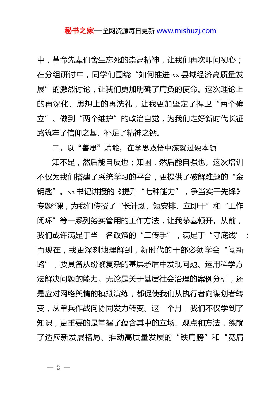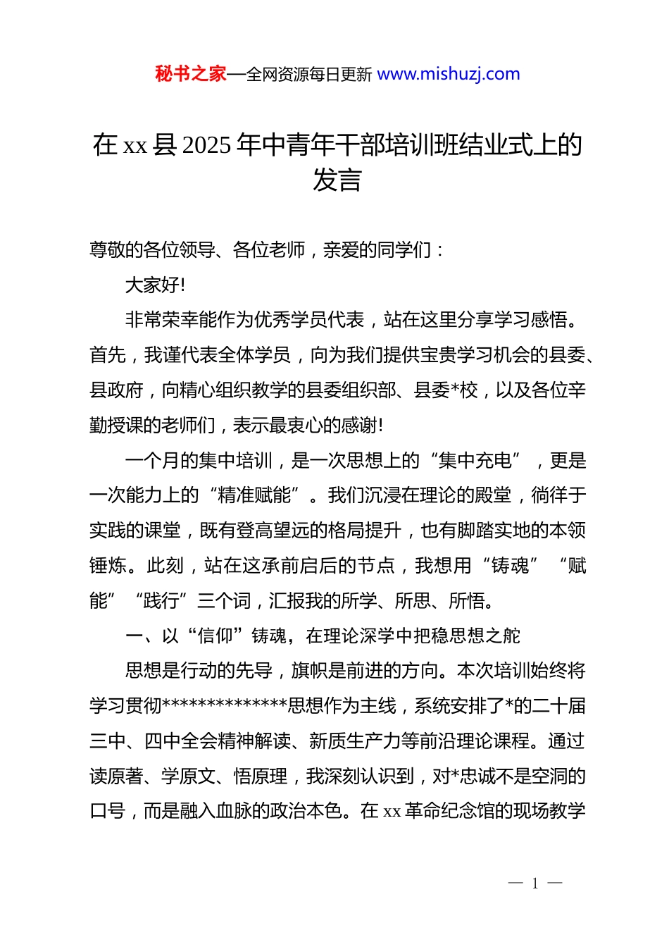 秘书之家—全网资源每日更新 www.mishuzj.com在 xx 县 2025 年中青年干部培训班结业式上的发言尊敬的各位领导、各位老师,亲爱的同学们:大家好!非常荣幸能作为优秀学员代表,站在这里分享学习感悟。首先,我谨代表全体学员,向为我们提供宝贵学习机会的县委、县政府,向精心组织教学的县委组织部、县委*校,以及各位辛勤授课的老师们,表示最衷心的感谢!一个月的集中培训,是一次思想上的“集中充电”,更是一次能力上的“精准赋能”。我们沉浸在理论的殿堂,徜徉于实践的课堂,既有登高望远的格局提升,也有脚踏实地的本领锤炼。此刻,站在这承前启后的节点,我想用“铸魂”“赋能”“践行”三个词,汇报我的所学、所思、所悟。一、以“信仰”铸魂,在理论深学中把稳思想之舵思想是行动的先导,旗帜是前进的方向。本次培训始终将学习贯彻**************思想作为主线,系统安排了*的二十届三中、四中全会精神解读、新质生产力等前沿理论课程。通过读原著、学原文、悟原理,我深刻认识到,对*忠诚不是空洞的口号,而是融入血脉的政治本色。在 xx 革命纪念馆的现场教学— 1 —秘书之家—全网资源每日更新 www.mishuzj.com中,革命先辈们舍生忘死的崇高精神,让我们再次叩问初心;在分组研讨中,同学们围绕“如何推进 xx 县域经济高质量发展”的激烈讨论,让我们更加明确了肩负的使命。这次理论上的再深化、思想上的再洗礼,让我更加坚定了捍卫“两个确立”、做到“两个维护”的政治自觉,为我们走好新时代长征路筑牢了信仰之基、补足了精神之钙。二、以“善思”赋能,在学思践悟中练就过硬本领知不足,然后能自反也;知困,然后能自强也。这次培训不仅为我们搭建了系统学习的平台,更提供了破解难题的“金钥匙”。xx 书记讲授的《提升“七种能力”,争当实干先锋》专题*课,为我们传授了“长计划、短安排、立即干”和“工作闭环”等一系列务实管用的工作方法,让我茅塞顿开。从前,我们或许满足于当一名政策的“二传手”,满足于“守底线”;而现在,我更深刻地理解到,新时代的干部必须学会“闯新路”,要具备从纷繁复杂的基层矛盾中发现问题、运用科学方法解决问题的能力。无论是关于基层社会治理的案例分析,还是应对网络舆情的模拟演练,都促使我们从执行者向谋划者转变,从单兵作战向协同发力转变。这一个月,我们不仅学到了知识,更重要的是掌握了蕴含其中的立场、观点和方法,练就了适应新发展格局、推动高质量发展的“铁肩膀”和“宽肩— 2 —秘书之家—全网资源每日更新 www.mishuzj.com膀”。三、以“笃行”践诺,在实干担当中服务发展大局道虽迩,不行不至;事虽小,不为不成。学习的最终目的是为了更好地实践。当前,我县正处在推动高质量发展的关键时期,预计全年地区生产总值将力争实现 7.0%的增长,一般公共预算收入稳步提升。这滚烫的数据背后,是我们每一名干部沉甸甸的责任。回到工作岗位后,我将把这次培训的丰硕成果,迅速转化为推动工作的强大动力。一是投身经济发展主战场。我将立足本职岗位,围绕我县打造区域先进制造业基地的目标,积极服务项目建设和企业发展,在优化营商环境、推动产业升级中展现新作为。二是深耕乡村振兴第一线。我将带着感情、带着责任深入田间地头,积极探索“农业+电商”“文化+旅游”等新业态,推动农村人居环境整治从“一时清洁”向“长效美丽”转变,让群众的获得感、幸福感成色更足。三是坚守为民服务最前沿。我将始终把群众的安危冷暖放在心上,聚焦教育、医疗、养老等民生实事,用心用情用力解决好群众的急难愁盼问题,以实际行动践行“人民公仆”的铮铮誓言。各位同学,辉光暂敛处,征途奋起时。结业不是终点,而— 3 —秘书之家—全网资源每日更新 www.mishuzj.com是我们践行初心、担当使命的新起点。让我们把在*校学习的收获,化为扎根 xx、建设 xx、奉献 xx 的磅礴力量,以“抢”的意识、“拼”的精神、“干”的劲头,在各自的岗位上奋勇争先、再创佳绩,为奋力谱写中国式现代化 xx 新篇章贡献我们的智慧和力量!最后,再次感谢各位领导、老师的悉心指导!感谢各位同学的关心帮助!✂— 4 —