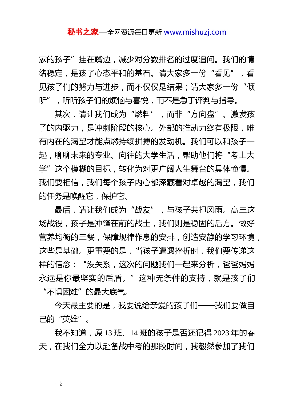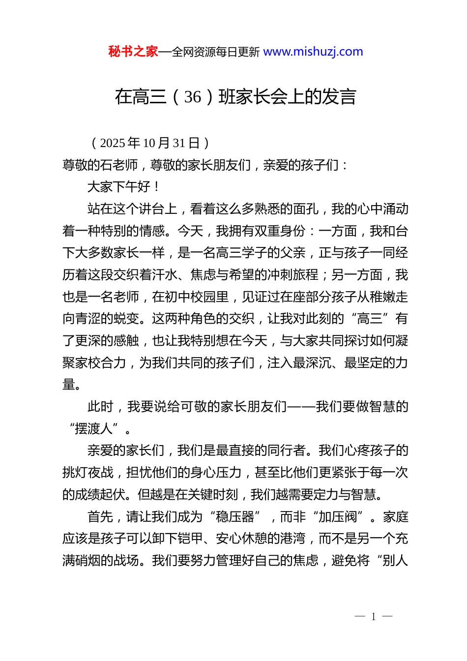 秘书之家—全网资源每日更新 www.mishuzj.com在高三(36)班家长会上的发言(2025 年 10 月 31 日)尊敬的石老师,尊敬的家长朋友们,亲爱的孩子们:大家下午好!站在这个讲台上,看着这么多熟悉的面孔,我的心中涌动着一种特别的情感。今天,我拥有双重身份:一方面,我和台下大多数家长一样,是一名高三学子的父亲,正与孩子一同经历着这段交织着汗水、焦虑与希望的冲刺旅程;另一方面,我也是一名老师,在初中校园里,见证过在座部分孩子从稚嫩走向青涩的蜕变。这两种角色的交织,让我对此刻的“高三”有了更深的感触,也让我特别想在今天,与大家共同探讨如何凝聚家校合力,为我们共同的孩子们,注入最深沉、最坚定的力量。此时,我要说给可敬的家长朋友们——我们要做智慧的“摆渡人”。亲爱的家长们,我们是最直接的同行者。我们心疼孩子的挑灯夜战,担忧他们的身心压力,甚至比他们更紧张于每一次的成绩起伏。但越是在关键时刻,我们越需要定力与智慧。首先,请让我们成为“稳压器”,而非“加压阀”。家庭应该是孩子可以卸下铠甲、安心休憩的港湾,而不是另一个充满硝烟的战场。我们要努力管理好自己的焦虑,避免将“别人— 1 —秘书之家—全网资源每日更新 www.mishuzj.com家的孩子”挂在嘴边,减少对分数排名的过度追问。我们的情绪稳定,是孩子心态平和的基石。请大家多一份“看见”,看见孩子们的努力与进步,而不仅仅是结果;请大家多一份“倾听”,听听孩子们的烦恼与喜悦,而不是急于评判与指导。其次,请让我们成为“燃料”,而非“方向盘”。激发孩子的内驱力,是冲刺阶段的核心。外部的推动力终有极限,唯有内在的渴望才能点燃持续拼搏的发动机。我们可以和孩子一起,聊聊未来的专业、向往的大学生活,帮助他们将“考上大学”这个模糊的目标,转化为对更广阔人生舞台的具体憧憬。我们要相信,我们每个孩子内心都深藏着对卓越的渴望,我们的任务是唤醒它,保护它。最后,请让我们成为“战友”,与孩子共担风雨。高三这场战役,孩子是冲锋在前的战士,我们则是稳固的后方。做好营养均衡的三餐,保障规律作息的安排,创造安静的学习环境,这些是基础。更重要的是,当孩子遭遇挫折时,我们要传递这样的信念:“没关系,这次的问题我们一起来分析,爸爸妈妈永远是你最坚实的后盾。”这种无条件的支持,就是孩子们“不惧困难”的最大底气。今天最主要的是,我要说给亲爱的孩子们——我们要做自己的“英雄”。我不知道,原 13 班、14 班的孩子是否还记得 2023 年的春天,在我们全力以赴备战中考的那段时间,我毅然参加了我们— 2 —秘书之家—全网资源每日更新 www.mishuzj.com学校举办的“迎接二十大,争做大先生”的演讲比赛,我告诉你们:你们全力备战中考,我全力备战演讲比赛。咱们约定,看谁做得好。我从 32 晋级 20,从 20 晋级 12,从 12 晋级前 8,从前 8 晋级前 4。我每晋一级,都会把消息告诉你们,因为我想让你们知道——我们都要做自己的英雄,喊破嗓子,不如做出样子。最终,我获得了演讲比赛的一等奖,你们在中招考试当中也大放异彩,我们学校喜报表扬的 13 人当中,我们班占 3 人,我们班最好成绩是全区第 2 名。我们兑现了承诺,我们都成了我们自己的英雄。在座的所有孩子们,看着意气风发的你们,我由衷地为你们骄傲!今天,我想以老师和长辈的双重身份,对你们说几句心里话。第一,孩子们,请点燃你心中的“那团烈火”。学习最终是你自己的事情。高考,不是为父母、为老师,而是为你自己搭建一个更高、更广阔的人生平台。去想象一下,在大学里,你可以尽情探索自己感兴趣的领域,可以结识来自天南地北的优秀同伴,可以拥有选择自己人生方向的更大主动权。这份对未来的期待,应该成为你此刻拼搏最原始、最强大的内驱力。从“要我学”变为“我要学”,你会发现,每一个知识点的掌握,每一次能力的提升,都充满了成就感。这份源自内心的动力,将比任何外部的督促都更持久、更有力。你也会发现,所有的辛苦都充满了意义。真正的学习,从来不是被动地完成任— 3 —秘书之家—全网资源每日更新 www.mishuzj.com务,...