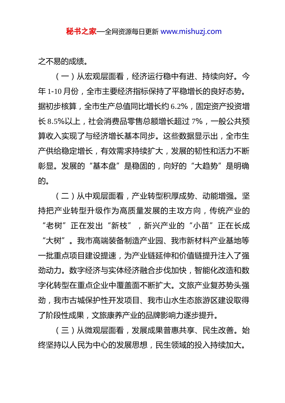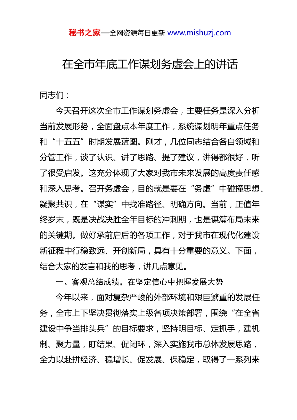 秘书之家—全网资源每日更新 www.mishuzj.com在全市年底工作谋划务虚会上的讲话 同志们:今天召开这次全市工作谋划务虚会,主要任务是深入分析当前发展形势,全面盘点本年度工作,系统谋划明年重点任务和“十五五”时期发展蓝图。刚才,几位同志结合各自领域和分管工作,谈了认识、讲了思路、提了建议,讲得都很好,听了很受启发。这充分体现了大家对我市未来发展的高度责任感和深入思考。召开务虚会,目的就是要在“务虚”中碰撞思想、凝聚共识,在“谋实”中找准路径、明确方向。当前,正值年终岁末,既是决战决胜全年目标的冲刺期,也是谋篇布局未来的关键期。做好承前启后的各项工作,对于我市在现代化建设新征程中行稳致远、开创新局,具有十分重要的意义。下面,结合大家的发言和我的思考,讲几点意见。一、客观总结成绩,在坚定信心中把握发展大势今年以来,面对复杂严峻的外部环境和艰巨繁重的发展任务,全市上下坚决贯彻落实上级各项决策部署,围绕“在全省建设中争当排头兵”的目标要求,坚持明目标、定抓手,建机制、聚力量,盯结果、促闭环,深入实施我市总体发展思路,全力以赴拼经济、稳增长、促发展、保稳定,取得了一系列来秘书之家—全网资源每日更新 www.mishuzj.com之不易的成绩。(一)从宏观层面看,经济运行稳中有进、持续向好。今年 1-10 月份,全市主要经济指标保持了平稳增长的良好态势。据初步核算,全市生产总值同比增长约 6.2%,固定资产投资增长 8.5%以上,社会消费品零售总额增长超过 7%,一般公共预算收入实现了与经济增长基本同步。这些数据显示出,全市生产供给稳定增长,有效需求持续扩大,发展的韧性和活力不断彰显。发展的“基本盘”是稳固的,向好的“大趋势”是明确的。(二)从中观层面看,产业转型积厚成势、动能增强。坚持把产业转型升级作为高质量发展的主攻方向,传统产业的“老树”正在发出“新枝”,新兴产业的“小苗”正在长成“大树”。我市高端装备制造产业园、我市新材料产业基地等一批重点项目建设提速,为产业链延伸和价值链提升注入了强劲动力。数字经济与实体经济融合步伐加快,智能化改造和数字化转型在重点企业中覆盖面不断扩大。文旅产业复苏势头强劲,我市古城保护性开发项目、我市山水生态旅游区建设取得了阶段性成果,文旅康养产业的品牌影响力逐步提升。(三)从微观层面看,发展成果普惠共享、民生改善。始终坚持以人民为中心的发展思想,民生领域的投入持续加大。秘书之家—全网资源每日更新 www.mishuzj.com城镇新增就业、城乡居民收入增长等指标均超额完成序时进度。教育、医疗、养老等公共服务体系不断完善,老旧小区改造、城市更新行动扎实推进,城乡人居环境得到显著改善。平安我市、法治我市建设深入推进,社会大局保持和谐稳定,人民群众的获得感、幸福感、安全感在具体而微的实事中得到了切实增强。这些成绩的取得,是上级党委、政府坚强领导的结果,是全市各级党组织和广大干部群众团结奋斗、顽强拼搏的结果。实践证明,只要方向正确、方法得当、干劲充足,就一定能够战胜前进道路上的一切艰难险阻,不断开创我市高质量发展的新局面。在肯定成绩的同时,也必须清醒地看到存在的短板和不足。比如,经济总量和发展质量仍有待提升;产业结构性矛盾依然突出,新旧动能转换还需加力;科技创新对发展的支撑能力尚显不足;营商环境与先进地区相比仍有差距;部分干部担当作为、攻坚克难的能力作风仍需锤炼。对于这些问题,必须高度重视,并在今后的工作中采取有力措施,切实加以解决。二、运用科学方法,在统筹谋划中厘清发展路径谋定而后动,方能行稳致远。谋划未来一个时期的发展,不仅要有宽广的视野和前瞻的思考,更要掌握科学的思想方法和工作方法。这既是认识论,也是方法论。具体而言,要处理秘书之家—全网资源每日更新 www.mishuzj.com好几个关系。(一)要处理好“宏观”与“微观”的关系,强化系统思维抓统筹。“不谋全局者,不足谋一域。”谋划工作必须胸怀“国之大者”,自觉将我市的发展置于国家和省域发展的战略全局中考量。要向上看,主动对标对表中央大政方针和省委、我市委的战略部署...