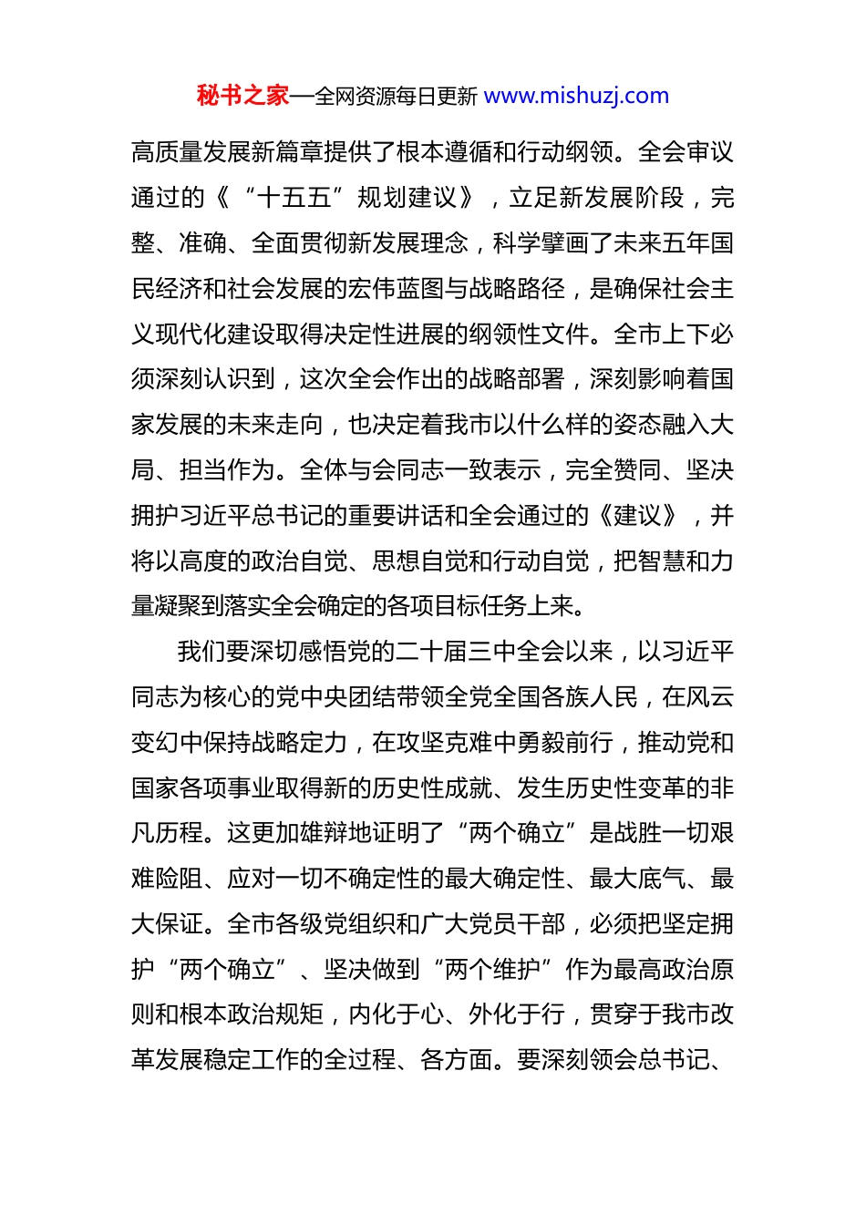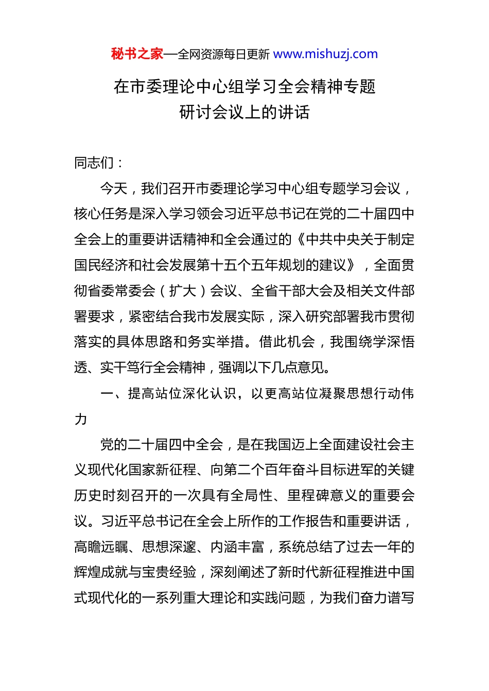秘书之家—全网资源每日更新 www.mishuzj.com在市委理论中心组学习全会精神专题研讨会议上的讲话 同志们:今天,我们召开市委理论学习中心组专题学习会议,核心任务是深入学习领会习近平总书记在党的二十届四中全会上的重要讲话精神和全会通过的《中共中央关于制定国民经济和社会发展第十五个五年规划的建议》,全面贯彻省委常委会(扩大)会议、全省干部大会及相关文件部署要求,紧密结合我市发展实际,深入研究部署我市贯彻落实的具体思路和务实举措。借此机会,我围绕学深悟透、实干笃行全会精神,强调以下几点意见。一、提高站位深化认识,以更高站位凝聚思想行动伟力党的二十届四中全会,是在我国迈上全面建设社会主义现代化国家新征程、向第二个百年奋斗目标进军的关键历史时刻召开的一次具有全局性、里程碑意义的重要会议。习近平总书记在全会上所作的工作报告和重要讲话,高瞻远瞩、思想深邃、内涵丰富,系统总结了过去一年的辉煌成就与宝贵经验,深刻阐述了新时代新征程推进中国式现代化的一系列重大理论和实践问题,为我们奋力谱写秘书之家—全网资源每日更新 www.mishuzj.com高质量发展新篇章提供了根本遵循和行动纲领。全会审议通过的《“十五五”规划建议》,立足新发展阶段,完整、准确、全面贯彻新发展理念,科学擘画了未来五年国民经济和社会发展的宏伟蓝图与战略路径,是确保社会主义现代化建设取得决定性进展的纲领性文件。全市上下必须深刻认识到,这次全会作出的战略部署,深刻影响着国家发展的未来走向,也决定着我市以什么样的姿态融入大局、担当作为。全体与会同志一致表示,完全赞同、坚决拥护习近平总书记的重要讲话和全会通过的《建议》,并将以高度的政治自觉、思想自觉和行动自觉,把智慧和力量凝聚到落实全会确定的各项目标任务上来。我们要深切感悟党的二十届三中全会以来,以习近平同志为核心的党中央团结带领全党全国各族人民,在风云变幻中保持战略定力,在攻坚克难中勇毅前行,推动党和国家各项事业取得新的历史性成就、发生历史性变革的非凡历程。这更加雄辩地证明了“两个确立”是战胜一切艰难险阻、应对一切不确定性的最大确定性、最大底气、最大保证。全市各级党组织和广大党员干部,必须把坚定拥护“两个确立”、坚决做到“两个维护”作为最高政治原则和根本政治规矩,内化于心、外化于行,贯穿于我市改革发展稳定工作的全过程、各方面。要深刻领会总书记、秘书之家—全网资源每日更新 www.mishuzj.com党中央关于“十五五”时期的顶层设计、战略考量与历史洞察,精准把握我市在“十五五”发展全局中所处的历史方位——作为东部地区重要中心城市、长三角特大城市、省会,我市肩负着“争当表率、争做示范、走在前列”的光荣使命。我们必须清醒认识国内外环境的深刻复杂变化带来的机遇与挑战,深刻理解“十五五”时期发展的指导方针、奋进的主要目标和推进的战略任务。要以强烈的历史主动精神和“时时放心不下”的责任感,科学研判我市的优势潜力与短板弱项,以前瞻视野和务实举措,精心谋划好我市未来五年的发展思路、目标任务和重大抓手,着力在锻长板、扬优势,补短板、强弱项,增动能、激活力上下功夫,奋力在全省全国现代化建设中展现我市更强担当、更大作为。二、聚焦关键精准发力,以实绩实效谱写现代化建设新篇贯彻落实党的二十届四中全会精神,核心在于将宏伟蓝图转化为我市大地的生动实践。我们必须紧密结合我市资源禀赋和阶段特征,科学谋划“十五五”时期重点工作,聚力在以下七个关键领域夯实基础、全面发力,努力把“强富美高”新我市建设推向更高水平,为在推进中国式现代化中走在前、做示范贡献核心支撑力量。秘书之家—全网资源每日更新 www.mishuzj.com(一)聚焦“创新驱动,锻造硬核支撑”,在发展新质生产力上夯实基础、全面发力。 立足我市科教人才资源富集的独特优势,坚定不移走创新引领发展之路。强化国家战略科技力量部署,全力服务保障紫金山实验室、未来网络试验设施等“国之重器”产出更多原创性、引领性成果。突出企业科技创新主体地位,完善“科技型中小企业-高新技术企业-瞪羚独角兽企业”梯度培育机制...