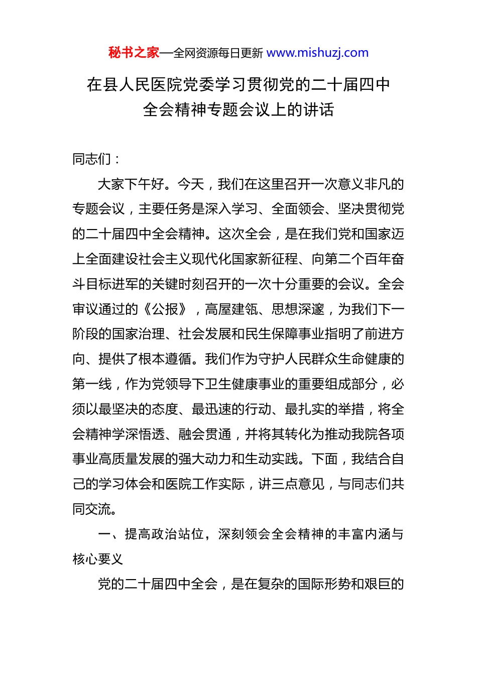 秘书之家—全网资源每日更新 www.mishuzj.com在县人民医院党委学习贯彻党的二十届四中全会精神专题会议上的讲话 同志们:大家下午好。今天,我们在这里召开一次意义非凡的专题会议,主要任务是深入学习、全面领会、坚决贯彻党的二十届四中全会精神。这次全会,是在我们党和国家迈上全面建设社会主义现代化国家新征程、向第二个百年奋斗目标进军的关键时刻召开的一次十分重要的会议。全会审议通过的《公报》,高屋建瓴、思想深邃,为我们下一阶段的国家治理、社会发展和民生保障事业指明了前进方向、提供了根本遵循。我们作为守护人民群众生命健康的第一线,作为党领导下卫生健康事业的重要组成部分,必须以最坚决的态度、最迅速的行动、最扎实的举措,将全会精神学深悟透、融会贯通,并将其转化为推动我院各项事业高质量发展的强大动力和生动实践。下面,我结合自己的学习体会和医院工作实际,讲三点意见,与同志们共同交流。一、提高政治站位,深刻领会全会精神的丰富内涵与核心要义党的二十届四中全会,是在复杂的国际形势和艰巨的秘书之家—全网资源每日更新 www.mishuzj.com国内改革发展稳定任务背景下召开的。全会公报中的每一个论断、每一项部署,都蕴含着党中央对世情国情的深刻洞察和对未来发展的战略考量。作为各党支部的书记,作为医院党建工作的“领头雁”,我们首先要做的,就是带头学、深入学,准确把握全会精神的核心要义。(一)要深刻领会“坚持和加强党的全面领导”这一根本原则。全会再次强调,中国共产党的领导是中国特色社会主义最本质的特征,是中国特色社会主义制度的最大优势。对于我们医院而言,这意味着必须毫不动摇地坚持党对公立医院的全面领导,将党的领导融入医院治理的各领域、各方面、各环节。这绝不是一句空洞的口号,而是具体的、实践的要求。它要求我们的党委要发挥好“把方向、管大局、作决策、促改革、保落实”的领导作用;要求我们在座的每一位支部书记,都要把自己的支部建设成为坚强的战斗堡垒,确保党的路线方针政策在科室、在病区、在每一位职工心中落地生根。只有坚持党的领导,我们的发展才能有正确的政治方向,我们的改革才能行稳致远,我们的事业才能始终保持为人民服务的纯洁底色。(二)要深刻领会“以人民为中心”这一根本立场。全会通篇贯穿着以人民为中心的发展思想,强调要不断实现好、维护好、发展好最广大人民根本利益。医疗卫生事秘书之家—全网资源每日更新 www.mishuzj.com业,是与人民群众关系最直接、最密切的民生事业。人民群众的健康需求,就是我们奋斗的目标。全会精神要求我们必须将“以人民健康为中心”的理念,从思想自觉提升到行动自觉。这体现在我们的日常工作中,就是要思考如何让群众看病更方便、更舒心、更放心;就是要思考如何持续提升医疗技术水平,让老百姓在家门口就能享受到优质的医疗服务;就是要思考如何优化服务流程,减少患者的等待时间与焦虑情绪。这是我们的职责所在,也是我们践行初心使命的最好体现。(三)要深刻领会“推进国家治理体系和治理能力现代化”这一核心任务。全会对于完善国家治理体系作出了系统部署,这同样为我们公立医院的现代医院管理制度建设提供了行动指南。我们要清醒地认识到,现代医院管理已经从过去的粗放式管理,转向了精细化、科学化、信息化的治理模式。这要求我们必须不断完善内部治理结构,健全决策、执行、监督相互协调、相互制衡的运行机制。同时,要着力提升运用法治思维和法治方式深化改革、推动发展、化解矛盾、应对风险的能力。无论是医疗质量安全管理、绩效考核分配,还是人才培养引进、学科建设规划,都必须在制度的轨道上运行,用科学的治理效能,激发医院发展的内生动力。秘书之家—全网资源每日更新 www.mishuzj.com(四)要深刻领会“发展新质生产力,推动高质量发展”这一时代要求。全会强调要以科技创新推动产业创新,加快发展新质生产力。对我们医疗行业而言,新质生产力就是先进的医疗技术、创新的服务模式、高端的医学人才和智慧化的管理系统。我们不能再满足于常规诊疗,必须紧跟医学科技前沿,积极引进和应用新技术、新项目,让科技创新成...