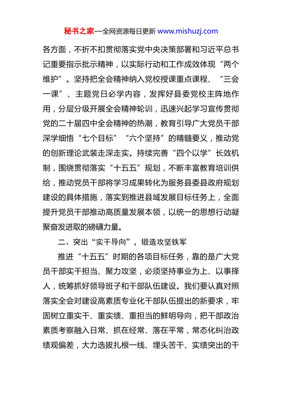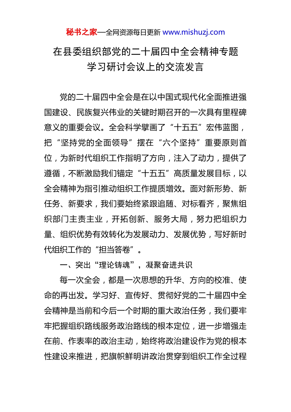 秘书之家—全网资源每日更新 www.mishuzj.com在县委组织部党的二十届四中全会精神专题学习研讨会议上的交流发言 党的二十届四中全会是在以中国式现代化全面推进强国建设、民族复兴伟业的关键时期召开的一次具有里程碑意义的重要会议。全会科学擘画了“十五五”宏伟蓝图,把“坚持党的全面领导”摆在“六个坚持”重要原则首位,为新时代组织工作指明了方向,注入了动力,提供了遵循,不断激励我们锚定“十五五”高质量发展目标,以全会精神为指引推动组织工作提质增效。面对新形势、新任务、新要求,我们要始终紧跟追随、对标看齐,聚焦组织部门主责主业,开拓创新、服务大局,努力把组织力量、组织优势有效转化为发展动力、发展优势,写好新时代组织工作的“担当答卷”。一、突出“理论铸魂”,凝聚奋进共识每一次全会,都是一次思想的升华、方向的校准、使命的再出发。学习好、宣传好、贯彻好党的二十届四中全会精神是当前和今后一个时期的重大政治任务,我们要牢牢把握组织路线服务政治路线的根本定位,进一步增强走在前、作表率的政治主动,始终将政治建设作为党的根本性建设来推进,把旗帜鲜明讲政治贯穿到组织工作全过程秘书之家—全网资源每日更新 www.mishuzj.com各方面,不折不扣贯彻落实党中央决策部署和习近平总书记重要指示批示精神,以实际行动和工作成效体现“两个维护”。坚持把全会精神纳入党校授课重点课程、“三会一课”、主题党日必学内容,发挥好县委党校主阵地作用,分层分级开展全会精神轮训,迅速兴起学习宣传贯彻党的二十届四中全会精神的热潮,教育引导广大党员干部深学细悟“七个目标”“六个坚持”的精髓要义,推动党的创新理论武装走深走实。持续完善“四个以学”长效机制,围绕贯彻落实“十五五”规划,不断丰富教育培训供给,推动党员干部将学习成果转化为服务县委县政府规划建设的具体措施,落实到推进县域发展目标任务上,全面提升党员干部推动高质量发展本领,以统一的思想行动凝聚奋发进取的磅礴力量。二、突出“实干导向”,锻造攻坚铁军推进“十五五”时期的各项目标任务,靠的是广大党员干部实干担当、聚力攻坚,必须坚持事业为上、以事择人,统筹抓好领导班子和干部队伍建设。我们要认真对照落实全会对建设高素质专业化干部队伍提出的新要求,牢固树立重实干、重实绩、重担当的鲜明导向,把干部政治素质考察融入日常、抓在经常、落在平常,常态化纠治政绩观偏差,大力选拔扎根一线、埋头苦干、实绩突出的干秘书之家—全网资源每日更新 www.mishuzj.com部。聚焦 2026 年县乡领导班子换届,将长远规划和立足当下结合起来,持续对领导班子运行质态、干部培养情况进行摸底调研,统筹考虑领导班子年龄、专业、民族、结构等因素,坚持人岗适配原则,进一步加大后备干部培养储备力度,着力增强领导班子整体功能。坚持把从严监督管理和鼓励担当作为高度统一起来,在强化干部日常监督管理,深化运用干部监督“红黄蓝”预警和联席会议机制,加强退出领导岗位干部管理,推动干部能上能下常态化的同时,认真贯彻关心关爱基层干部二十条措施,稳步有序推进职级晋升工作,建立健全容错纠错机制,激励广大干部在落实“十五五”规划、深化改革、服务群众中担当作为。三、突出“组织优势”,夯实治理根基治国必先治党,党兴才能国强,坚持和加强党的全面领导是推进中国式现代化的根本保障。我们要树牢大抓基层鲜明导向,大力实施党建引领乡村振兴示范区“三强三优三提升”三年行动,持续扩大“幸福班彦”“红色双树”等红色资源影响力,将党建深度融入打造我县“七张名片”、乡村振兴、应急抢险等重点工作中,不断擦亮“乡土先锋”名片,推动农村基层党建与乡村振兴工作融合发展取得新成效。坚持把抓好村(社区)“两委”换届秘书之家—全网资源每日更新 www.mishuzj.com工作作为进一步优化基层组织功能、巩固党的执政根基的战略契机,紧盯时间节点、优化工作流程、细化工作举措,选优配强村(社区)党组织带头人,建强推进“十五五”时期目标任务落实的基层战斗堡垒。强化党建引领赋能基层治理,加快社区党委建立,深化社区工作者职业体系化建设,加强...