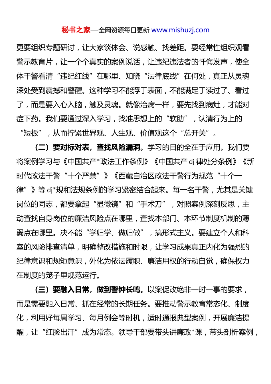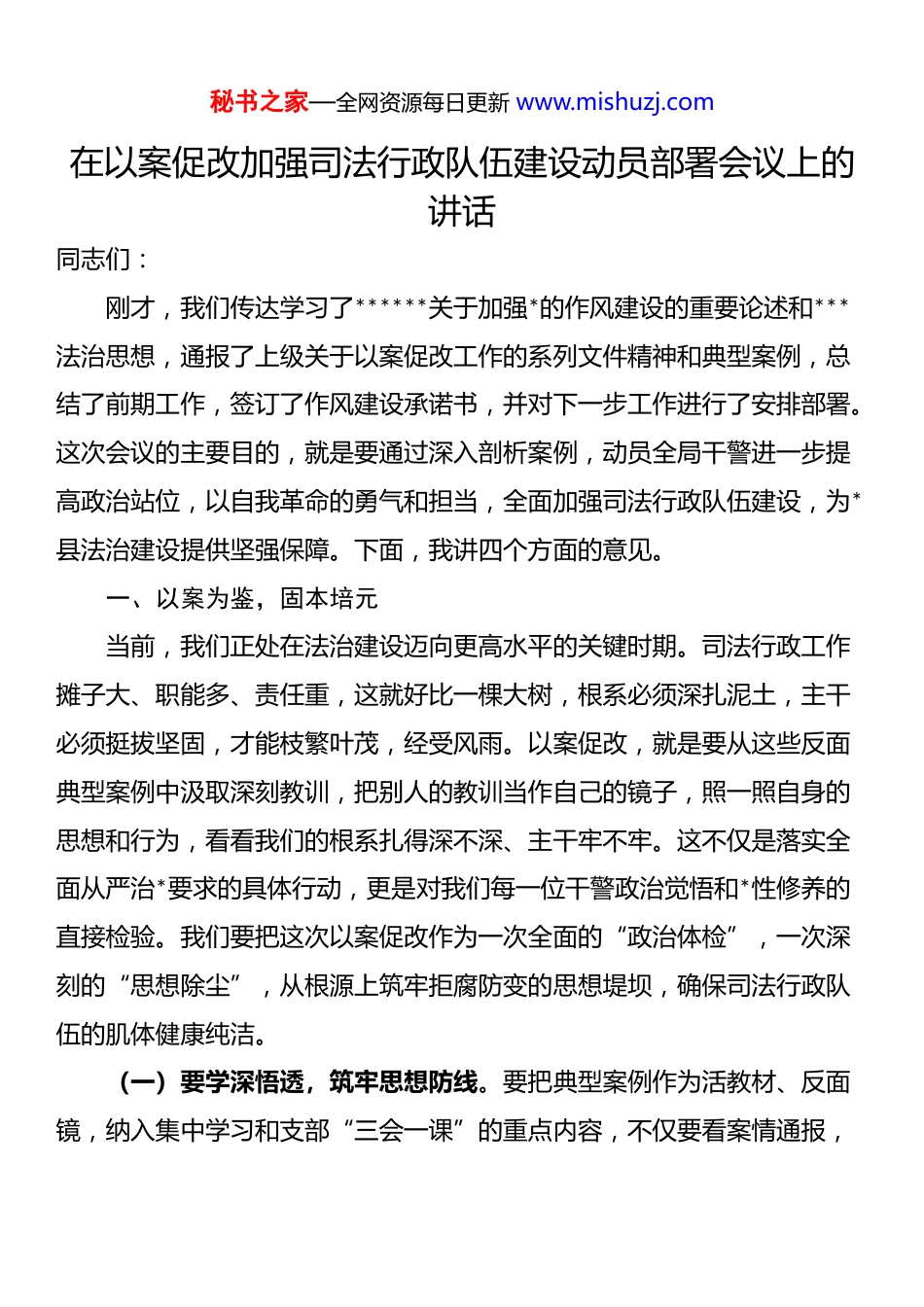 秘书之家—全网资源每日更新 www.mishuzj.com在以案促改加强司法行政队伍建设动员部署会议上的讲话同志们:刚才,我们传达学习了******关于加强*的作风建设的重要论述和***法治思想,通报了上级关于以案促改工作的系列文件精神和典型案例,总结了前期工作,签订了作风建设承诺书,并对下一步工作进行了安排部署。这次会议的主要目的,就是要通过深入剖析案例,动员全局干警进一步提高政治站位,以自我革命的勇气和担当,全面加强司法行政队伍建设,为*县法治建设提供坚强保障。下面,我讲四个方面的意见。一、以案为鉴,固本培元当前,我们正处在法治建设迈向更高水平的关键时期。司法行政工作摊子大、职能多、责任重,这就好比一棵大树,根系必须深扎泥土,主干必须挺拔坚固,才能枝繁叶茂,经受风雨。以案促改,就是要从这些反面典型案例中汲取深刻教训,把别人的教训当作自己的镜子,照一照自身的思想和行为,看看我们的根系扎得深不深、主干牢不牢。这不仅是落实全面从严治*要求的具体行动,更是对我们每一位干警政治觉悟和*性修养的直接检验。我们要把这次以案促改作为一次全面的“政治体检”,一次深刻的“思想除尘”,从根源上筑牢拒腐防变的思想堤坝,确保司法行政队伍的肌体健康纯洁。(一)要学深悟透,筑牢思想防线。要把典型案例作为活教材、反面镜,纳入集中学习和支部“三会一课”的重点内容,不仅要看案情通报,秘书之家—全网资源每日更新 www.mishuzj.com更要组织专题研讨,让大家谈体会、说感触、找差距。要经常性组织观看警示教育片,让一个个真实的案例说话,让违纪违法者的忏悔发声,使全体干警看清“违纪红线”在哪里、知晓“法律底线”在何处,真正从灵魂深处受到震撼和警醒。这种学习不能浮于表面,不能满足于读过了、看过了,而是要入心入脑,触及灵魂。就像治病一样,要先找到病灶,才能对症下药。我们要通过深入学习,找准思想上的“软肋”,认清行为上的“短板”,从而拧紧世界观、人生观、价值观这个“总开关”。(二)要对标对表,查找风险漏洞。学习的目的全在于应用。我们要将案例学习与《中国共产*政法工作条例》《中国共产 dj 律处分条例》《新时代政法干警“十个严禁”》《西藏自治区政法干警行为规范“十个一律”》等 dj*规和法规条例的学习紧密结合起来。每一名干警,尤其是关键岗位的同志,都要拿起“显微镜”和“手术刀”,对照案例深刻反思,主动查找自身岗位的廉洁风险点在哪里,查找本部门、本环节制度机制的薄弱点在哪里。决不能“学归学、做归做”,搞形式主义。要建立个人和科室的风险排查清单,明确整改措施和时限,让学习成果真正内化为强烈的纪律意识和规矩意识,外化为依法履职、廉洁用权的行动自觉,确保权力在制度的笼子里规范运行。(三)要融入日常,做到警钟长鸣。以案促改绝非一时一事的要求,而是需要融入日常、抓在经常的长期任务。要推动警示教育常态化、制度化,利用好每周学习、每月例会等时机,适时通报典型案例,开展廉洁提醒,让“红脸出汗”成为常态。领导干部要带头讲廉政*课,带头剖析案例,秘书之家—全网资源每日更新 www.mishuzj.com带头查找风险,形成以上率下的良好氛围。要把案例学习与日常管理监督结合起来,通过谈心谈话、民主评议等方式,及时发现和纠正苗头性、倾向性问题,防止小毛病演变成大问题。要使敬畏法律、遵守纪律成为每一位干警的思想习惯和行为自觉,让警钟在耳边长鸣,让防线在心中永筑,营造风清气正的政治生态。二、以改为要,强筋健骨发现问题是起点,整改落实才是关键。如果只触动一阵子,而不整改一辈子,那以案促改就会流于形式,失去意义。这就好比医生诊断出了病情,却不开药、不治疗,病情只会越来越重。我们必须坚持问题导向,发扬刀刃向内、自我革命的精神,真刀真枪地改,扎扎实实地做,才能祛病强身,让司法行政队伍筋骨更强健、更有战斗力。这次以案促改,我们要聚焦突出问题,敢于刮骨疗毒,勇于破旧立新,在整改中实现自我净化、自我完善、自我革新、自我提高,把队伍建设的成效真正体现到履职能力的提升上来。(一)要刀刃向内,深化自我革命。勇于自我革命是我...