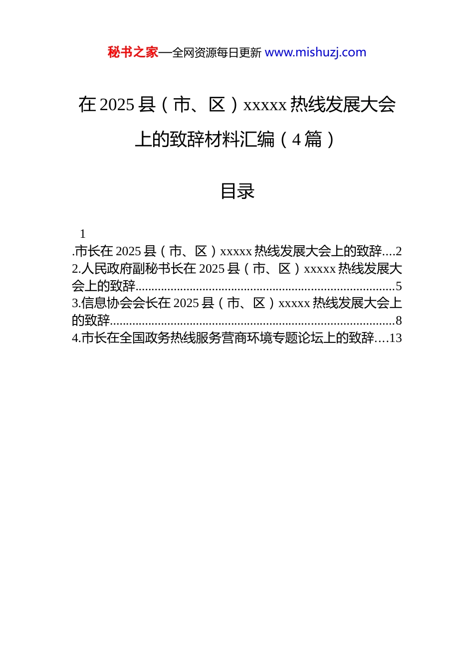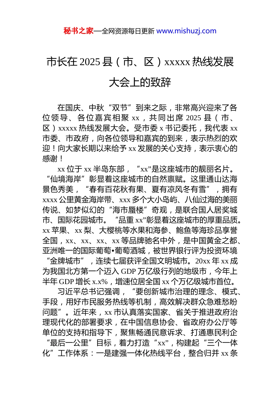 秘书之家—全网资源每日更新 www.mishuzj.com在 2025 县(市、区)xxxxx 热线发展大会上的致辞材料汇编(4 篇)目录1.市长在 2025 县(市、区)xxxxx 热线发展大会上的致辞....22.人民政府副秘书长在 2025 县(市、区)xxxxx 热线发展大会上的致辞.................................................................................53.信息协会会长在 2025 县(市、区)xxxxx 热线发展大会上的致辞.........................................................................................84.市长在全国政务热线服务营商环境专题论坛上的致辞....13秘书之家—全网资源每日更新 www.mishuzj.com市长在 2025 县(市、区)xxxxx 热线发展大会上的致辞在国庆、中秋“双节”到来之际,非常高兴迎来了各位 领 导 、 各 位 嘉 宾 相 聚 xx , 共 同 出 席 2025 县 ( 市 、区)xxxxx 热线发展大会。受市委 x 书记委托,我代表 xx市委、市政府,向各位领导和嘉宾的到来,表示热烈的欢迎!向大家长期以来给予 xx 发展的关心支持,表示衷心的感谢!xx 位于 xx 半岛东部,“xx”是这座城市的靓丽名片。“仙境海岸”彰显着这座城市的自然禀赋。这里通山达海景色秀美,“春有百花秋有果、夏有凉风冬有雪”,拥有xxxx 公里黄金海岸带、xxx 多个大小岛屿、八仙过海的美丽传说、如梦似幻的“海市蜃楼”奇观,是联合国人居奖城市、国际花园城市。“品重 xx”彰显着这座城市的厚重品质。xx 苹果、xx 梨、大樱桃等水果和海参、鲍鱼等海珍品享誉全国,xx、xx、xx、xx 等品牌驰名中外,是中国黄金之都、亚洲唯一的国际葡萄•葡萄酒城,被世界银行评为投资环境“金牌城市”,连续七届获评全国文明城市。20xx 年 xx 成为我国北方第一个迈入 GDP 万亿级行列的地级市,今年上半年 GDP 增长 x.x%,增速位居全国 xx 个万亿级城市首位。习近平总书记强调,“要创新城市治理的理念、模式、手段,用好市民服务热线等机制,高效解决群众急难愁盼问题”。近年来,xx 市认真落实国家、省关于推进政府治理现代化的部署要求,在中国信息协会、省政府办公厅等单位的支持和指导下,聚焦畅通民意诉求、打通惠民利企“最后一公里”目标,着力打造“xx”,构建起“三个一体化”工作体系:一是建强一体化热线平台,整合归并 xx 条秘书之家—全网资源每日更新 www.mishuzj.com县域、行业热线,实现全市企业群众诉求“一号受理、一呼即应、一网统管”,受理事项解决率、满意率保持 xx 省前列。二是推动一体化解决问题,建立市、县、乡三级贯通的诉求受理、转派、督导、评价闭环管理机制,创设“政企通”专线,有效解决企业诉求超 xx 万件,相关经验获评全国优化营商环境典型案例。三是赋能一体化基层治理,构建 AI 大模型智能研判系统,开展 xx 大领域、xxxx余项城市运行数据监测,实现普遍性、周期性、苗头性诉求“未诉先办”,推动基层治理从“经验主导”向“数据驱动”转变,“xxxxx+全域全科网格化赋能基层治理”经验连续两年获评全国政法智能化建设创新案例。本次大会以“数智驱动县域治理创新”为主题,搭建起各方展示政务热线创新思路、实践成果的高层级交流平台,xx 市将认真学习借鉴先进经验做法,围绕落实“高效办成一件事”,不断创新工作方法、提升服务效能、加强数智建设,持续完善政务热线工作机制,为推动基层治理体系和治理能力现代化提供有力支撑。诚挚欢迎各位领导各位嘉宾在 xx 期间多走走、多看看,对 xx 工作多提宝贵意见,我们一定全力做好服务保障。秘书之家—全网资源每日更新 www.mishuzj.com人民政府副秘书长在 2025 县(市、区)xxxxx 热线发展大会上的致辞在国庆华诞、中秋月圆双节来临之际,我们怀着喜悦与热忱,欢迎各位莅临“好客 xx、品质 xx”,共同参加2025 县(市、区)xxxxx 热线发展大会。在此,我谨代表xx 省政府办公厅,向各位领导、专家和同志们的到来表示最诚挚的欢迎!对大家长期以来给予 xx 工作的关心、支持与帮助,致以最衷心的感谢!xx 岱青海蓝、钟灵毓秀,作为我国东部沿...