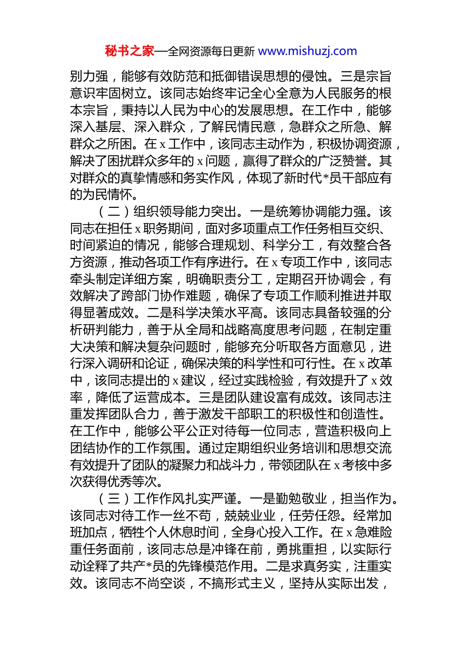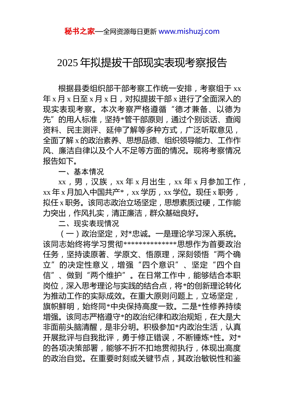 秘书之家—全网资源每日更新 www.mishuzj.com2025 年拟提拔干部现实表现考察报告根据县委组织部干部考察工作统一安排,考察组于 xx年 x 月 x 日至 x 月 x 日,对拟提拔干部 x 进行了全面深入的现实表现考察。本次考察严格遵循“德才兼备、以德为先”的用人标准,坚持*管干部原则,通过个别谈话、查阅资料、民主测评、延伸了解等多种方式,广泛听取意见,全面了解 x 的政治素养、思想品德、组织领导能力、工作作风、廉洁自律以及个人不足等方面的情况。现将考察情况报告如下。一、基本情况xx,男,汉族,xx 年 x 月出生,xx 年 x 月参加工作,xx 年 x 月加入中国共产*,xx 学历,xx 学位。现任 x 职务,拟任 x 职务。该同志政治立场坚定,思想素质过硬,工作能力突出,作风扎实,清正廉洁,群众基础良好。二、现实表现情况(一)政治坚定,对*忠诚。一是理论学习深入系统。该同志始终将学习贯彻**************思想作为首要政治任务,坚持读原著、学原文、悟原理,深刻领悟“两个确立”的决定性意义,增强“四个意识”、坚定“四个自信”、做到“两个维护”。在日常工作中,能够结合本职岗位,深入思考理论与实践的结合点,将*的创新理论转化为推动工作的实际成效。在重大原则问题上,立场坚定,旗帜鲜明,始终同*中央保持高度一致。二是*性修养持续增强。该同志严格遵守*的政治纪律和政治规矩,在大是大非面前头脑清醒,是非分明。积极参加*内政治生活,认真开展批评与自我批评,勇于修正错误,不断锤炼*性。对*的各项决策部署,能够不折不扣地贯彻执行,体现出高度的政治自觉。在重要时刻或关键节点,其政治敏锐性和鉴秘书之家—全网资源每日更新 www.mishuzj.com别力强,能够有效防范和抵御错误思想的侵蚀。三是宗旨意识牢固树立。该同志始终牢记全心全意为人民服务的根本宗旨,秉持以人民为中心的发展思想。在工作中,能够深入基层、深入群众,了解民情民意,急群众之所急、解群众之所困。在 x 工作中,该同志主动作为,积极协调资源,解决了困扰群众多年的 x 问题,赢得了群众的广泛赞誉。其对群众的真挚情感和务实作风,体现了新时代*员干部应有的为民情怀。(二)组织领导能力突出。一是统筹协调能力强。该同志在担任 x 职务期间,面对多项重点工作任务相互交织、时间紧迫的情况,能够合理规划、科学分工,有效整合各方资源,推动各项工作有序进行。在 x 专项工作中,该同志牵头制定详细方案,明确职责分工,定期召开协调会,有效解决了跨部门协作难题,确保了专项工作顺利推进并取得显著成效。二是科学决策水平高。该同志具备较强的分析研判能力,善于从全局和战略高度思考问题,在制定重大决策和解决复杂问题时,能够充分听取各方面意见,进行深入调研和论证,确保决策的科学性和可行性。在 x 改革中,该同志提出的 x 建议,经过实践检验,有效提升了 x 效率,降低了运营成本。三是团队建设富有成效。该同志注重发挥团队合力,善于激发干部职工的积极性和创造性。在工作中,能够公平公正对待每一位同志,营造积极向上团结协作的工作氛围。通过定期组织业务培训和思想交流有效提升了团队的凝聚力和战斗力,带领团队在 x 考核中多次获得优秀等次。(三)工作作风扎实严谨。一是勤勉敬业,担当作为。该同志对待工作一丝不苟,兢兢业业,任劳任怨。经常加班加点,牺牲个人休息时间,全身心投入工作。在 x 急难险重任务面前,该同志总是冲锋在前,勇挑重担,以实际行动诠释了共产*员的先锋模范作用。二是求真务实,注重实效。该同志不尚空谈,不搞形式主义,坚持从实际出发,秘书之家—全网资源每日更新 www.mishuzj.com深入调查研究,掌握第一手资料。在制定工作计划和推动具体实施时,注重可操作性和实效性,力求把工作做到位做到家。其撰写的 x 调研报告,观点鲜明,数据翔实,为领导决策提供了重要参考。三是纪律严明,服从管理。该同志严格遵守各项规章制度,自觉维护单位的整体形象。对上级安排的工作,能够不讲条件、不打折扣地完成,执行力强。在工作中,能够正确处理上下级关系,尊重领导,团结同事,展现出良好的...