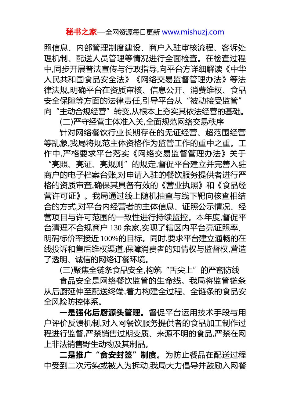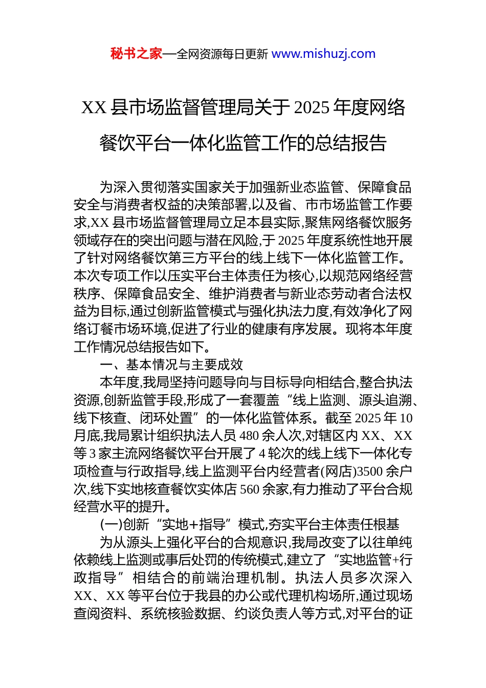 秘书之家—全网资源每日更新 www.mishuzj.comXX 县市场监督管理局关于 2025 年度网络餐饮平台一体化监管工作的总结报告为深入贯彻落实国家关于加强新业态监管、保障食品安全与消费者权益的决策部署,以及省、市市场监管工作要求,XX 县市场监督管理局立足本县实际,聚焦网络餐饮服务领域存在的突出问题与潜在风险,于 2025 年度系统性地开展了针对网络餐饮第三方平台的线上线下一体化监管工作。本次专项工作以压实平台主体责任为核心,以规范网络经营秩序、保障食品安全、维护消费者与新业态劳动者合法权益为目标,通过创新监管模式与强化执法力度,有效净化了网络订餐市场环境,促进了行业的健康有序发展。现将本年度工作情况总结报告如下。一、基本情况与主要成效本年度,我局坚持问题导向与目标导向相结合,整合执法资源,创新监管手段,形成了一套覆盖“线上监测、源头追溯、线下核查、闭环处置”的一体化监管体系。截至 2025 年 10月底,我局累计组织执法人员 480 余人次,对辖区内 XX、XX等 3 家主流网络餐饮平台开展了 4 轮次的线上线下一体化专项检查与行政指导,线上监测平台内经营者(网店)3500 余户次,线下实地核查餐饮实体店 560 余家,有力推动了平台合规经营水平的提升。(一)创新“实地+指导”模式,夯实平台主体责任根基为从源头上强化平台的合规意识,我局改变了以往单纯依赖线上监测或事后处罚的传统模式,建立了“实地监管+行政指导”相结合的前端治理机制。执法人员多次深入XX、XX 等平台位于我县的办公或代理机构场所,通过现场查阅资料、系统核验数据、约谈负责人等方式,对平台的证秘书之家—全网资源每日更新 www.mishuzj.com照信息、内部管理制度建设、商户入驻审核流程、客诉处理机制、配送人员管理等情况进行全面检查。在检查过程中,同步开展普法宣传与行政指导,向平台方详细解读《中华人民共和国食品安全法》《网络交易监督管理办法》等法律法规,明确平台在资质审核、信息公开、消费维权、食品安全保障等方面的法律责任,引导平台从“被动接受监管”向“主动合规经营”转变,从根本上夯实其依法经营的基础。(二)严守经营主体准入关,全面规范网络交易秩序针对网络餐饮行业长期存在的无证经营、超范围经营等乱象,我局将规范主体资格作为监管工作的重中之重。工作中,严格要求平台落实《网络交易监督管理办法》关于“亮照、亮证、亮规则”的规定,督促平台建立并完善入驻商户的电子档案台账,对申请入驻的餐饮服务提供者进行严格的资质审查,确保其具备有效的《营业执照》和《食品经营许可证》。我局通过线上随机抽查与线下靶向核查相结合的方式,对平台内经营者的主体信息、证照公示情况、经营项目与许可范围的一致性进行持续监控。本年度,督促平台清理不合规商户 130 余家,实现了辖区内平台亮证照率、明码标价率接近 100%的目标。同时,要求平台建立通畅的在线投诉和售后维权渠道,保障消费者的知情权与监督权,营造了透明、诚信的网络订餐环境。(三)聚焦全链条食品安全,构筑“舌尖上”的严密防线食品安全是网络餐饮监管的生命线。我局将监管链条从后厨延伸至配送终端,着力构建全过程、全链条的食品安全风险防控体系。一是强化后厨源头管理。督促平台运用技术手段与用户评价反馈机制,对入网餐饮服务提供者的食品加工制作过程进行监督,严禁销售过期变质、来源不明的食品,严禁在网上非法销售野生动物及其制品。二是推广“食安封签”制度。为防止餐品在配送过程中受到二次污染或被人为拆动,我局大力倡导并鼓励入网餐秘书之家—全网资源每日更新 www.mishuzj.com饮单位使用“食安封签”。通过向平台、商户和消费者三方宣传“食安封签”的重要性,引导其成为行业标配,本年度辖区内主要商户的“食安封签”使用率已提升至 85%以上。三是规范配送过程卫生。明确要求平台加强对配送装备的卫生管理,建立配送箱、车辆等设备的常态化清洁消毒制度并留存记录,有效防止病毒细菌滋生,确保配送环节的安全。(四)保障多方合法权益,促进业态和谐健康发展网络餐饮经济涉及平台、商户、消费者和外卖骑手等多方主体,保障各方权益是实现行业可持续发展的前提。在消费者权益保护方面,我...