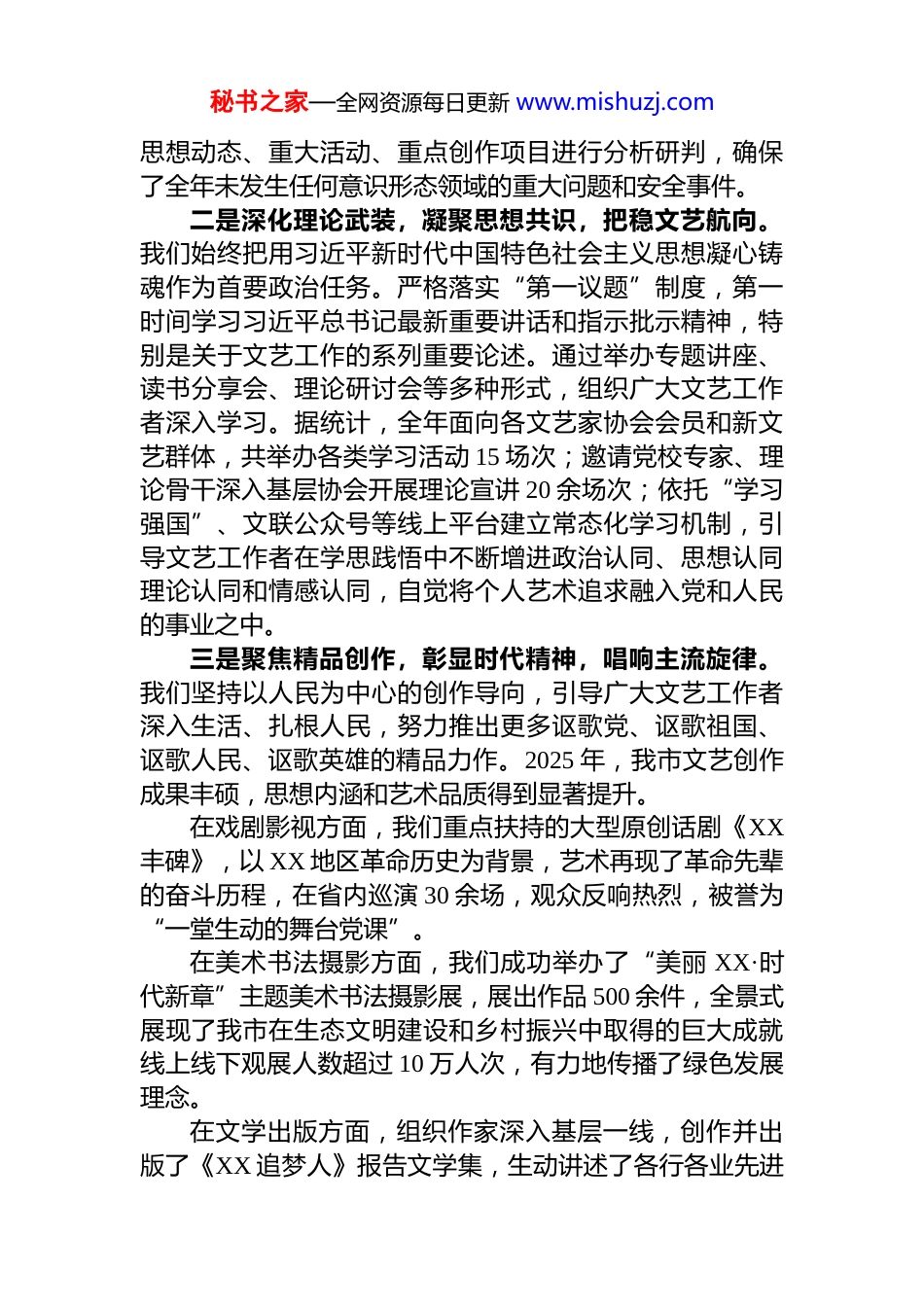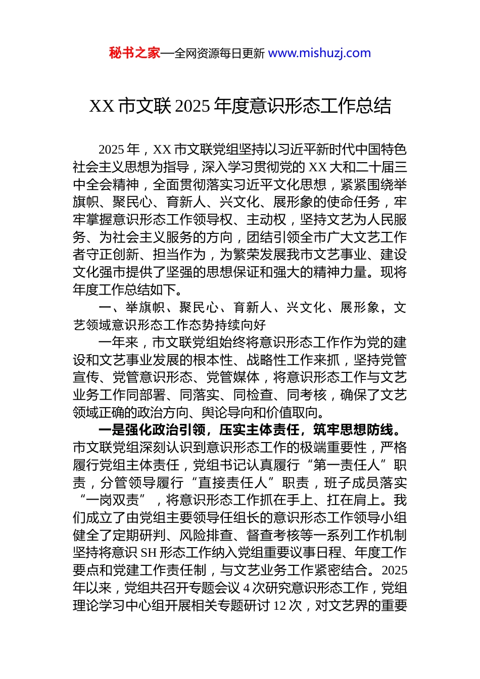 秘书之家—全网资源每日更新 www.mishuzj.comXX 市文联 2025 年度意识形态工作总结2025 年,XX 市文联党组坚持以习近平新时代中国特色社会主义思想为指导,深入学习贯彻党的 XX 大和二十届三中全会精神,全面贯彻落实习近平文化思想,紧紧围绕举旗帜、聚民心、育新人、兴文化、展形象的使命任务,牢牢掌握意识形态工作领导权、主动权,坚持文艺为人民服务、为社会主义服务的方向,团结引领全市广大文艺工作者守正创新、担当作为,为繁荣发展我市文艺事业、建设文化强市提供了坚强的思想保证和强大的精神力量。现将年度工作总结如下。一、举旗帜、聚民心、育新人、兴文化、展形象,文艺领域意识形态工作态势持续向好一年来,市文联党组始终将意识形态工作作为党的建设和文艺事业发展的根本性、战略性工作来抓,坚持党管宣传、党管意识形态、党管媒体,将意识形态工作与文艺业务工作同部署、同落实、同检查、同考核,确保了文艺领域正确的政治方向、舆论导向和价值取向。一是强化政治引领,压实主体责任,筑牢思想防线。市文联党组深刻认识到意识形态工作的极端重要性,严格履行党组主体责任,党组书记认真履行“第一责任人”职责,分管领导履行“直接责任人”职责,班子成员落实“一岗双责”,将意识形态工作抓在手上、扛在肩上。我们成立了由党组主要领导任组长的意识形态工作领导小组健全了定期研判、风险排查、督查考核等一系列工作机制坚持将意识 SH 形态工作纳入党组重要议事日程、年度工作要点和党建工作责任制,与文艺业务工作紧密结合。2025年以来,党组共召开专题会议 4 次研究意识形态工作,党组理论学习中心组开展相关专题研讨 12 次,对文艺界的重要秘书之家—全网资源每日更新 www.mishuzj.com思想动态、重大活动、重点创作项目进行分析研判,确保了全年未发生任何意识形态领域的重大问题和安全事件。二是深化理论武装,凝聚思想共识,把稳文艺航向。我们始终把用习近平新时代中国特色社会主义思想凝心铸魂作为首要政治任务。严格落实“第一议题”制度,第一时间学习习近平总书记最新重要讲话和指示批示精神,特别是关于文艺工作的系列重要论述。通过举办专题讲座、读书分享会、理论研讨会等多种形式,组织广大文艺工作者深入学习。据统计,全年面向各文艺家协会会员和新文艺群体,共举办各类学习活动 15 场次;邀请党校专家、理论骨干深入基层协会开展理论宣讲 20 余场次;依托“学习强国”、文联公众号等线上平台建立常态化学习机制,引导文艺工作者在学思践悟中不断增进政治认同、思想认同理论认同和情感认同,自觉将个人艺术追求融入党和人民的事业之中。三是聚焦精品创作,彰显时代精神,唱响主流旋律。我们坚持以人民为中心的创作导向,引导广大文艺工作者深入生活、扎根人民,努力推出更多讴歌党、讴歌祖国、讴歌人民、讴歌英雄的精品力作。2025 年,我市文艺创作成果丰硕,思想内涵和艺术品质得到显著提升。在戏剧影视方面,我们重点扶持的大型原创话剧《XX丰碑》,以 XX 地区革命历史为背景,艺术再现了革命先辈的奋斗历程,在省内巡演 30 余场,观众反响热烈,被誉为“一堂生动的舞台党课”。在美术书法摄影方面,我们成功举办了“美丽 XX·时代新章”主题美术书法摄影展,展出作品 500 余件,全景式展现了我市在生态文明建设和乡村振兴中取得的巨大成就线上线下观展人数超过 10 万人次,有力地传播了绿色发展理念。在文学出版方面,组织作家深入基层一线,创作并出版了《XX 追梦人》报告文学集,生动讲述了各行各业先进秘书之家—全网资源每日更新 www.mishuzj.com典型的感人故事,发行超过 2 万册,在全社会营造了崇尚先进、学习先进的浓厚氛围。在舞台艺术方面,我们持续深化“我们的中国梦——文化进万家”活动,全年组织各类文艺惠民演出 45 场,覆盖城乡观众达 3.5 万余人次,将高质量的精神食粮送到群众家门口,用艺术的形式传递了党的声音和关怀。四是创新活动载体,服务人民群众,弘扬文明新风。我们积极响应中国文联号召,深入开展 2025 年“与人民同行”新时代文明实践文艺志愿服务主题活动,秉持“送文...