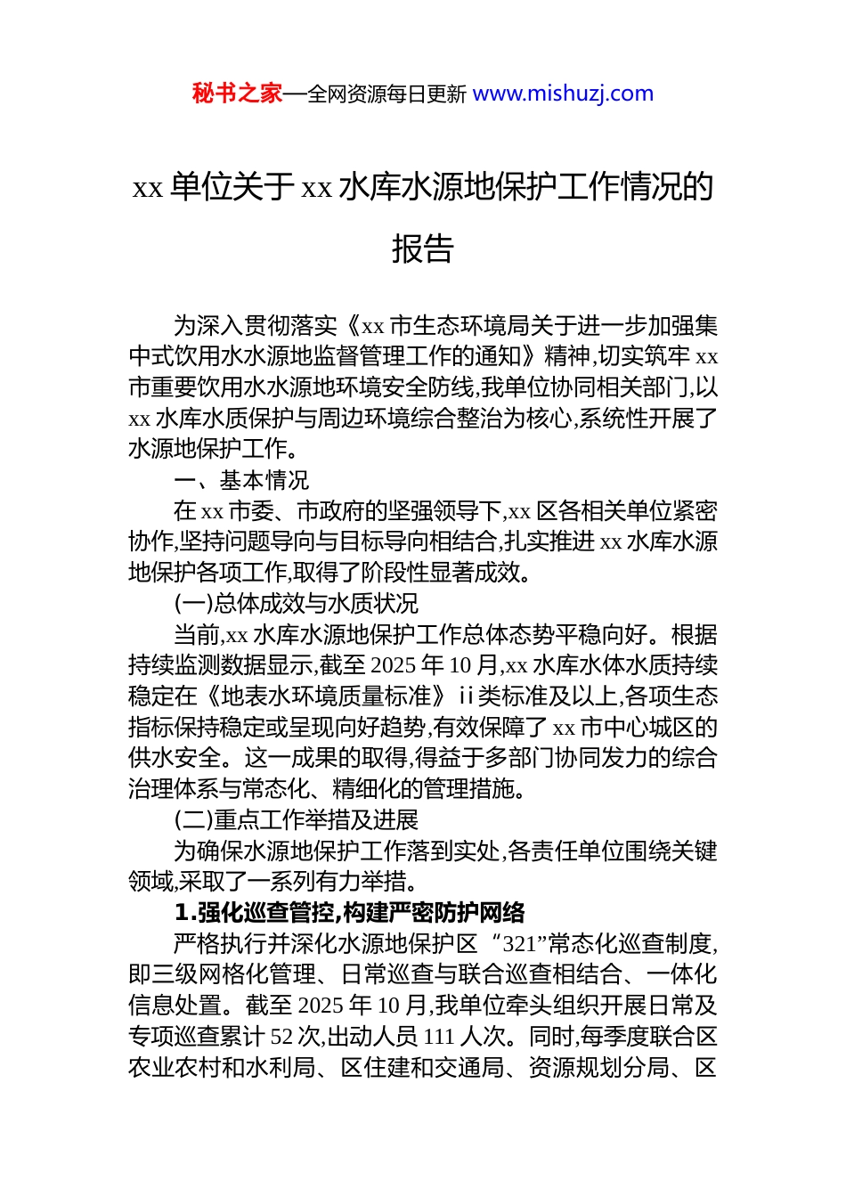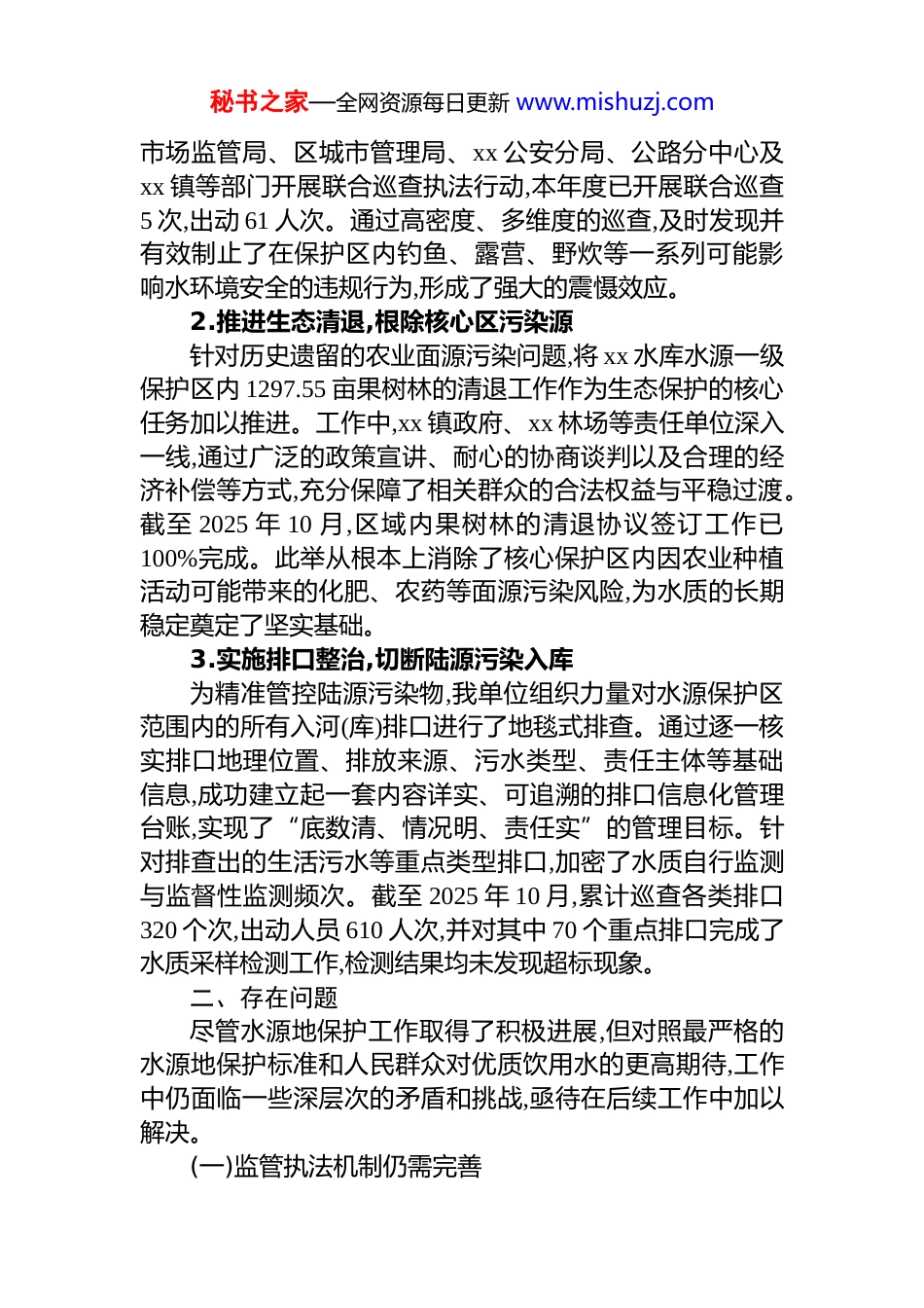 秘书之家—全网资源每日更新 www.mishuzj.comxx 单位关于 xx 水库水源地保护工作情况的报告为深入贯彻落实《xx 市生态环境局关于进一步加强集中式饮用水水源地监督管理工作的通知》精神,切实筑牢 xx市重要饮用水水源地环境安全防线,我单位协同相关部门,以xx 水库水质保护与周边环境综合整治为核心,系统性开展了水源地保护工作。一、基本情况在 xx 市委、市政府的坚强领导下,xx 区各相关单位紧密协作,坚持问题导向与目标导向相结合,扎实推进 xx 水库水源地保护各项工作,取得了阶段性显著成效。(一)总体成效与水质状况当前,xx 水库水源地保护工作总体态势平稳向好。根据持续监测数据显示,截至 2025 年 10 月,xx 水库水体水质持续稳定在《地表水环境质量标准》ⅱ类标准及以上,各项生态指标保持稳定或呈现向好趋势,有效保障了 xx 市中心城区的供水安全。这一成果的取得,得益于多部门协同发力的综合治理体系与常态化、精细化的管理措施。(二)重点工作举措及进展为确保水源地保护工作落到实处,各责任单位围绕关键领域,采取了一系列有力举措。1.强化巡查管控,构建严密防护网络严格执行并深化水源地保护区“321”常态化巡查制度,即三级网格化管理、日常巡查与联合巡查相结合、一体化信息处置。截至 2025 年 10 月,我单位牵头组织开展日常及专项巡查累计 52 次,出动人员 111 人次。同时,每季度联合区农业农村和水利局、区住建和交通局、资源规划分局、区秘书之家—全网资源每日更新 www.mishuzj.com市场监管局、区城市管理局、xx 公安分局、公路分中心及xx 镇等部门开展联合巡查执法行动,本年度已开展联合巡查5 次,出动 61 人次。通过高密度、多维度的巡查,及时发现并有效制止了在保护区内钓鱼、露营、野炊等一系列可能影响水环境安全的违规行为,形成了强大的震慑效应。2.推进生态清退,根除核心区污染源针对历史遗留的农业面源污染问题,将 xx 水库水源一级保护区内 1297.55 亩果树林的清退工作作为生态保护的核心任务加以推进。工作中,xx 镇政府、xx 林场等责任单位深入一线,通过广泛的政策宣讲、耐心的协商谈判以及合理的经济补偿等方式,充分保障了相关群众的合法权益与平稳过渡。截至 2025 年 10 月,区域内果树林的清退协议签订工作已100%完成。此举从根本上消除了核心保护区内因农业种植活动可能带来的化肥、农药等面源污染风险,为水质的长期稳定奠定了坚实基础。3.实施排口整治,切断陆源污染入库为精准管控陆源污染物,我单位组织力量对水源保护区范围内的所有入河(库)排口进行了地毯式排查。通过逐一核实排口地理位置、排放来源、污水类型、责任主体等基础信息,成功建立起一套内容详实、可追溯的排口信息化管理台账,实现了“底数清、情况明、责任实”的管理目标。针对排查出的生活污水等重点类型排口,加密了水质自行监测与监督性监测频次。截至 2025 年 10 月,累计巡查各类排口320 个次,出动人员 610 人次,并对其中 70 个重点排口完成了水质采样检测工作,检测结果均未发现超标现象。二、存在问题尽管水源地保护工作取得了积极进展,但对照最严格的水源地保护标准和人民群众对优质饮用水的更高期待,工作中仍面临一些深层次的矛盾和挑战,亟待在后续工作中加以解决。(一)监管执法机制仍需完善秘书之家—全网资源每日更新 www.mishuzj.com当前的监管体系在应对突发性、隐蔽性强的违规行为时,仍存在一定的局限性。一方面,现有执法力量面对广阔的水域和复杂的岸线环境,难以实现全天候、无死角的覆盖,游泳、网鱼、私自进入围网区域等零星违法活动仍时有发生另一方面,多部门联合执法机制虽已建立,但在信息共享、快速响应、责任界定等方面的协同效率有待进一步提升,有时存在“联动不紧密、执法有空档”的现象,导致对某些违法行为的打击力度和威慑力不足。(二)源头治理与群众利益平衡面临挑战xx 水库水源地保护与库区及上游流域部分群众的传统生产生活方式之间存在客观矛盾。在推进农业种植结构调整、畜禽养殖清退、生活污水纳管等工作中,尽管制定了补偿政策,但部分补偿标准与群众的实际损失和未来生计预期尚存差距,导致少数群众配合意愿不...