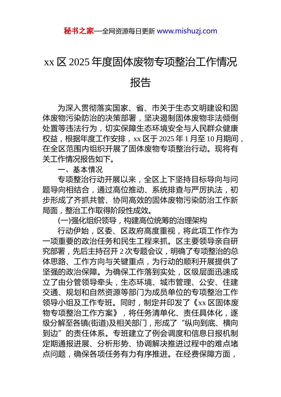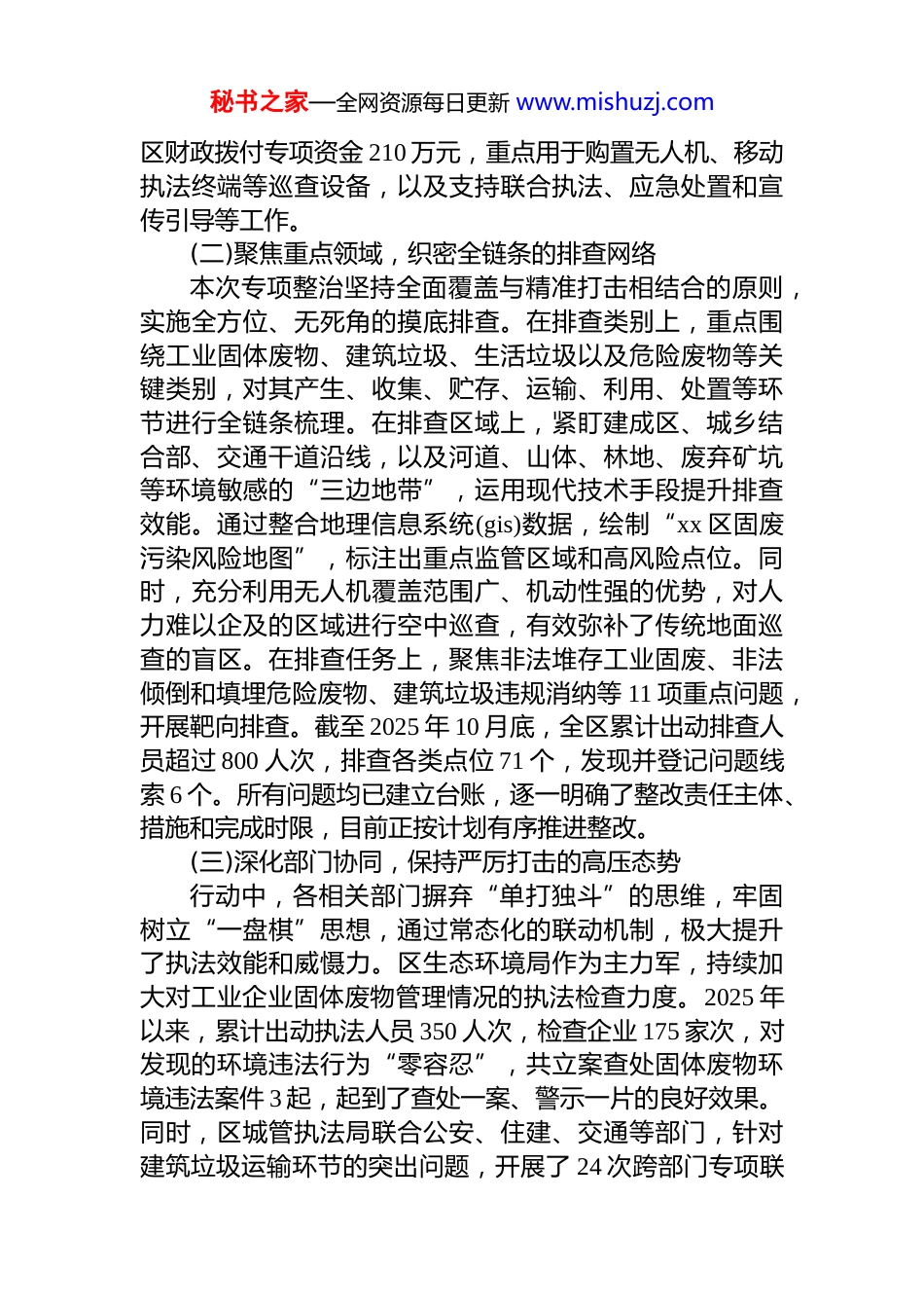 秘书之家—全网资源每日更新 www.mishuzj.comxx 区 2025 年度固体废物专项整治工作情况报告为深入贯彻落实国家、省、市关于生态文明建设和固体废物污染防治的决策部署,坚决遏制固体废物非法倾倒处置等违法行为,切实保障生态环境安全与人民群众健康权益,根据年度工作安排,xx 区于 2025 年 1 月至 10 月期间,在全区范围内组织开展了固体废物专项整治行动。现将有关工作情况报告如下。一、基本情况专项整治行动开展以来,全区上下坚持目标导向与问题导向相结合,通过高位推动、系统排查与严厉执法,初步形成了齐抓共管、协同高效的固体废物污染防治工作新局面,整治工作取得阶段性成效。(一)强化组织领导,构建高位统筹的治理架构行动伊始,区委、区政府高度重视,将此项工作作为一项重要的政治任务和民生工程来抓。区主要领导亲自研究部署,先后主持召开 2 次专题会议,明确了专项整治的总体思路、工作方向与关键重点,为行动的顺利开展提供了坚强的政治保障。为确保工作落到实处,区级层面迅速成立了由分管领导牵头,生态环境、城市管理、公安、住建交通、规划和自然资源等部门为成员单位的专项整治工作领导小组及工作专班。同时,制定并印发了《xx 区固体废物专项整治工作方案》,将任务清单化、责任具体化,逐级分解至各镇(街道)及相关部门,形成了“纵向到底、横向到边”的责任体系。专班建立了例会调度和信息日报机制定期通报进展、分析形势、协调解决推进过程中的难点堵点问题,确保各项任务有力有序推进。在经费保障方面,秘书之家—全网资源每日更新 www.mishuzj.com区财政拨付专项资金 210 万元,重点用于购置无人机、移动执法终端等巡查设备,以及支持联合执法、应急处置和宣传引导等工作。(二)聚焦重点领域,织密全链条的排查网络本次专项整治坚持全面覆盖与精准打击相结合的原则,实施全方位、无死角的摸底排查。在排查类别上,重点围绕工业固体废物、建筑垃圾、生活垃圾以及危险废物等关键类别,对其产生、收集、贮存、运输、利用、处置等环节进行全链条梳理。在排查区域上,紧盯建成区、城乡结合部、交通干道沿线,以及河道、山体、林地、废弃矿坑等环境敏感的“三边地带”,运用现代技术手段提升排查效能。通过整合地理信息系统(gis)数据,绘制“xx 区固废污染风险地图”,标注出重点监管区域和高风险点位。同时,充分利用无人机覆盖范围广、机动性强的优势,对人力难以企及的区域进行空中巡查,有效弥补了传统地面巡查的盲区。在排查任务上,聚焦非法堆存工业固废、非法倾倒和填埋危险废物、建筑垃圾违规消纳等 11 项重点问题,开展靶向排查。截至 2025 年 10 月底,全区累计出动排查人员超过 800 人次,排查各类点位 71 个,发现并登记问题线索 6 个。所有问题均已建立台账,逐一明确了整改责任主体、措施和完成时限,目前正按计划有序推进整改。(三)深化部门协同,保持严厉打击的高压态势行动中,各相关部门摒弃“单打独斗”的思维,牢固树立“一盘棋”思想,通过常态化的联动机制,极大提升了执法效能和威慑力。区生态环境局作为主力军,持续加大对工业企业固体废物管理情况的执法检查力度。2025 年以来,累计出动执法人员 350 人次,检查企业 175 家次,对发现的环境违法行为“零容忍”,共立案查处固体废物环境违法案件 3 起,起到了查处一案、警示一片的良好效果。同时,区城管执法局联合公安、住建、交通等部门,针对建筑垃圾运输环节的突出问题,开展了 24 次跨部门专项联秘书之家—全网资源每日更新 www.mishuzj.com合检查。通过在主要路段设卡盘查、对重点工地进行突击检查等方式,依法查处建筑垃圾运输车辆未密闭运输、沿途撒漏造成的扬尘污染案件 159 起,查处未经核准擅自处置及随意倾倒建筑垃圾的违法行为 10 起。这种多部门、多层次、全天候的联合执法模式,切实织密了监管网络,打破了违法分子利用部门职能交叉、监管时段差异打“游击战”的幻想,形成了强大的执法合力与有效震慑。(四)广泛宣传引导,营造全民参与的共治氛围为从根本上减少固体废物污染问题,专项整治行动坚持打击与教育并重,积...