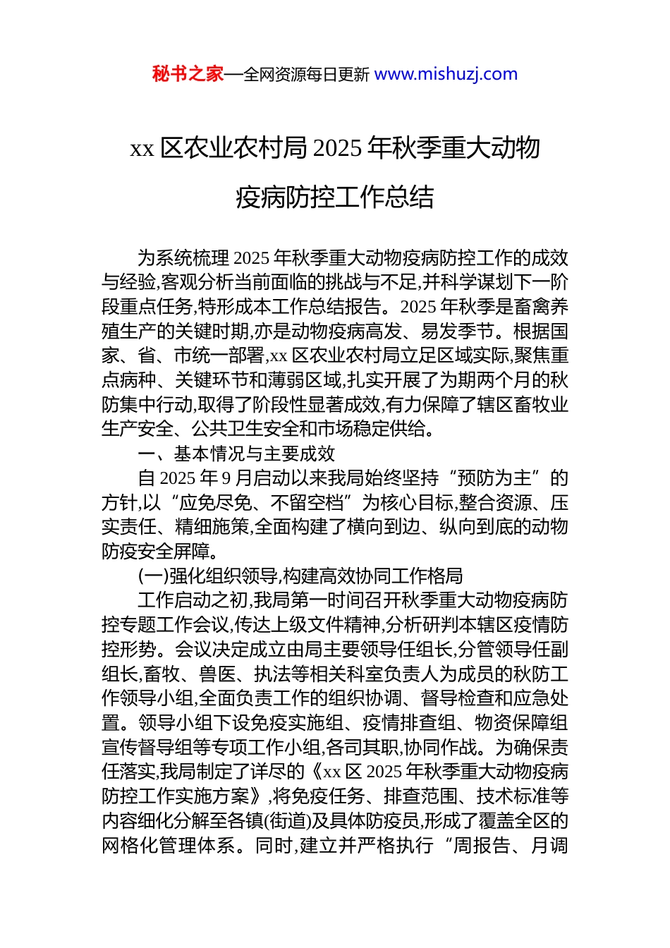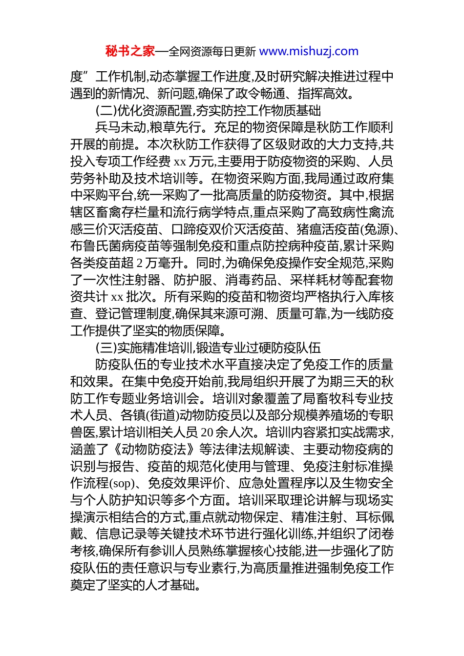 秘书之家—全网资源每日更新 www.mishuzj.comxx 区农业农村局 2025 年秋季重大动物疫病防控工作总结为系统梳理 2025 年秋季重大动物疫病防控工作的成效与经验,客观分析当前面临的挑战与不足,并科学谋划下一阶段重点任务,特形成本工作总结报告。2025 年秋季是畜禽养殖生产的关键时期,亦是动物疫病高发、易发季节。根据国家、省、市统一部署,xx 区农业农村局立足区域实际,聚焦重点病种、关键环节和薄弱区域,扎实开展了为期两个月的秋防集中行动,取得了阶段性显著成效,有力保障了辖区畜牧业生产安全、公共卫生安全和市场稳定供给。一、基本情况与主要成效自 2025 年 9 月启动以来我局始终坚持“预防为主”的方针,以“应免尽免、不留空档”为核心目标,整合资源、压实责任、精细施策,全面构建了横向到边、纵向到底的动物防疫安全屏障。(一)强化组织领导,构建高效协同工作格局工作启动之初,我局第一时间召开秋季重大动物疫病防控专题工作会议,传达上级文件精神,分析研判本辖区疫情防控形势。会议决定成立由局主要领导任组长,分管领导任副组长,畜牧、兽医、执法等相关科室负责人为成员的秋防工作领导小组,全面负责工作的组织协调、督导检查和应急处置。领导小组下设免疫实施组、疫情排查组、物资保障组宣传督导组等专项工作小组,各司其职,协同作战。为确保责任落实,我局制定了详尽的《xx 区 2025 年秋季重大动物疫病防控工作实施方案》,将免疫任务、排查范围、技术标准等内容细化分解至各镇(街道)及具体防疫员,形成了覆盖全区的网格化管理体系。同时,建立并严格执行“周报告、月调秘书之家—全网资源每日更新 www.mishuzj.com度”工作机制,动态掌握工作进度,及时研究解决推进过程中遇到的新情况、新问题,确保了政令畅通、指挥高效。(二)优化资源配置,夯实防控工作物质基础兵马未动,粮草先行。充足的物资保障是秋防工作顺利开展的前提。本次秋防工作获得了区级财政的大力支持,共投入专项工作经费 xx 万元,主要用于防疫物资的采购、人员劳务补助及技术培训等。在物资采购方面,我局通过政府集中采购平台,统一采购了一批高质量的防疫物资。其中,根据辖区畜禽存栏量和流行病学特点,重点采购了高致病性禽流感三价灭活疫苗、口蹄疫双价灭活疫苗、猪瘟活疫苗(兔源)、布鲁氏菌病疫苗等强制免疫和重点防控病种疫苗,累计采购各类疫苗超 2 万毫升。同时,为确保免疫操作安全规范,采购了一次性注射器、防护服、消毒药品、采样耗材等配套物资共计 xx 批次。所有采购的疫苗和物资均严格执行入库核查、登记管理制度,确保其来源可溯、质量可靠,为一线防疫工作提供了坚实的物质保障。(三)实施精准培训,锻造专业过硬防疫队伍防疫队伍的专业技术水平直接决定了免疫工作的质量和效果。在集中免疫开始前,我局组织开展了为期三天的秋防工作专题业务培训会。培训对象覆盖了局畜牧科专业技术人员、各镇(街道)动物防疫员以及部分规模养殖场的专职兽医,累计培训相关人员 20 余人次。培训内容紧扣实战需求,涵盖了《动物防疫法》等法律法规解读、主要动物疫病的识别与报告、疫苗的规范化使用与管理、免疫注射标准操作流程(sop)、免疫效果评价、应急处置程序以及生物安全与个人防护知识等多个方面。培训采取理论讲解与现场实操演示相结合的方式,重点就动物保定、精准注射、耳标佩戴、信息记录等关键技术环节进行强化训练,并组织了闭卷考核,确保所有参训人员熟练掌握核心技能,进一步强化了防疫队伍的责任意识与专业素行,为高质量推进强制免疫工作奠定了坚实的人才基础。秘书之家—全网资源每日更新 www.mishuzj.com(四)聚力集中免疫,筑牢群体免疫坚固屏障在为期一个多月的集中免疫阶段,我局全体防疫人员与技术骨干下沉一线,针对辖区内 40 多户规模养殖场(户)及广大散养户,开展“逐村逐户、不漏一畜”的地毯式上门免疫服务。工作中,严格遵循“一人一针一消毒”的操作规程,对每一只(头)接受免疫的畜禽,都详细核对畜主信息、建立免疫档案、佩戴或核查免疫耳标,实现了免疫信息全程可追溯。本次秋防行动中,全局凝心聚力,累计完成 1500 只羊、149 头牛、600 头猪以及 1.8 万余只家禽的免疫接种...