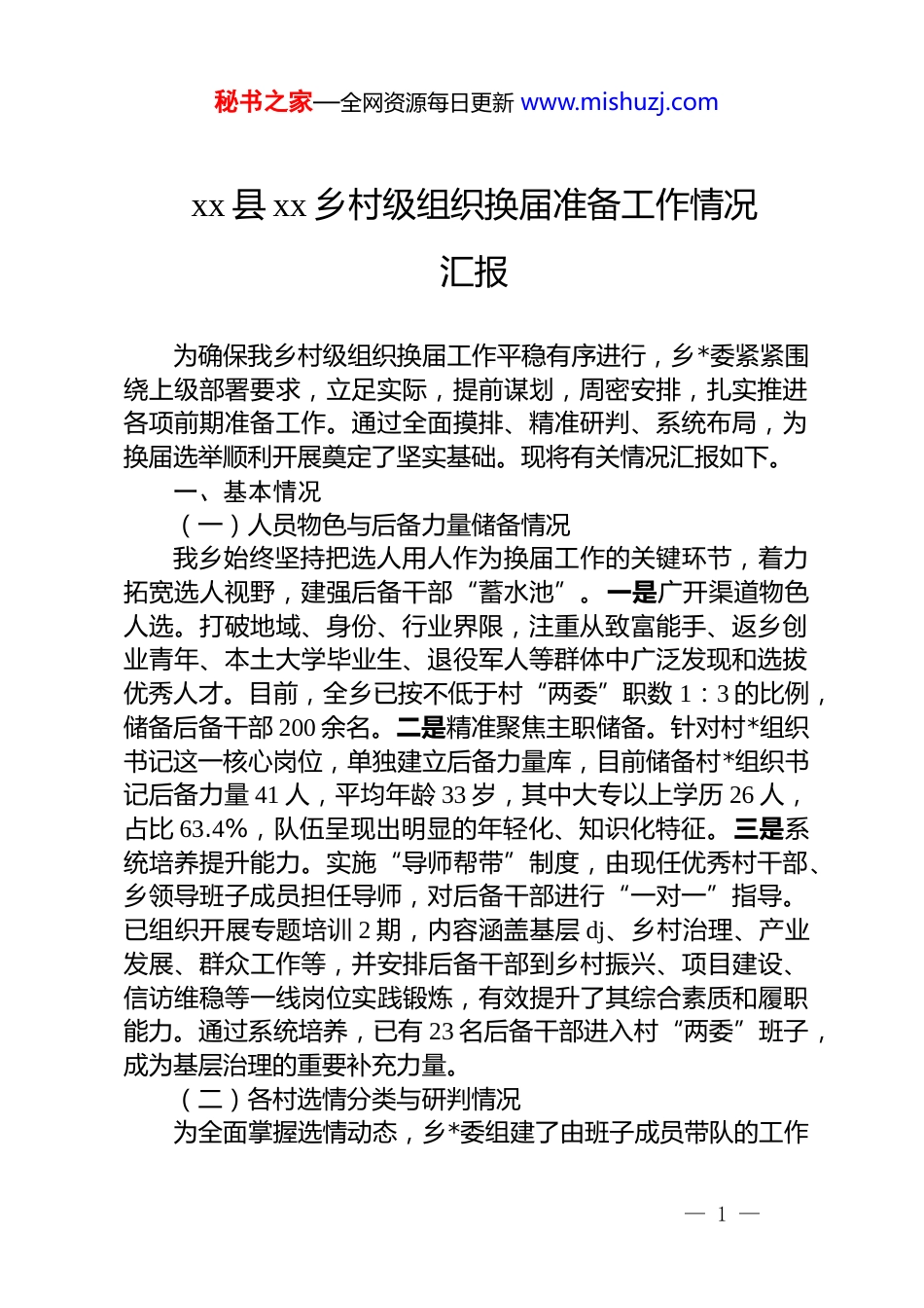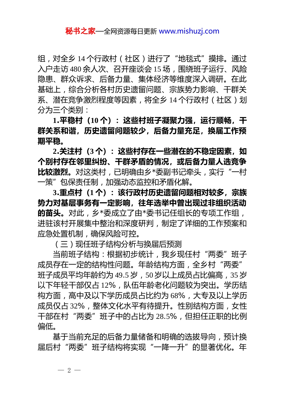 秘书之家—全网资源每日更新 www.mishuzj.comxx 县 xx 乡村级组织换届准备工作情况汇报为确保我乡村级组织换届工作平稳有序进行,乡*委紧紧围绕上级部署要求,立足实际,提前谋划,周密安排,扎实推进各项前期准备工作。通过全面摸排、精准研判、系统布局,为换届选举顺利开展奠定了坚实基础。现将有关情况汇报如下。一、基本情况(一)人员物色与后备力量储备情况我乡始终坚持把选人用人作为换届工作的关键环节,着力拓宽选人视野,建强后备干部“蓄水池”。一是广开渠道物色人选。打破地域、身份、行业界限,注重从致富能手、返乡创业青年、本土大学毕业生、退役军人等群体中广泛发现和选拔优秀人才。目前,全乡已按不低于村“两委”职数 1:3 的比例,储备后备干部 200 余名。二是精准聚焦主职储备。针对村*组织书记这一核心岗位,单独建立后备力量库,目前储备村*组织书记后备力量 41 人,平均年龄 33 岁,其中大专以上学历 26 人,占比 63.4%,队伍呈现出明显的年轻化、知识化特征。三是系统培养提升能力。实施“导师帮带”制度,由现任优秀村干部、乡领导班子成员担任导师,对后备干部进行“一对一”指导。已组织开展专题培训 2 期,内容涵盖基层 dj、乡村治理、产业发展、群众工作等,并安排后备干部到乡村振兴、项目建设、信访维稳等一线岗位实践锻炼,有效提升了其综合素质和履职能力。通过系统培养,已有 23 名后备干部进入村“两委”班子,成为基层治理的重要补充力量。(二)各村选情分类与研判情况为全面掌握选情动态,乡*委组建了由班子成员带队的工作— 1 —秘书之家—全网资源每日更新 www.mishuzj.com组,对全乡 14 个行政村(社区)进行了“地毯式”摸排。通过入户走访 480 余人次、召开座谈会 15 场,围绕班子运行、风险隐患、群众诉求、后备力量、集体经济等维度深入调研。在此基础上,综合分析各村历史遗留问题、宗族势力影响、干群关系、潜在竞争激烈程度等因素,将全乡 14 个行政村(社区)划分为三个类别:1.平稳村(10 个):这些村班子凝聚力强,运行顺畅,干群关系和谐,历史遗留问题较少,后备力量充足,换届工作预期平稳。2.关注村(3 个):这些村存在一些潜在的不稳定因素,如个别村存在邻里纠纷、干群矛盾的情况,或后备力量人选竞争比较激烈。对这类村,已明确由乡*委副书记牵头,实行“一村一策”包保责任制,加强动态监控和矛盾化解。3.重点村(1 个):该行政村历史遗留问题相对较多,宗族势力对基层事务有一定影响,往年选举中曾出现过非组织活动的苗头。对此,乡*委成立了由*委书记任组长的专项工作组,进驻该村开展集中整治和深度研判,制定了详细的工作预案和应急处置机制,确保风险可控。(三)现任班子结构分析与换届后预测当前班子结构:根据初步统计,我乡现任村“两委”班子成员存在一定的结构性问题。年龄结构方面,全乡村“两委”班子成员平均年龄约为 49.5 岁,50 岁以上成员占比偏高,35 岁以下年轻干部仅占 12%,队伍年龄老化问题较为突出。学历结构方面,高中及以下学历成员占比约为 68%,大专及以上学历成员仅占 32%,整体文化水平有待提升。性别结构方面,女性干部在村“两委”班子中的占比为 28.5%,但担任正职的比例偏低。基于当前充足的后备力量储备和明确的选拔导向,预计换届后村“两委”班子结构将实现“一降一升”的显著优化。年— 2 —秘书之家—全网资源每日更新 www.mishuzj.com龄方面,预计班子成员平均年龄将降至 39 岁左右,35 岁以下干部比例有望提升至 35%以上。学历方面,预计大专及以上学历成员比例将大幅提升至 80%以上,实现班子整体知识化、专业化。性别方面,通过“专设岗位、单列名额、定向培养”等措施,预计可确保每个村“两委”班子中至少有 1 名女性委员,女性正职比例也将有所提高。(四)新提名书记来源及关键指标落实情况本次换届中,新提名的村*组织书记人选坚持“从后备中来、到实践中去”的原则,计划全部从储备的 41 名村*组织书记后备力量中产生。这批后备干部经过了严格的政治审查、能力测试和群众评议,政治素质好、带富能力强...