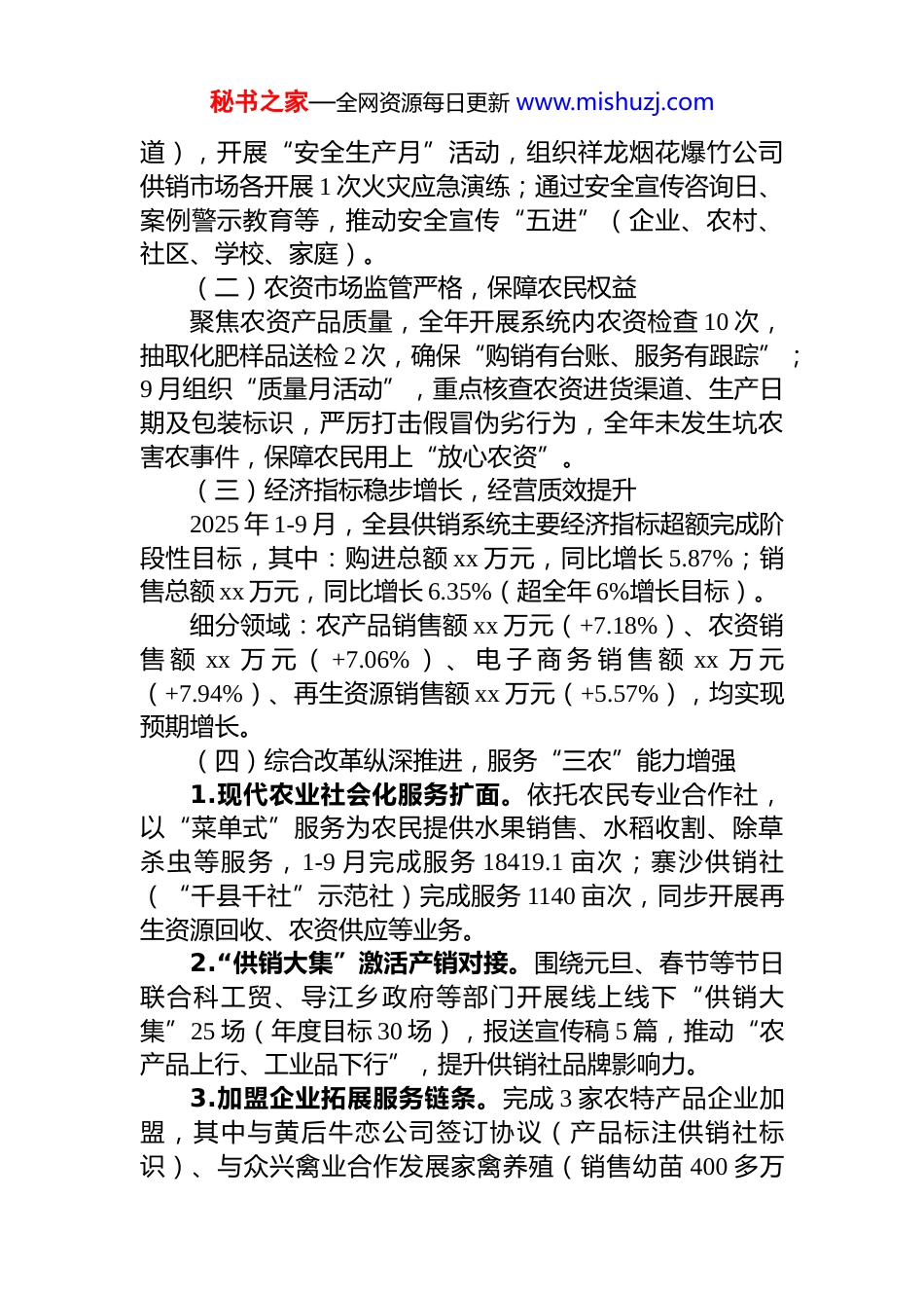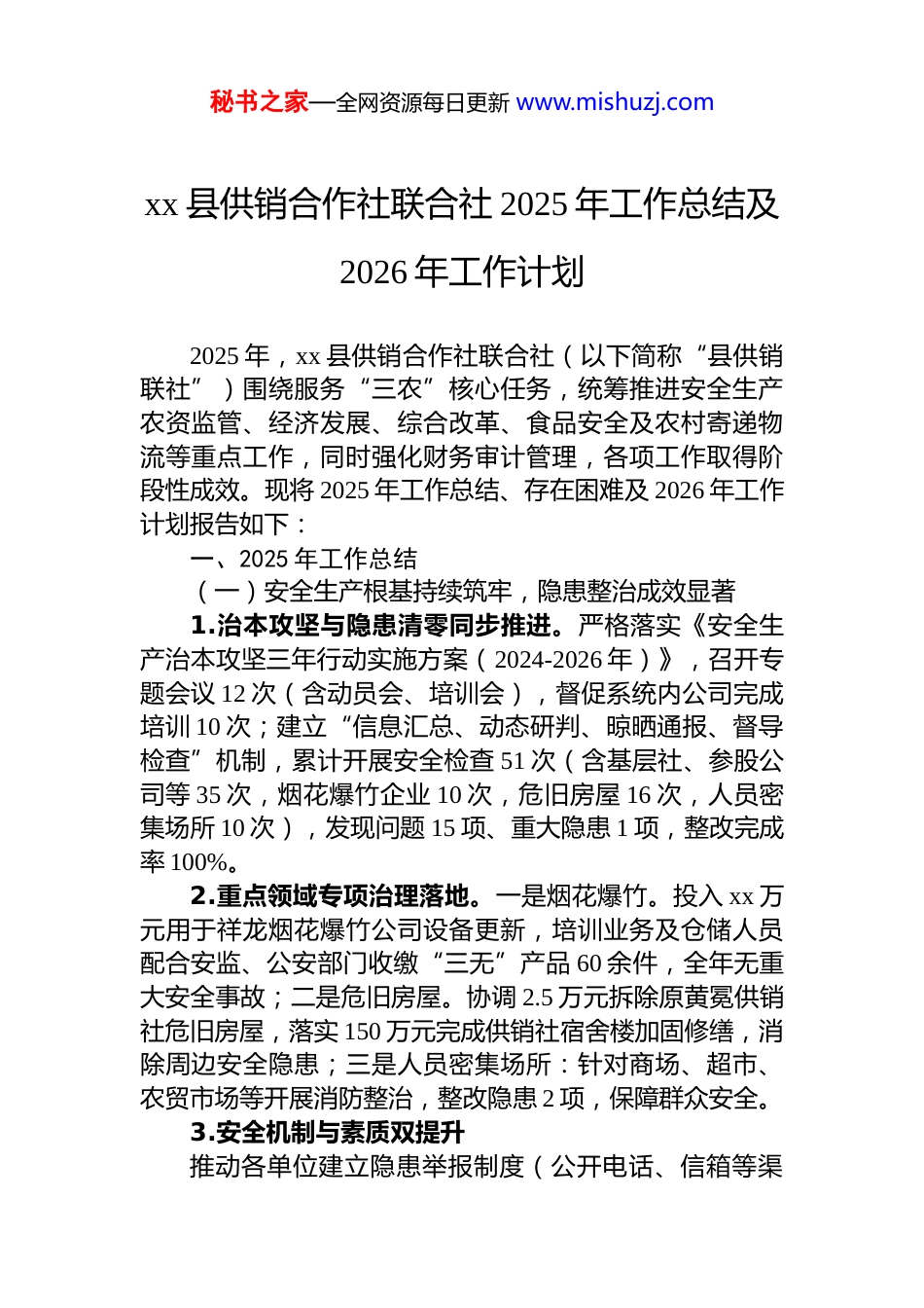 秘书之家—全网资源每日更新 www.mishuzj.comxx 县供销合作社联合社 2025 年工作总结及2026 年工作计划2025 年,xx 县供销合作社联合社(以下简称“县供销联社”)围绕服务“三农”核心任务,统筹推进安全生产农资监管、经济发展、综合改革、食品安全及农村寄递物流等重点工作,同时强化财务审计管理,各项工作取得阶段性成效。现将 2025 年工作总结、存在困难及 2026 年工作计划报告如下:一、2025 年工作总结(一)安全生产根基持续筑牢,隐患整治成效显著1.治本攻坚与隐患清零同步推进。严格落实《安全生产治本攻坚三年行动实施方案(2024-2026 年)》,召开专题会议 12 次(含动员会、培训会),督促系统内公司完成培训 10 次;建立“信息汇总、动态研判、晾晒通报、督导检查”机制,累计开展安全检查 51 次(含基层社、参股公司等 35 次,烟花爆竹企业 10 次,危旧房屋 16 次,人员密集场所 10 次),发现问题 15 项、重大隐患 1 项,整改完成率 100%。2.重点领域专项治理落地。一是烟花爆竹。投入 xx 万元用于祥龙烟花爆竹公司设备更新,培训业务及仓储人员配合安监、公安部门收缴“三无”产品 60 余件,全年无重大安全事故;二是危旧房屋。协调 2.5 万元拆除原黄冕供销社危旧房屋,落实 150 万元完成供销社宿舍楼加固修缮,消除周边安全隐患;三是人员密集场所:针对商场、超市、农贸市场等开展消防整治,整改隐患 2 项,保障群众安全。3.安全机制与素质双提升推动各单位建立隐患举报制度(公开电话、信箱等渠秘书之家—全网资源每日更新 www.mishuzj.com道),开展“安全生产月”活动,组织祥龙烟花爆竹公司供销市场各开展 1 次火灾应急演练;通过安全宣传咨询日、案例警示教育等,推动安全宣传“五进”(企业、农村、社区、学校、家庭)。(二)农资市场监管严格,保障农民权益聚焦农资产品质量,全年开展系统内农资检查 10 次,抽取化肥样品送检 2 次,确保“购销有台账、服务有跟踪”;9 月组织“质量月活动”,重点核查农资进货渠道、生产日期及包装标识,严厉打击假冒伪劣行为,全年未发生坑农害农事件,保障农民用上“放心农资”。(三)经济指标稳步增长,经营质效提升2025 年 1-9 月,全县供销系统主要经济指标超额完成阶段性目标,其中:购进总额 xx 万元,同比增长 5.87%;销售总额 xx 万元,同比增长 6.35%(超全年 6%增长目标)。细分领域:农产品销售额 xx 万元(+7.18%)、农资销售 额 xx 万 元 ( +7.06% ) 、 电 子 商 务 销 售 额 xx 万 元(+7.94%)、再生资源销售额 xx 万元(+5.57%),均实现预期增长。(四)综合改革纵深推进,服务“三农”能力增强1.现代农业社会化服务扩面。依托农民专业合作社,以“菜单式”服务为农民提供水果销售、水稻收割、除草杀虫等服务,1-9 月完成服务 18419.1 亩次;寨沙供销社(“千县千社”示范社)完成服务 1140 亩次,同步开展再生资源回收、农资供应等业务。2.“供销大集”激活产销对接。围绕元旦、春节等节日联合科工贸、导江乡政府等部门开展线上线下“供销大集”25 场(年度目标 30 场),报送宣传稿 5 篇,推动“农产品上行、工业品下行”,提升供销社品牌影响力。3.加盟企业拓展服务链条。完成 3 家农特产品企业加盟,其中与黄后牛恋公司签订协议(产品标注供销社标识)、与众兴禽业合作发展家禽养殖(销售幼苗 400 多万秘书之家—全网资源每日更新 www.mishuzj.com只),并对接中明农机合作社拓宽服务渠道;完成农特产品企业备选名单上报,为粤桂农产品展销会做准备。(五)食品安全监管到位,风险隐患清零一是健全组织体系。成立以主要领导为组长的食品安全工作小组,落实“管行业必管安全”责任。二是强化排查与宣传:开展系统内食品安全检查 12 次,全覆盖排查基层社、超市等食品经营主体,严禁售卖“三无”及过期食品;发放宣传资料、播放标语,结合创城开展科普教育,提升公众食品安全素养。(六)农村寄递物流提质,打通双向流通渠道1.网络建设全域覆盖。新引进安能物流,县级配送中心品牌快递...