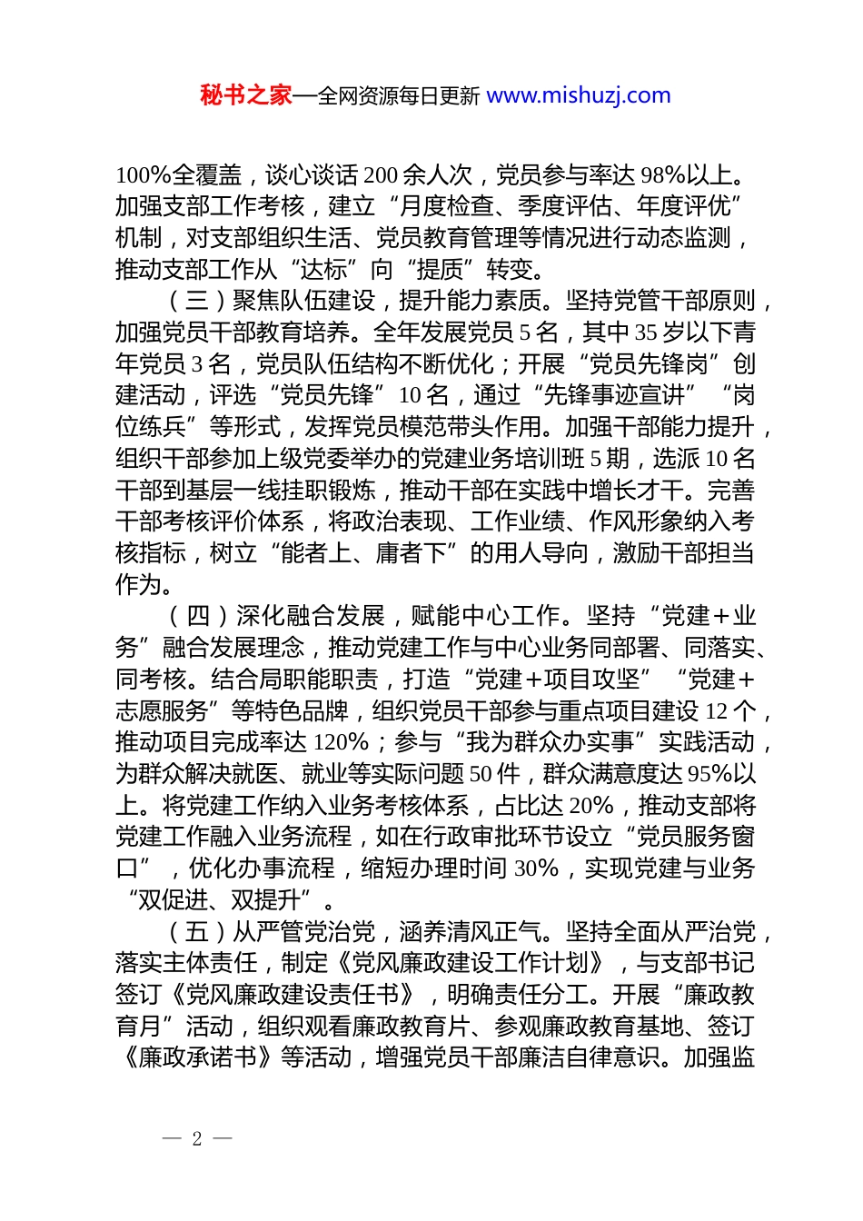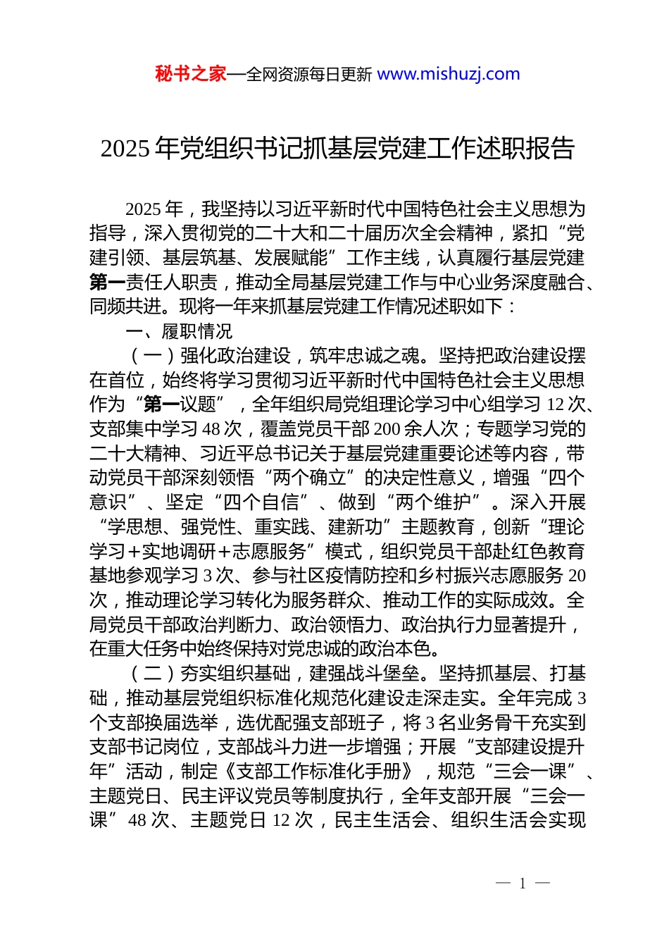 秘书之家—全网资源每日更新 www.mishuzj.com2025 年党组织书记抓基层党建工作述职报告2025 年,我坚持以习近平新时代中国特色社会主义思想为指导,深入贯彻党的二十大和二十届历次全会精神,紧扣“党建引领、基层筑基、发展赋能”工作主线,认真履行基层党建第一责任人职责,推动全局基层党建工作与中心业务深度融合、同频共进。现将一年来抓基层党建工作情况述职如下:一、履职情况(一)强化政治建设,筑牢忠诚之魂。坚持把政治建设摆在首位,始终将学习贯彻习近平新时代中国特色社会主义思想作为“第一议题”,全年组织局党组理论学习中心组学习 12 次、支部集中学习 48 次,覆盖党员干部 200 余人次;专题学习党的二十大精神、习近平总书记关于基层党建重要论述等内容,带动党员干部深刻领悟“两个确立”的决定性意义,增强“四个意识”、坚定“四个自信”、做到“两个维护”。深入开展“学思想、强党性、重实践、建新功”主题教育,创新“理论学习+实地调研+志愿服务”模式,组织党员干部赴红色教育基地参观学习 3 次、参与社区疫情防控和乡村振兴志愿服务 20次,推动理论学习转化为服务群众、推动工作的实际成效。全局党员干部政治判断力、政治领悟力、政治执行力显著提升,在重大任务中始终保持对党忠诚的政治本色。(二)夯实组织基础,建强战斗堡垒。坚持抓基层、打基础,推动基层党组织标准化规范化建设走深走实。全年完成 3个支部换届选举,选优配强支部班子,将 3 名业务骨干充实到支部书记岗位,支部战斗力进一步增强;开展“支部建设提升年”活动,制定《支部工作标准化手册》,规范“三会一课”、主题党日、民主评议党员等制度执行,全年支部开展“三会一课”48 次、主题党日 12 次,民主生活会、组织生活会实现— 1 —秘书之家—全网资源每日更新 www.mishuzj.com100%全覆盖,谈心谈话 200 余人次,党员参与率达 98%以上。加强支部工作考核,建立“月度检查、季度评估、年度评优”机制,对支部组织生活、党员教育管理等情况进行动态监测,推动支部工作从“达标”向“提质”转变。(三)聚焦队伍建设,提升能力素质。坚持党管干部原则,加强党员干部教育培养。全年发展党员 5 名,其中 35 岁以下青年党员 3 名,党员队伍结构不断优化;开展“党员先锋岗”创建活动,评选“党员先锋”10 名,通过“先锋事迹宣讲”“岗位练兵”等形式,发挥党员模范带头作用。加强干部能力提升,组织干部参加上级党委举办的党建业务培训班 5 期,选派 10 名干部到基层一线挂职锻炼,推动干部在实践中增长才干。完善干部考核评价体系,将政治表现、工作业绩、作风形象纳入考核指标,树立“能者上、庸者下”的用人导向,激励干部担当作为。(四)深化融合发展,赋能中心工作。坚持“党建+业务”融合发展理念,推动党建工作与中心业务同部署、同落实、同考核。结合局职能职责,打造“党建+项目攻坚”“党建+志愿服务”等特色品牌,组织党员干部参与重点项目建设 12 个,推动项目完成率达 120%;参与“我为群众办实事”实践活动,为群众解决就医、就业等实际问题 50 件,群众满意度达 95%以上。将党建工作纳入业务考核体系,占比达 20%,推动支部将党建工作融入业务流程,如在行政审批环节设立“党员服务窗口”,优化办事流程,缩短办理时间 30%,实现党建与业务“双促进、双提升”。(五)从严管党治党,涵养清风正气。坚持全面从严治党,落实主体责任,制定《党风廉政建设工作计划》,与支部书记签订《党风廉政建设责任书》,明确责任分工。开展“廉政教育月”活动,组织观看廉政教育片、参观廉政教育基地、签订《廉政承诺书》等活动,增强党员干部廉洁自律意识。加强监— 2 —秘书之家—全网资源每日更新 www.mishuzj.com督检查,全年开展廉政检查 6 次,重点检查干部作风、资金使用、项目审批等方面,发现问题 3 个,均督促整改到位。严格执行纪律规定及其实施细则,坚决反对“四风”,全年未发生违规违纪问题,营造了风清气正的政治生态。二、存在问题和下一步工作打算回顾一年来的工作,虽然取得一定成绩,但也存在一些不足:一...