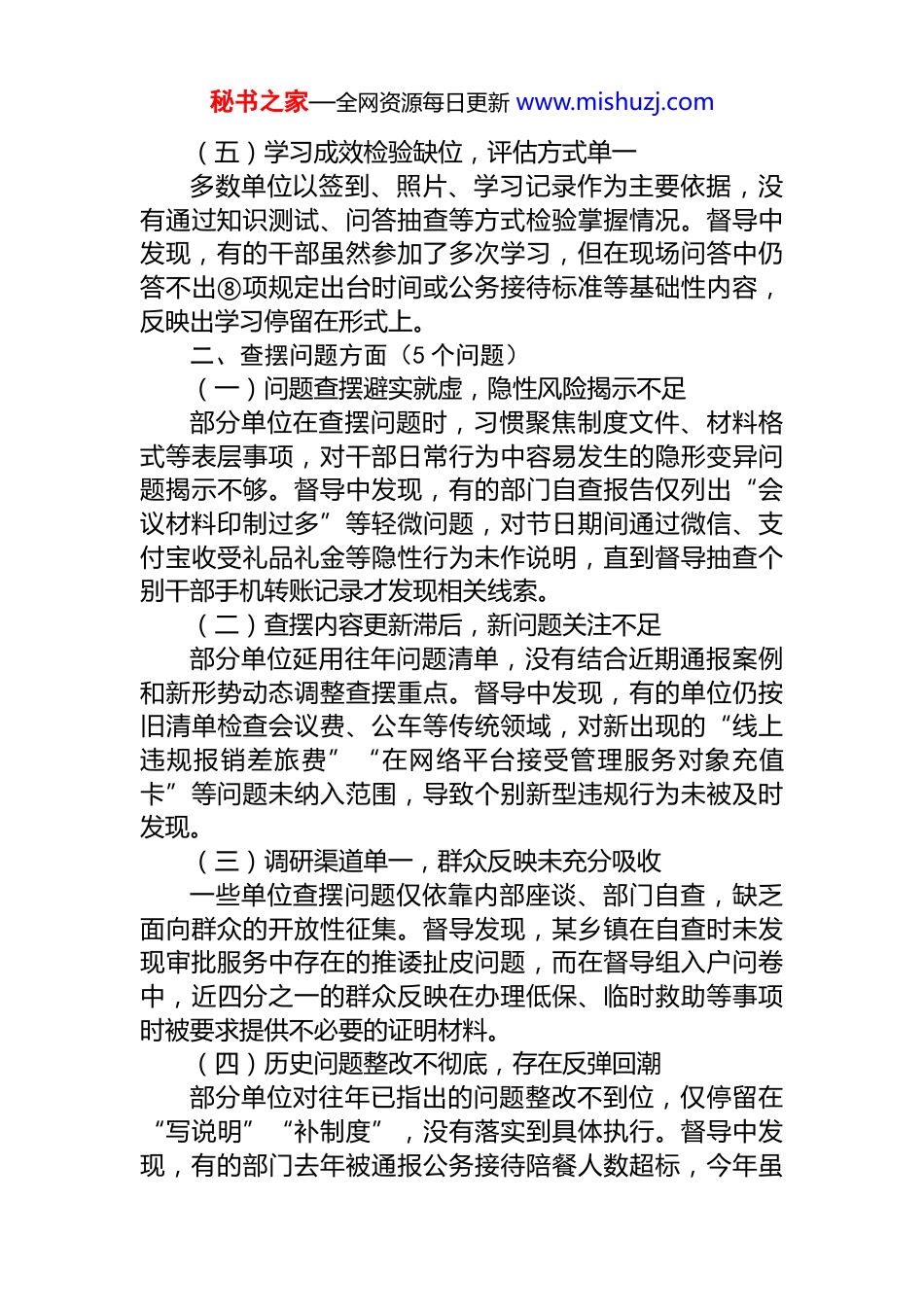 秘书之家—全网资源每日更新 www.mishuzj.com督导组专题“回头看”督导发现问题清单一、学习研讨方面(5 个问题)(一)学习计划不够细化,重点条款覆盖不全部分单位虽然制定了年度学习安排,但在⑧项规定精神专题学习上缺少分阶段、分专题的具体计划,对实施细则中的细化条款覆盖不足。督导中发现,个别单位在季度学习中只安排了一次集中授课,且偏重理论概述,没有对公务接待、公务用车、公务差旅等与本系统密切相关的条款逐条解读,导致一线干部对“禁止接受管理服务对象宴请”等要求掌握不清。(二)研讨缺乏针对性,风险剖析不深入部分单位在专题研讨中侧重表态发言、经验交流,缺乏围绕本职岗位潜在违规风险的具体分析。例如,某审批服务部门在研讨中仅强调“改进工作作风”,但没有结合收费环节、审批环节可能存在的礼品礼金、吃请等风险进行剖析,致使后续仍出现个别工作人员收受礼品的情况。(三)学习覆盖不均衡,基层人员参与不足在学习覆盖面上,领导干部参加比例高,基层工作人员参与度偏低。督导中发现,有的单位虽然多次组织专题学习,但直接面对群众的服务岗位因值班值守、工作冲突等原因,参训率明显偏低,甚至存在个别人员由同事代签的情况,部分干部对“违规操办婚丧喜庆”等规定仍不清楚具体标准。(四)学用衔接不紧密,成果转化措施缺位一些单位学习后缺乏配套的制度优化和流程细化,未将学习成果固化到日常管理中。比如,有的部门在学习中提出要“精简会议”,但会后未建立会议审核和时间控制机制,一个季度内仍召开了多场内容重复、可合并的会议。秘书之家—全网资源每日更新 www.mishuzj.com(五)学习成效检验缺位,评估方式单一多数单位以签到、照片、学习记录作为主要依据,没有通过知识测试、问答抽查等方式检验掌握情况。督导中发现,有的干部虽然参加了多次学习,但在现场问答中仍答不出⑧项规定出台时间或公务接待标准等基础性内容,反映出学习停留在形式上。二、查摆问题方面(5 个问题)(一)问题查摆避实就虚,隐性风险揭示不足部分单位在查摆问题时,习惯聚焦制度文件、材料格式等表层事项,对干部日常行为中容易发生的隐形变异问题揭示不够。督导中发现,有的部门自查报告仅列出“会议材料印制过多”等轻微问题,对节日期间通过微信、支付宝收受礼品礼金等隐性行为未作说明,直到督导抽查个别干部手机转账记录才发现相关线索。(二)查摆内容更新滞后,新问题关注不足部分单位延用往年问题清单,没有结合近期通报案例和新形势动态调整查摆重点。督导中发现,有的单位仍按旧清单检查会议费、公车等传统领域,对新出现的“线上违规报销差旅费”“在网络平台接受管理服务对象充值卡”等问题未纳入范围,导致个别新型违规行为未被及时发现。(三)调研渠道单一,群众反映未充分吸收一些单位查摆问题仅依靠内部座谈、部门自查,缺乏面向群众的开放性征集。督导发现,某乡镇在自查时未发现审批服务中存在的推诿扯皮问题,而在督导组入户问卷中,近四分之一的群众反映在办理低保、临时救助等事项时被要求提供不必要的证明材料。(四)历史问题整改不彻底,存在反弹回潮部分单位对往年已指出的问题整改不到位,仅停留在“写说明”“补制度”,没有落实到具体执行。督导中发现,有的部门去年被通报公务接待陪餐人数超标,今年虽秘书之家—全网资源每日更新 www.mishuzj.com出台了新制度,但检查账簿发现仍有多次陪餐超标情况。(五)“关键少数”监督查摆深度不够在查摆问题中,有的单位重点放在普通干部,对“一把手”和班子成员监督不到位。督导中发现,某局自查报告列出科室加班餐超标等情况,但未涉及局领导违规使用公车、在私人会所接待客商等问题,相关情况最后还是由外部巡察发现。三、集中整治方面(5 个问题)(一)整治范围宽泛,重点领域用力不足部分单位在集中整治中面面俱到、平均用力,对⑧项规定精神涉及的高风险环节缺乏聚焦,导致整治成效分散督导中发现,有的部门整治清单涵盖十余个事项,但对公务接待、公车管理、差旅报销等重点领域仅停留在原则性要求,缺少细化措施和明确的整改时限。(二)措施执行不彻底,问题整改存在...