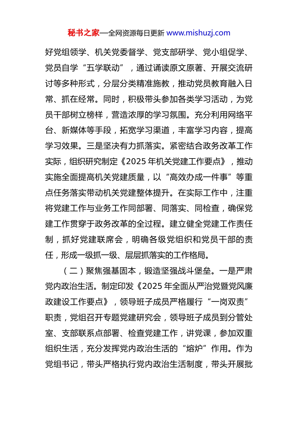 秘书之家—全网资源每日更新 www.mishuzj.com市直单位党组书记 2025 年抓基层党建工作述职报告 今年以来,我坚持坚持以习近平新时代中国特色社会主义思想为指导,贯彻习近平总书记关于机关党建的重要指示精神,紧紧牵住责任制这个“牛鼻子”,坚持“四个聚焦”,从严落实机关党建第一责任人责任,不断开创以高质量机关党建促进政务改革事业高质量发展的新局面。一、主要工作情况(一)聚焦政治领航,筑牢对党绝对忠诚。作为党组书记,我深知政治建设是机关党建的核心,是确保各项工作正确政治方向的根本保证。一是旗帜鲜明讲政治。牢牢把握政治机关本质属性,始终把党的政治建设摆在首位,自觉把讲政治融入“四高四争先”“高效办成一件事”、优化营商环境等中心工作。通过各种形式的教育引导,使党员干部深刻领会“两个确立”的决定性意义,将其转化为做到“两个维护”的高度自觉。在日常工作中,要求党员干部时刻保持政治敏锐性和政治鉴别力,不折不扣地贯彻落实党的理论和路线方针政策,确保各项决策部署落地生根。二是持之以恒重学习。主持制定了《2025 年党组理论学习中心组的学习计划》《党支部月学习计划》等,用秘书之家—全网资源每日更新 www.mishuzj.com好党组领学、机关党委督学、党支部研学、党小组促学、党员自学“五学联动”,通过诵读原文原著、开展交流研讨等多种形式,分层分类精准施教,推动党员教育融入日常、抓在经常。同时,积极带头参加各类学习活动,为党员干部树立榜样,营造浓厚的学习氛围。充分利用网络平台、新媒体等手段,拓宽学习渠道,丰富学习内容,提高学习效果。三是坚决有力抓落实。紧密结合政务改革工作实际,组织研究制定《2025 年机关党建工作要点》,推动实施全面提高机关党建质量,以“高效办成一件事”等重点任务落实带动机关党建整体提升。在实际工作中,注重将党建工作与业务工作同部署、同落实、同检查,确保党建工作贯穿于政务改革的全过程。建立健全党建工作责任制,抓好党建联席会,明确各级党组织和党员干部的责任,形成一级抓一级、层层抓落实的工作格局。(二)聚焦强基固本,锻造坚强战斗堡垒。一是严肃党内政治生活。制定印发《2025 年全面从严治党暨党风廉政建设工作要点》,领导班子成员严格履行“一岗双责”职责,党组召开专题党建研究会,领导班子成员到分管处室、支部联系点部署、检查党建工作,讲党课,参加双重组织生活,充分发挥党内政治生活的“熔炉”作用。作为党组书记,带头严格执行党内政治生活制度,带头开展批秘书之家—全网资源每日更新 www.mishuzj.com评和自我批评,带头参加组织生活,为党员干部树立榜样。加强对党内政治生活的监督和检查,确保各项制度落到实处。二是全面推进“四强”党支部建设。严格落实党支部标准化规范化建设要求,夯实月考核、季星级评定工作机制,严格落实“三会一课”等组织生活制度。常态化组织开展 32 家政务服务窗口单位练兵比武、“我陪群众走流程”、政务服务礼仪标准培训等活动,深化“最多跑一次”改革,切实放大机关党建对外展示“窗口”效应,不断激发党建工作活力。政务大厅先后获得“青年文明号”“文明窗口单位”“方志文化教育基地”、政务服务“先进单位”等荣誉。推进“四强”党支部建设过程中,注重加强党支部书记的培训和指导,提高综合素质和工作能力,充分发挥党支部的战斗堡垒作用。三是加强党员干部教育管理监督。发挥“支部管到人头”的作用,把管行为和管思想、管住“八小时内”和管好“八小时外”贯通起来,加强常态化思想教育和针对性谈心谈话,引导党员干部从政治上想问题、作判断。定期与党员干部开展谈心谈话,了解思想动态和工作生活情况,及时发现问题并加以解决。建立健全党员干部教育管理监督制度,加强对党员干部的日常管理和监督,确保始终沿着正确的方向前进。(三)聚焦中心大局,推动党建业务深度融合。一是秘书之家—全网资源每日更新 www.mishuzj.com扎实开展“书记项目”。作为局党组书记,深入调研“人工智能+政务服务”场景应用工作,破解政务服务“流程繁、跑腿多、效率低”难题,亲自参与“书记项目”选题立项、实施,...