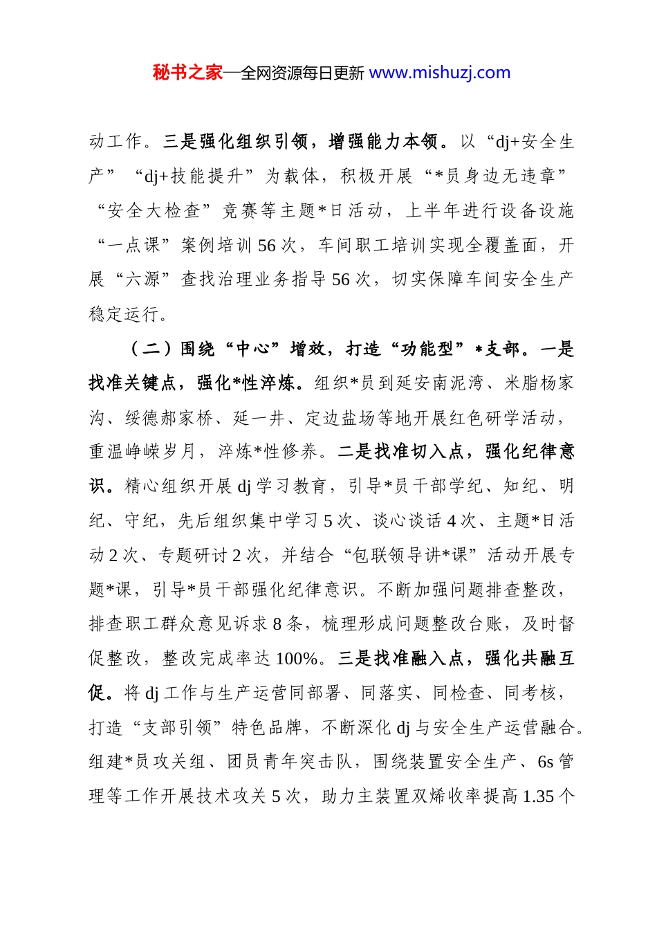 秘书之家—全网资源每日更新 www.mishuzj.com以高质量 dj 助推高质量发展一、支部基本情况xxxx 石油(集团)有限责任公司 xx 化烯烃中心第一*支部成立于 2017 年 10 月,现有*员 33 名。近年来,*支部探索了“四心四型”dj 工作法(四心即初心、中心、齐心、暖心,四型即学习型、功能型、堡垒型、服务型),将 dj 工作与生产运营深度融合、同频共振,形成了“dj 引领聚合力 融合赋能促生产”的良好局面,先后被授予“xx 省青年文明号”“xx 省能源化学地质系统工人先锋号”“集团公司先进基层*组织”等荣誉称号。二、主要做法及成效(一)不忘“初心”铸魂,打造“学习型”*支部。一是强化政治引领,凝聚思想共识。始终把学习贯彻**************思想作为首要政治任务,严格落实“第一议题”制度,将理论学习、安全生产、绿色环保和高质量发展等相互贯通,确保各项工作任务有机融合、一体推进。二是强化思想引领,夯实理论根基。坚持“支部集中学+*员带头学+交流研讨学+读书分享学+个人自学”五学模式,认真学习贯彻*的二十大和*的二十届三中全会精神,用*的创新理论武装头脑、指导实践、推秘书之家—全网资源每日更新 www.mishuzj.com动工作。三是强化组织引领,增强能力本领。以“dj+安全生产”“dj+技能提升”为载体,积极开展“*员身边无违章”“安全大检查”竞赛等主题*日活动,上半年进行设备设施“一点课”案例培训 56 次,车间职工培训实现全覆盖面,开展“六源”查找治理业务指导 56 次,切实保障车间安全生产稳定运行。(二)围绕“中心”增效,打造“功能型”*支部。一是找准关键点,强化*性淬炼。组织*员到延安南泥湾、米脂杨家沟、绥德郝家桥、延一井、定边盐场等地开展红色研学活动,重温峥嵘岁月,淬炼*性修养。二是找准切入点,强化纪律意识。精心组织开展 dj 学习教育,引导*员干部学纪、知纪、明纪、守纪,先后组织集中学习 5 次、谈心谈话 4 次、主题*日活动 2 次、专题研讨 2 次,并结合“包联领导讲*课”活动开展专题*课,引导*员干部强化纪律意识。不断加强问题排查整改,排查职工群众意见诉求 8 条,梳理形成问题整改台账,及时督促整改,整改完成率达 100%。三是找准融入点,强化共融互促。将 dj 工作与生产运营同部署、同落实、同检查、同考核,打造“支部引领”特色品牌,不断深化 dj 与安全生产运营融合。组建*员攻关组、团员青年突击队,围绕装置安全生产、6s 管理等工作开展技术攻关 5 次,助力主装置双烯收率提高 1.35 个秘书之家—全网资源每日更新 www.mishuzj.com百分点,为公司增加创收 9175.74 万元。(三)致力“齐心”服务,打造“堡垒型”*支部。一是抓实主体责任,让齐抓共管内化为工作合力。制定“一台账四清单”(即一个支部标准化规范化推进工作计划台账,包含全面从严治*任务清单、理论学习计划清单、主题*日活动清单、*员教育培训清单的四项清单),对标对表、挂图作战,做到“照单”抓工作、“对单”查落实。二是抓好制度执行,将制度优势外化为治理效能。认真落实“三会一课”、换届调整、专题研讨、主题*日、组织生活会、谈心谈话、民主评议、发展*员、*费收缴等基本制度,让*内制度成为支部建设的标尺。三是抓牢清廉建设,使规范运行转化为发展动力。组织*员干部观看《两面人生》《金钱“奴隶”》《永远吹冲锋号》等警示教育片,并通过会议安排、发文要求、廉洁短信提醒等方式,不断强化*员干部自我防范能力。严格执行民主集中制,涉及专项奖金分配、人员竞聘上岗等职工切身利益问题,均通过支委会研究讨论并公示,进一步前置廉政防线。(四)聚焦“暖心”提质,打造“服务型”*支部。一是实施“1+n”暖心工程。通过政治生日一声祝福+n 种仪式、志愿服务一支队伍+n 项活动、“急难愁盼”一个码+n 种办理的“1+n”暖心服务,将组织关怀送到员工心坎上,对职工群众反秘书之家—全网资源每日更新 www.mishuzj.com映的装置抢修期间通勤不便利、加班兑现和物资分配不均等问题及时解决。二是实施“人才”蓄水工程。通过传帮带等形式,主动给年轻人“压担子”、为青年建功“搭台子...