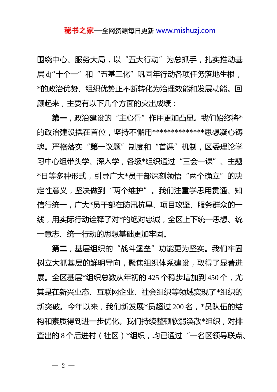 秘书之家—全网资源每日更新 www.mishuzj.com在 xx 区 dj 工作专题汇报会上的讲话同志们:今天,我们在这里召开全区 dj 工作专题汇报会,主要任务是深入学习贯彻******关于*的建设的重要思想,全面落实基层dj“十个一”和“五基三化”巩固年行动工作要求,总结回顾2025 年以来的 dj 工作,深入分析当前我们面临的新形势与新挑战,并就下一步如何推动全区 dj 工作迈上新台阶进行研究部署。会前,我实地走访了 xx 小区、xx 科技公司和 xx 村,详细了解了城市社区 dj、新兴领域“两个覆盖”问题整改以及农村基层*组织建设的最新进展。刚才,xx 镇、xx 街道和区委“两新”工委的负责同志分别作了现场汇报,其他几个单位也提交了书面报告。从调研和汇报的情况看,大家的工作思路清晰、措施有力、成效显著,我深感欣慰。这充分表明,今年以来,全区各级*组织抓 dj 的政治自觉和行动自觉都在持续增强,大抓基层的鲜明导向得到了有效贯彻。下面,结合我的调研和思考,我讲三点意见。一、肯定成绩,总结经验,在砥砺奋进中增强信心决心2025 年是全面贯彻落实*的二十大精神的关键之年,也是我区推进高质量发展的攻坚之年。一年来,全区各级*组织紧紧— 1 —秘书之家—全网资源每日更新 www.mishuzj.com围绕中心、服务大局,以“五大行动”为总抓手,扎实推动基层 dj“十个一”和“五基三化”巩固年行动各项任务落地生根,*的政治优势、组织优势正不断转化为治理效能和发展动能。回顾起来,主要有以下几个方面的突出成绩:第一,政治建设的“主心骨”作用更加凸显。我们始终将*的政治建设摆在首位,坚持不懈用**************思想凝心铸魂。严格落实“第一议题”制度和“首课”机制,区委理论学习中心组带头学、深入学,各级*组织通过“三会一课”、主题*日等多种形式,引导广大*员干部深刻领悟“两个确立”的决定性意义,坚决做到“两个维护”。我们注重学思用贯通、知信行统一,广大*员干部在防汛抗旱、项目攻坚、服务群众的一线,用实际行动诠释了对*的绝对忠诚,全区上下统一思想、统一意志、统一行动的思想基础更加牢固。第二,基层组织的“战斗堡垒”功能更为坚实。我们牢固树立大抓基层的鲜明导向,聚焦组织体系建设,取得了显著进展。全区基层*组织总数从年初的 425 个稳步增加到 450 个,尤其是在新兴业态、互联网企业、社会组织等领域实现了*组织的新突破。今年以来,我们新发展*员超过 200 名,*员队伍的结构和素质得到进一步优化。我们持续整顿软弱涣散*组织,对排查出的 8 个后进村(社区)*组织,均已通过“一名区领导联点、— 2 —秘书之家—全网资源每日更新 www.mishuzj.com一个区直单位包抓、一名第一书记主抓”的“三个一”机制完成整顿提升,组织力、凝聚力和战斗力显著增强。第三,dj 引领的“强大引擎”动能更趋强劲。我们深刻认识到,dj 工作如果脱离了经济社会发展大局,就会成为“无源之水、无本之木”。因此,我们坚持把 dj 工作融入全区发展各方面、全过程。在推动产业发展上,我们探索“*支部+公司+合作社+农户”的模式,xx 镇的茶叶产业、xx 镇的特色水果种植,都因为有了坚强的*组织引领,形成了规模效应,有效带动了村集体和村民“双增收”。据初步统计,2025 年全区村级集体经济总收入预计将历史性突破 8000 万元,同比增长超过15%,所有行政村集体经济收入均稳定在 10 万元以上。在引领基层治理上,我们全面深化 dj 引领下的网格化治理,完善“街长制”,推动资源、服务、管理向网格下沉。今年以来,全区3000 余名网格员共上报并解决群众急难愁盼问题 7000 余件,办结率达到 98%,人民群众的获得感、幸福感、安全感持续提升。在推进重大项目上,我们坚持把*支部建在项目上、*旗插在工地上,xx 产业园区、xx 重大基础设施项目等一批重点工程,都设立了临时*支部,*员突击队、*员先锋岗在攻坚克难中发挥了中流砥柱作用,确保了项目建设的“加速度”。第四,干部队伍的“示范标杆”形象更加鲜明。我们坚持— 3 —秘书之家—全网资源每日更新 www.mishuzj.com严管和厚爱结合、激励和约束并重,着力...