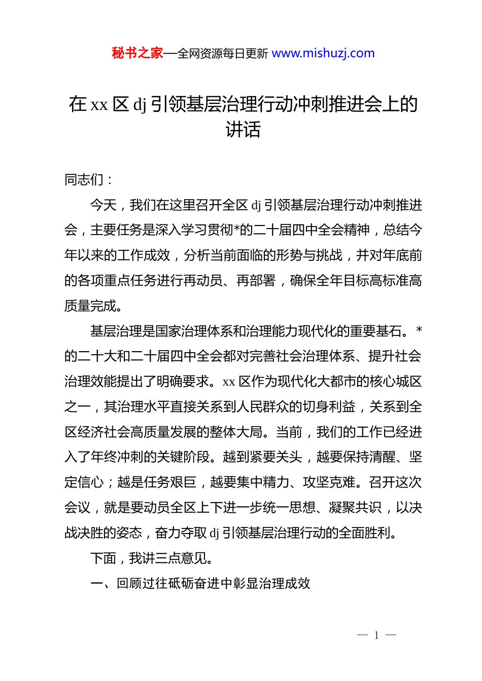 秘书之家—全网资源每日更新 www.mishuzj.com在 xx 区 dj 引领基层治理行动冲刺推进会上的讲话同志们:今天,我们在这里召开全区 dj 引领基层治理行动冲刺推进会,主要任务是深入学习贯彻*的二十届四中全会精神,总结今年以来的工作成效,分析当前面临的形势与挑战,并对年底前的各项重点任务进行再动员、再部署,确保全年目标高标准高质量完成。基层治理是国家治理体系和治理能力现代化的重要基石。*的二十大和二十届四中全会都对完善社会治理体系、提升社会治理效能提出了明确要求。xx 区作为现代化大都市的核心城区之一,其治理水平直接关系到人民群众的切身利益,关系到全区经济社会高质量发展的整体大局。当前,我们的工作已经进入了年终冲刺的关键阶段。越到紧要关头,越要保持清醒、坚定信心;越是任务艰巨,越要集中精力、攻坚克难。召开这次会议,就是要动员全区上下进一步统一思想、凝聚共识,以决战决胜的姿态,奋力夺取 dj 引领基层治理行动的全面胜利。下面,我讲三点意见。一、回顾过往砥砺奋进中彰显治理成效— 1 —秘书之家—全网资源每日更新 www.mishuzj.com今年以来,在市委、市政府的坚强领导下,在市委组织部、市委社会工作部的精心指导下,全区各级*组织和广大*员干部担当作为、锐意进取,推动 dj 引领基层治理行动取得了可圈可点、厚重扎实的成绩。这些成绩不仅体现在数据和荣誉上,更体现在群众的口碑里、城市的面貌中。(一)系统性重塑,治理体系的“四梁八柱”更加稳固基础不牢,地动山摇。我们深刻认识到,有效的基层治理必须建立在科学、高效的组织体系之上。为此,我们持续深化“一核多圈、多委合一”工作体系建设,取得了实质性进展。这个体系的核心,就是牢牢确立街道社区*组织在基层治理中的领导核心地位,确保*的全面领导贯穿于基层治理的各方面和全过程。“多圈”,则是指以社区为基础,构建起覆盖驻区单位、业委会、物业公司、社会组织、新就业群体等多方力量的治理圈、服务圈和朋友圈。通过“多委合一”的机制创新,我们有效整合了原本分散的议事协调机构,形成了“大事共议、实事共办、难事共解”的强大合力。目前,覆盖全区的四级组织链条已经全面建成,从区级统筹、街道主导,到社区主抓、网格主战,指挥体系更加灵敏,责任传导更加顺畅,为应对各类风险挑战、服务群众需求提供了坚实的组织保障。(二)实践性创造,服务发展的“引擎动能”更加强劲— 2 —秘书之家—全网资源每日更新 www.mishuzj.com行动是最好的语言,实干是最好的承诺。我们深入开展“xx 十干·善作善成”主题实践活动,将其作为推动高质量发展和提升基层治理水平的有力抓手。全区上下围绕中心工作,聚焦群众关切,梳理出 258 项重点任务和 15 项重点民生项目,逐一明确责任单位、完成时限和检验标准。截至目前,通过这项活动,全区累计推动解决历史遗留问题超过 300 项,化解各类矛盾纠纷近万件,办理教育、医疗、养老等民生实事超过 2000件。这组数据的背后,是群众获得感、幸福感、安全感的实实在在的提升。特别是在新就业群体 dj 工作方面,我们创新打造了一批“友好场景”,为快递员、外卖配送员、网约车司机等群体提供休息、充电、饮水、学习的温馨港湾。这一做法不仅解决了新就业群体的现实困难,更让他们感受到了*组织的关怀和城市的温度,相关经验成效得到了上级部门和主流媒体的一致认可。(三)品牌化建设,社会协同的“多元活力”更加彰明现代化的基层治理,绝非*委政府的“独角戏”,而是社会各方共同参与的“大合唱”。我们积极探索 dj 引领社会力量参与治理的新路径。例如,在行业协会商会中,我们精心打造的“xx 聚力”特色 dj 品牌,通过强化政治引领、搭建服务平台、引导行业自律,有效激发了商会协会在经济发展、社会服务中— 3 —秘书之家—全网资源每日更新 www.mishuzj.com的积极作用。该品牌案例荣获全市基层思想政治工作案例一等奖,充分证明了其价值和影响力。在精神文明建设领域,我们坚持 dj 带群建,广泛动员志愿者、社区居民、沿街商户等力量参与文明城区创建,成功蝉联“全国文明城区”桂冠。在...