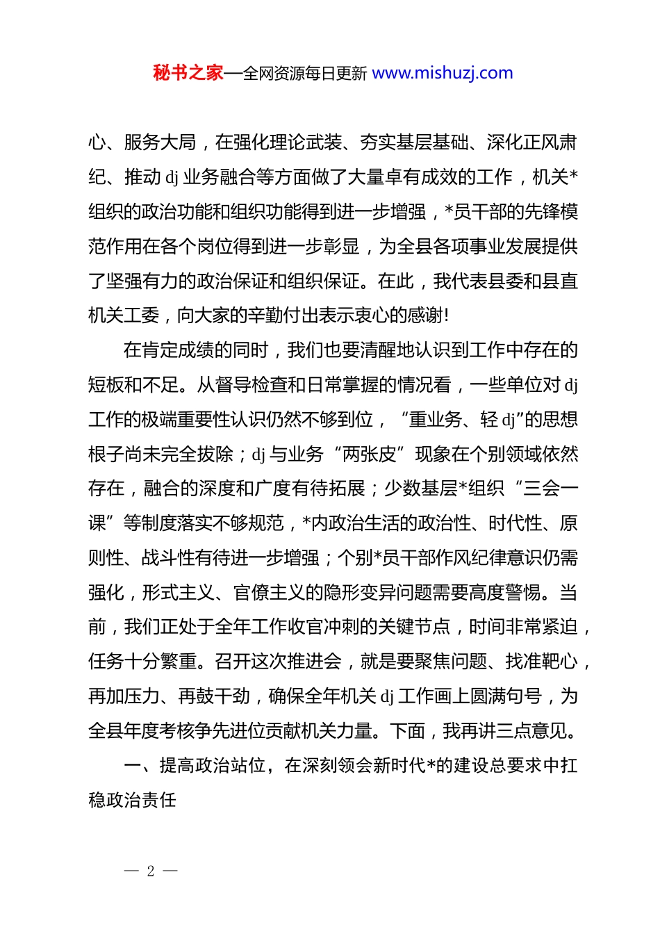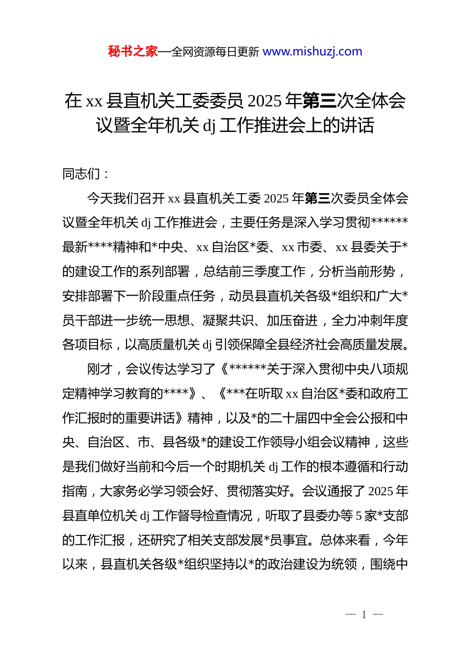 秘书之家—全网资源每日更新 www.mishuzj.com在 xx 县直机关工委委员 2025 年第三次全体会议暨全年机关 dj 工作推进会上的讲话同志们:今天我们召开 xx 县直机关工委 2025 年第三次委员全体会议暨全年机关 dj 工作推进会,主要任务是深入学习贯彻******最新****精神和*中央、xx 自治区*委、xx 市委、xx 县委关于*的建设工作的系列部署,总结前三季度工作,分析当前形势,安排部署下一阶段重点任务,动员县直机关各级*组织和广大*员干部进一步统一思想、凝聚共识、加压奋进,全力冲刺年度各项目标,以高质量机关 dj 引领保障全县经济社会高质量发展。刚才,会议传达学习了《******关于深入贯彻中央八项规定精神学习教育的****》、《***在听取 xx 自治区*委和政府工作汇报时的重要讲话》精神,以及*的二十届四中全会公报和中央、自治区、市、县各级*的建设工作领导小组会议精神,这些是我们做好当前和今后一个时期机关 dj 工作的根本遵循和行动指南,大家务必学习领会好、贯彻落实好。会议通报了 2025 年县直单位机关 dj 工作督导检查情况,听取了县委办等 5 家*支部的工作汇报,还研究了相关支部发展*员事宜。总体来看,今年以来,县直机关各级*组织坚持以*的政治建设为统领,围绕中— 1 —秘书之家—全网资源每日更新 www.mishuzj.com心、服务大局,在强化理论武装、夯实基层基础、深化正风肃纪、推动 dj 业务融合等方面做了大量卓有成效的工作,机关*组织的政治功能和组织功能得到进一步增强,*员干部的先锋模范作用在各个岗位得到进一步彰显,为全县各项事业发展提供了坚强有力的政治保证和组织保证。在此,我代表县委和县直机关工委,向大家的辛勤付出表示衷心的感谢!在肯定成绩的同时,我们也要清醒地认识到工作中存在的短板和不足。从督导检查和日常掌握的情况看,一些单位对 dj工作的极端重要性认识仍然不够到位,“重业务、轻 dj”的思想根子尚未完全拔除;dj 与业务“两张皮”现象在个别领域依然存在,融合的深度和广度有待拓展;少数基层*组织“三会一课”等制度落实不够规范,*内政治生活的政治性、时代性、原则性、战斗性有待进一步增强;个别*员干部作风纪律意识仍需强化,形式主义、官僚主义的隐形变异问题需要高度警惕。当前,我们正处于全年工作收官冲刺的关键节点,时间非常紧迫,任务十分繁重。召开这次推进会,就是要聚焦问题、找准靶心,再加压力、再鼓干劲,确保全年机关 dj 工作画上圆满句号,为全县年度考核争先进位贡献机关力量。下面,我再讲三点意见。一、提高政治站位,在深刻领会新时代*的建设总要求中扛稳政治责任— 2 —秘书之家—全网资源每日更新 www.mishuzj.com机关 dj 是*的建设新的伟大工程的重要组成部分,对其他领域 dj 具有重要风向标作用。县直机关作为践行“两个维护”的第一方阵,必须旗帜鲜明讲政治,把带头做到“两个维护”作为首要任务。第一,要持续强化理论武装,筑牢思想根基。政治上的坚定源于理论上的清醒。要把学习宣传贯彻*的二十届四中全会精神作为当前和今后一个时期的重大政治任务,原原本本学、深入系统学、联系实际学,深刻领会全会关于坚持和加强*的全面领导、深化*的建设制度改革等一系列新思想新论断新要求。要与学习贯彻******在听取 xx 自治区*委和政府工作汇报时的重要讲话精神结合起来,与巩固拓展 zt 教育成果和深入贯彻中央八项规定精神学习教育结合起来,做到学思用贯通、知信行统一。各级*组织要通过理论学习中心组学习、专题研讨、辅导报告等多种形式,引导*员干部不断增强对**************思想的政治认同、思想认同、理论认同、情感认同,自觉做*的创新理论的坚定信仰者和忠实实践者。第二,要坚决扛起政治责任,压实主体责任。管*治*,根本在责任,关键看行动。县直机关各单位*组织要坚决扛起全面从严治*主体责任,把 dj 工作摆在与业务工作同等重要的位置,做到同谋划、同部署、同推进、同考核。*组织书记作为第一责— 3 —秘书之家—全网资源每日更新 www.mishuzj.com任人,必须牢固树立“抓好 dj 是本职、不抓 dj 是失职、抓不好dj 是不称...