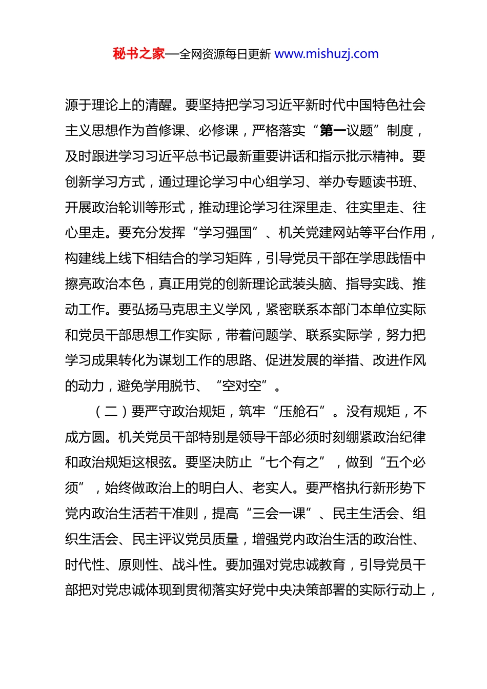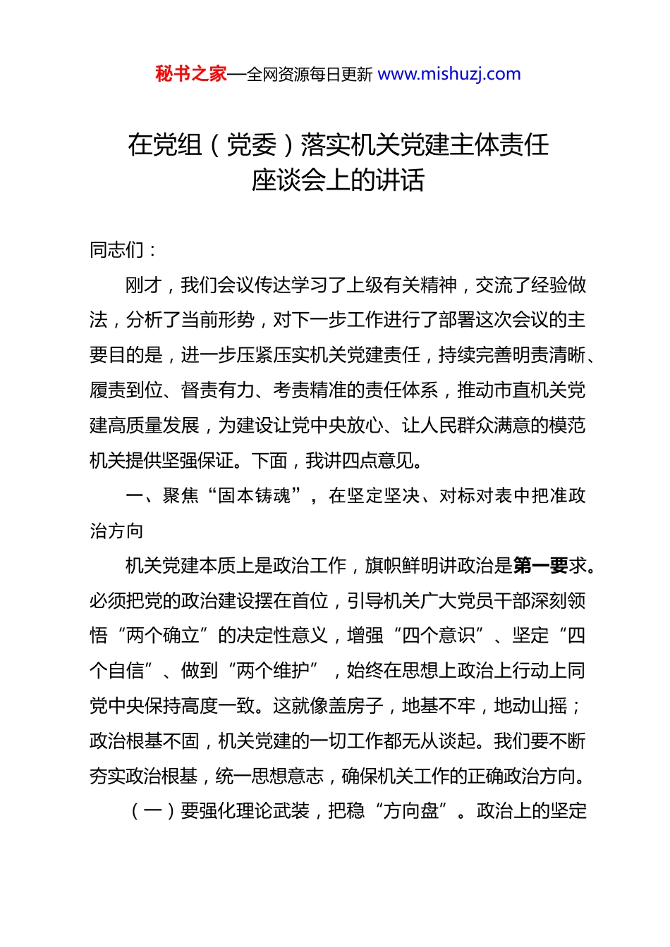 秘书之家—全网资源每日更新 www.mishuzj.com在党组(党委)落实机关党建主体责任座谈会上的讲话 同志们:刚才,我们会议传达学习了上级有关精神,交流了经验做法,分析了当前形势,对下一步工作进行了部署这次会议的主要目的是,进一步压紧压实机关党建责任,持续完善明责清晰、履责到位、督责有力、考责精准的责任体系,推动市直机关党建高质量发展,为建设让党中央放心、让人民群众满意的模范机关提供坚强保证。下面,我讲四点意见。一、聚焦“固本铸魂”,在坚定坚决、对标对表中把准政治方向机关党建本质上是政治工作,旗帜鲜明讲政治是第一要求。必须把党的政治建设摆在首位,引导机关广大党员干部深刻领悟“两个确立”的决定性意义,增强“四个意识”、坚定“四个自信”、做到“两个维护”,始终在思想上政治上行动上同党中央保持高度一致。这就像盖房子,地基不牢,地动山摇;政治根基不固,机关党建的一切工作都无从谈起。我们要不断夯实政治根基,统一思想意志,确保机关工作的正确政治方向。(一)要强化理论武装,把稳“方向盘”。政治上的坚定秘书之家—全网资源每日更新 www.mishuzj.com源于理论上的清醒。要坚持把学习习近平新时代中国特色社会主义思想作为首修课、必修课,严格落实“第一议题”制度,及时跟进学习习近平总书记最新重要讲话和指示批示精神。要创新学习方式,通过理论学习中心组学习、举办专题读书班、开展政治轮训等形式,推动理论学习往深里走、往实里走、往心里走。要充分发挥“学习强国”、机关党建网站等平台作用,构建线上线下相结合的学习矩阵,引导党员干部在学思践悟中擦亮政治本色,真正用党的创新理论武装头脑、指导实践、推动工作。要弘扬马克思主义学风,紧密联系本部门本单位实际和党员干部思想工作实际,带着问题学、联系实际学,努力把学习成果转化为谋划工作的思路、促进发展的举措、改进作风的动力,避免学用脱节、“空对空”。(二)要严守政治规矩,筑牢“压舱石”。没有规矩,不成方圆。机关党员干部特别是领导干部必须时刻绷紧政治纪律和政治规矩这根弦。要坚决防止“七个有之”,做到“五个必须”,始终做政治上的明白人、老实人。要严格执行新形势下党内政治生活若干准则,提高“三会一课”、民主生活会、组织生活会、民主评议党员质量,增强党内政治生活的政治性、时代性、原则性、战斗性。要加强对党忠诚教育,引导党员干部把对党忠诚体现到贯彻落实好党中央决策部署的实际行动上,秘书之家—全网资源每日更新 www.mishuzj.com体现到履职尽责、做好本职工作的实效上,决不能说一套、做一套,搞选择性执行。要旗帜鲜明地反对各种错误思潮和言论,坚决同违反政治纪律和政治规矩的行为作斗争,维护机关党组织的先进性和纯洁性。(三)要提升政治能力,锤炼“硬肩膀”。政治能力是党员干部的第一能力。要不断提高党员干部的政治判断力、政治领悟力、政治执行力,善于从一般事务中发现政治问题,善于从倾向性、苗头性问题中发现政治端倪,善于从错综复杂的矛盾关系中把握政治逻辑。要加强政治历练,注重在贯彻落实党中央重大决策部署、完成急难险重任务、应对重大斗争和考验中,锻炼党员干部的政治胆识和政治智慧。要教育引导党员干部胸怀“国之大者”,时刻关注党中央在关心什么、强调什么,深刻领会什么是党和国家最重要的利益、什么是最需要坚定维护的立场,自觉在大局下思考、在大局下行动,做到既为一域争光、更为全局添彩。要强化风险意识,提高防控能力,有效防范化解政治风险,确保机关各项工作始终沿着正确政治方向前进。二、聚焦“明责聚力”,在知责明责、担责尽责中拧紧责任链条落实机关党建主体责任,关键是明确责任、落实责任,形秘书之家—全网资源每日更新 www.mishuzj.com成层层负责、环环相扣的责任体系。如果责任虚化、悬空,再好的蓝图也只是镜中花、水中月。我们必须紧紧牵住责任制这个“牛鼻子”,构建主体明确、职责清晰、有机衔接的责任体系,推动各级党组织和领导干部把抓好党建作为最大政绩,把主体责任牢牢扛在肩上、紧紧抓在手上。(一)要细化责任清单,解决“谁来抓”的问题。明晰的责任边...