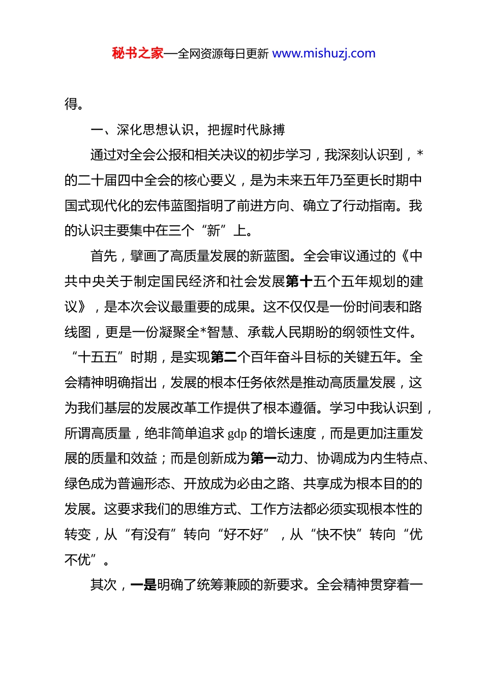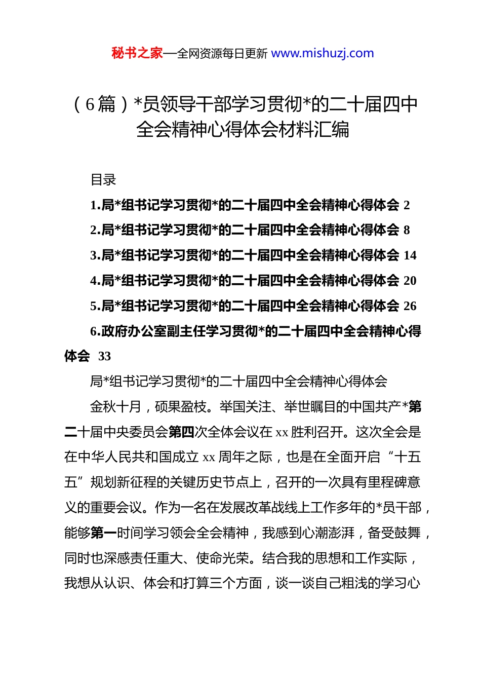 秘书之家—全网资源每日更新 www.mishuzj.com(6 篇)*员领导干部学习贯彻*的二十届四中全会精神心得体会材料汇编目录1.局*组书记学习贯彻*的二十届四中全会精神心得体会 22.局*组书记学习贯彻*的二十届四中全会精神心得体会 83.局*组书记学习贯彻*的二十届四中全会精神心得体会 144.局*组书记学习贯彻*的二十届四中全会精神心得体会 205.局*组书记学习贯彻*的二十届四中全会精神心得体会 266.政府办公室副主任学习贯彻*的二十届四中全会精神心得体会 33局*组书记学习贯彻*的二十届四中全会精神心得体会金秋十月,硕果盈枝。举国关注、举世瞩目的中国共产*第二十届中央委员会第四次全体会议在 xx 胜利召开。这次全会是在中华人民共和国成立 xx 周年之际,也是在全面开启“十五五”规划新征程的关键历史节点上,召开的一次具有里程碑意义的重要会议。作为一名在发展改革战线上工作多年的*员干部,能够第一时间学习领会全会精神,我感到心潮澎湃,备受鼓舞,同时也深感责任重大、使命光荣。结合我的思想和工作实际,我想从认识、体会和打算三个方面,谈一谈自己粗浅的学习心秘书之家—全网资源每日更新 www.mishuzj.com得。一、深化思想认识,把握时代脉搏通过对全会公报和相关决议的初步学习,我深刻认识到,*的二十届四中全会的核心要义,是为未来五年乃至更长时期中国式现代化的宏伟蓝图指明了前进方向、确立了行动指南。我的认识主要集中在三个“新”上。首先,擘画了高质量发展的新蓝图。全会审议通过的《中共中央关于制定国民经济和社会发展第十五个五年规划的建议》,是本次会议最重要的成果。这不仅仅是一份时间表和路线图,更是一份凝聚全*智慧、承载人民期盼的纲领性文件。“十五五”时期,是实现第二个百年奋斗目标的关键五年。全会精神明确指出,发展的根本任务依然是推动高质量发展,这为我们基层的发展改革工作提供了根本遵循。学习中我认识到,所谓高质量,绝非简单追求 gdp 的增长速度,而是更加注重发展的质量和效益;而是创新成为第一动力、协调成为内生特点、绿色成为普遍形态、开放成为必由之路、共享成为根本目的的发展。这要求我们的思维方式、工作方法都必须实现根本性的转变,从“有没有”转向“好不好”,从“快不快”转向“优不优”。其次,一是明确了统筹兼顾的新要求。全会精神贯穿着一秘书之家—全网资源每日更新 www.mishuzj.com种深刻的系统观念和辩证思维,强调要更好地统筹国内国际两个大局,统筹发展和安全,统筹质的有效提升和量的合理增长。在当前复杂多变的国内外环境下,这种统筹兼顾显得尤为重要。对我个人而言,印象最深的是“发展和安全”的并重。作为欠发达地区的基层干部,过去可能更多地将精力聚焦于抓项目、促投资、稳增长上,但全会的精神提醒我,没有安全和稳定,一切发展都无从谈起。无论是经济金融风险的防范,还是粮食能源安全、产业链供应链安全的保障,都必须像抓发展一样,时刻放在心上、抓在手上。这是一种更高层次的执政理念,也是对我们能力本领的更高要求。最后,是彰显了人民至上的新境界。全会强调,推进中国式现代化的最终目的是满足人民日益增长的美好生活需要,要扎实推进共同富裕。这一点让我感触颇深。发展改革工作,一头连着宏观经济大盘,一头连着千家万户的“柴米油盐”。全会提出的保障和改善民生、完善社会治理体系等一系列部署让我更加清晰地认识到,我们工作的出发点和落脚点永远是人民。无论是编制一项规划、审批一个项目,还是研究一项价格政策,都必须首先思考:这是否符合人民的根本利益?是否能增进人民的福祉?这种以人民为中心的发展思想,是共产*人不变的初心,也是我们做好一切工作的价值标尺。秘书之家—全网资源每日更新 www.mishuzj.com二、结合岗位体会,领悟责任使命作为 x 县发展和改革局的负责人,学习全会精神,我更多的是一种“对号入座”的审视和反思。发展改革部门是*委、政府的“参谋部”和“作战部”,全会描绘的宏伟蓝图,最终要通过我们一笔一画地将其细化为地方的“施工图”。这种将中央顶层设计与地方发展实践相结合的使命,让我感到肩上的担子沉甸甸的。体会...