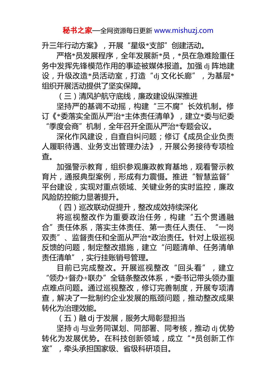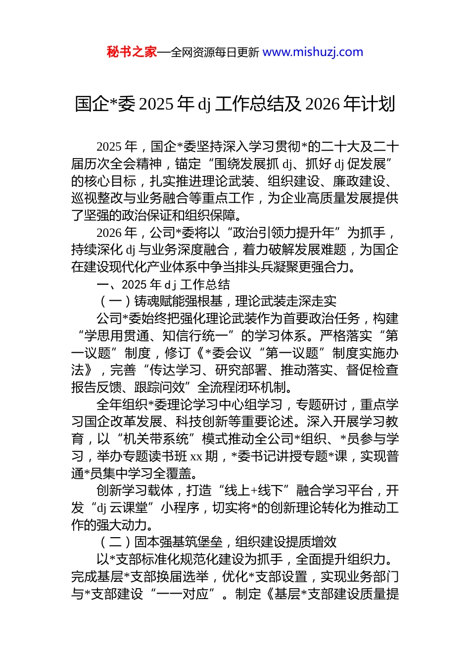 秘书之家—全网资源每日更新 www.mishuzj.com国企*委 2025 年 dj 工作总结及 2026 年计划2025 年,国企*委坚持深入学习贯彻*的二十大及二十届历次全会精神,锚定“围绕发展抓 dj、抓好 dj 促发展”的核心目标,扎实推进理论武装、组织建设、廉政建设、巡视整改与业务融合等重点工作,为企业高质量发展提供了坚强的政治保证和组织保障。2026 年,公司*委将以“政治引领力提升年”为抓手,持续深化 dj 与业务深度融合,着力破解发展难题,为国企在建设现代化产业体系中争当排头兵凝聚更强合力。一、2025 年 dj 工作总结(一)铸魂赋能强根基,理论武装走深走实公司*委始终把强化理论武装作为首要政治任务,构建“学思用贯通、知信行统一”的学习体系。严格落实“第一议题”制度,修订《*委会议“第一议题”制度实施办法》,完善“传达学习、研究部署、推动落实、督促检查报告反馈、跟踪问效”全流程闭环机制。全年组织*委理论学习中心组学习,专题研讨,重点学习国企改革发展、科技创新等重要论述。深入开展学习教育,以“机关带系统”模式推动全公司*组织、*员参与学习,举办专题读书班 xx 期,*委书记讲授专题*课,实现普通*员集中学习全覆盖。创新学习载体,打造“线上+线下”融合学习平台,开发“dj 云课堂”小程序,切实将*的创新理论转化为推动工作的强大动力。(二)固本强基筑堡垒,组织建设提质增效以*支部标准化规范化建设为抓手,全面提升组织力。完成基层*支部换届选举,优化*支部设置,实现业务部门与*支部建设“一一对应”。制定《基层*支部建设质量提秘书之家—全网资源每日更新 www.mishuzj.com升三年行动方案》,开展“星级*支部”创建活动。严格*员发展程序,全年发展新*员,*员在急难险重任务中发挥先锋模范作用的事迹被媒体报道。加强 dj 阵地建设,升级改造*员活动室,打造“dj 文化长廊”,为基层*组织开展活动提供了坚实保障。(三)清风护航守底线,廉政建设纵深推进坚持严的基调不动摇,构建“三不腐”长效机制。修订《*委落实全面从严治*主体责任清单》,建立*委与纪委“季度会商”机制,全年召开全面从严治*专题会议。深化作风建设,自查自纠问题;修订《成员企业负责人履职待遇、业务支出管理办法》,开展公务接待专项检查。加强警示教育,组织参观廉政教育基地,观看警示教育片,通报典型案例,形成有力震慑。推进“智慧监督”平台建设,实现对重点领域、关键业务的实时监控,廉政风险防控能力显著提升。(四)巡改联动促提升,整改成效持续深化将巡视整改作为重要政治任务,构建“五个贯通融合”责任体系,落实主体责任、第一责任人责任、“一岗双责”、监督责任和全面从严治*政治责任。针对上级巡视反馈的问题,制定整改措施,建立“问题清单、任务清单责任清单”,实行挂账销号管理。目前已完成整改。开展巡视整改“回头看”,建立“领办+督办+联办”全链条整改体系,*委书记带头领办重点难点问题。通过巡视整改,修订完善制度,开展专项清查,解决了一批制约企业发展的瓶颈问题,推动整改成果转化为治理效能。(五)融 dj 于发展,服务大局彰显担当坚持 dj 与业务同谋划、同部署、同考核,推动 dj 优势转化为发展优势。在科技创新领域,成立“*员创新工作室”,牵头承担国家级、省级科研项目。秘书之家—全网资源每日更新 www.mishuzj.com在产业升级方面,实施“dj+智改数转”行动,推动 xx条生产线完成智能化改造。在服务国家战略中,组建“*员突击队”参与重点工程建设,提前 xx 天完成任务。落实“我为群众办实事”实践活动,解决职工急难愁盼问题,开展帮扶活动,投入帮扶资金,彰显国企社会责任与担当。二、存在的主要问题尽管 2025 年 dj 工作取得阶段性成效,但对照新时代*的建设总要求和国企 dj 工作新标准,仍存在以下不足。理论武装实效性有待增强。部分基层*支部学习形式单一,存在“上热中温下凉”现象,学习成果转化为实际工作能力的效果不够明显,如 xx*支部在理论学习与业务结合上缺乏创新举措,学习研讨深度不足。dj 业务融合深度不足。dj 与科技创新、产业升级等中心工作融合的切入点...