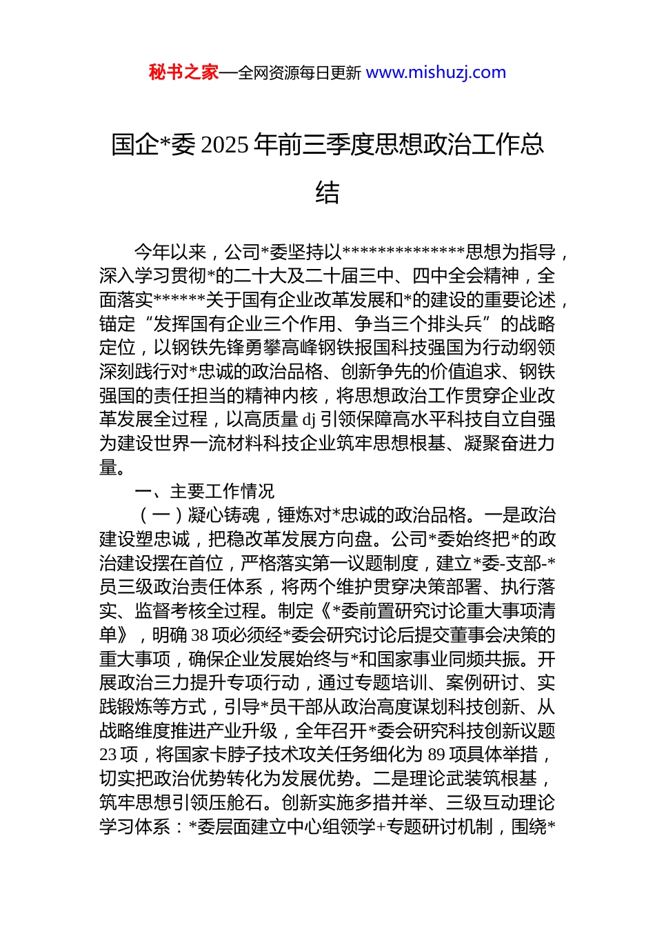 秘书之家—全网资源每日更新 www.mishuzj.com国企*委 2025 年前三季度思想政治工作总结今年以来,公司*委坚持以**************思想为指导,深入学习贯彻*的二十大及二十届三中、四中全会精神,全面落实******关于国有企业改革发展和*的建设的重要论述,锚定“发挥国有企业三个作用、争当三个排头兵”的战略定位,以钢铁先锋勇攀高峰钢铁报国科技强国为行动纲领深刻践行对*忠诚的政治品格、创新争先的价值追求、钢铁强国的责任担当的精神内核,将思想政治工作贯穿企业改革发展全过程,以高质量 dj 引领保障高水平科技自立自强为建设世界一流材料科技企业筑牢思想根基、凝聚奋进力量。一、主要工作情况(一)凝心铸魂,锤炼对*忠诚的政治品格。一是政治建设塑忠诚,把稳改革发展方向盘。公司*委始终把*的政治建设摆在首位,严格落实第一议题制度,建立*委-支部-*员三级政治责任体系,将两个维护贯穿决策部署、执行落实、监督考核全过程。制定《*委前置研究讨论重大事项清单》,明确 38 项必须经*委会研究讨论后提交董事会决策的重大事项,确保企业发展始终与*和国家事业同频共振。开展政治三力提升专项行动,通过专题培训、案例研讨、实践锻炼等方式,引导*员干部从政治高度谋划科技创新、从战略维度推进产业升级,全年召开*委会研究科技创新议题23 项,将国家卡脖子技术攻关任务细化为 89 项具体举措,切实把政治优势转化为发展优势。二是理论武装筑根基,筑牢思想引领压舱石。创新实施多措并举、三级互动理论学习体系:*委层面建立中心组领学+专题研讨机制,围绕*秘书之家—全网资源每日更新 www.mishuzj.com*****关于科技创新的重要论述开展专题学习 12 次;支部层面推广微*课+场景教学模式,打造车间*课实验室微课堂等特色载体,全年开展理论宣讲 230 余场;*员层面推行每日1 小时学习制度,依托学习强国企业云课堂等平台,实现*员学习覆盖率 100%。编写《科技报国案例集》,收录 28 个科研团队攻坚克难典型事迹,开展理论+实践分享会 46 场,引导干部职工深刻理解科技是国之利器,国家赖之以强,企业赖之以赢的深刻内涵,为建设引领材料技术发展的一流科技公司凝聚思想共识。三是红色基因传薪火,激活接续奋斗动力源。深入开展传承红色基因、勇担科技使命 zt教育,组织*员干部赴井冈山、遵义等红色教育基地开展现场教学,邀请老专家、老*员讲述从零起步突破特种钢材技术封锁的奋斗史,制作《钢铁脊梁》纪录片,生动展现三代科研人员把论文写在祖国大地上的家国情怀。建立红色导师制,由老*员结对青年科研骨干,通过传思想、带技术、帮成长,推动红色基因与创新精神深度融合。今年以来,青年科研团队主动请缨承担国家重大专项 17 项,在航空航天用超高强度钢、深海工程用耐腐蚀合金等领域取得突破性进展,切实将红色传统转化为攻坚克难的精神动力。(二)联建共建,彰显创新争先的价值追求。一是组织联建激活力,构建创新协同生态圈。创新 dj+创新链工作模式,推动*组织建设与科技创新深度融合。在重大科研项目中成立临时*支部,将三会一课、主题*日开到实验室、生产线,形成组织建设联抓、发展项目联推、dj 活动联办、问题难点联解、成果成效联享的五联模式。联合中科院金属所、北京科技大学等 12 家单位*组织,组建先进钢铁材料创新联盟,开展跨单位联合主题*日 18 次,攻克大规格钛合金铸锭均质化控制等技术难题 26 项。建立创新先锋指数评价体系,将 dj 活动成效与科研进度、成果转化等指标挂钩推动 dj 工作从有形覆盖向有效覆盖转变。二是人才共育谋长远,打造创新发展人才库。实施 dj 思政+创新人才培养工秘书之家—全网资源每日更新 www.mishuzj.com程,构建选、育、管、用全链条机制:通过*员科技先锋岗选拔青年骨干,建立项目历练+学术交流+国际合作培养路径;与清华大学、上海交通大学共建 dj 育人实践基地,联合培养博士研究生 58 名;设立青年创新基金,支持 35 岁以下科研人员自主选题攻关,全年资助项目 43 项。目前,公司拥有两院院士 6 人、新世纪百千万人才工程国家级人选 6人、国家级有突出贡献中青年专家...