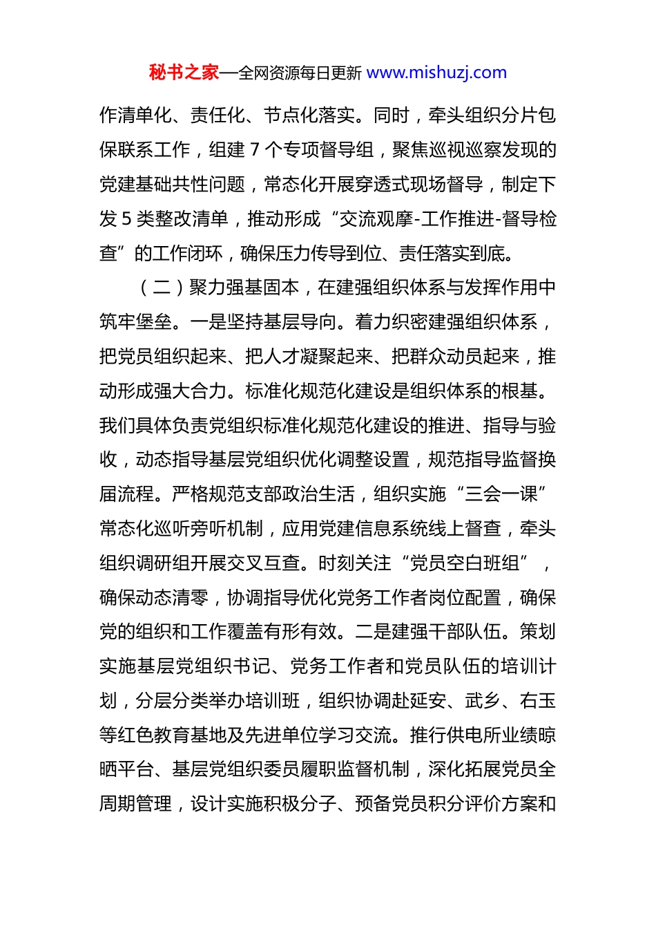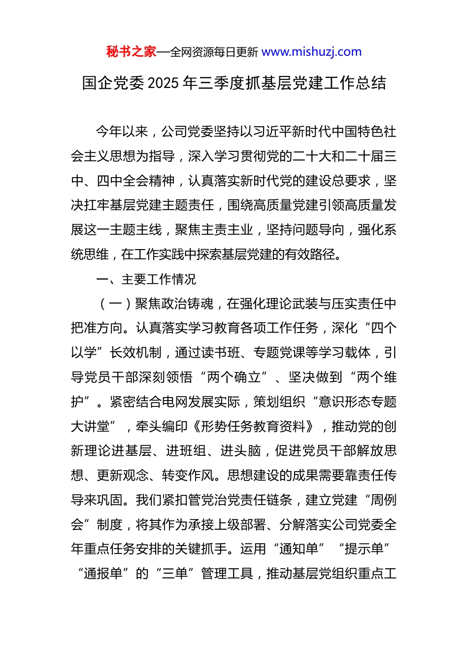 秘书之家—全网资源每日更新 www.mishuzj.com国企党委 2025 年三季度抓基层党建工作总结 今年以来,公司党委坚持以习近平新时代中国特色社会主义思想为指导,深入学习贯彻党的二十大和二十届三中、四中全会精神,认真落实新时代党的建设总要求,坚决扛牢基层党建主题责任,围绕高质量党建引领高质量发展这一主题主线,聚焦主责主业,坚持问题导向,强化系统思维,在工作实践中探索基层党建的有效路径。一、主要工作情况(一)聚焦政治铸魂,在强化理论武装与压实责任中把准方向。认真落实学习教育各项工作任务,深化“四个以学”长效机制,通过读书班、专题党课等学习载体,引导党员干部深刻领悟“两个确立”、坚决做到“两个维护”。紧密结合电网发展实际,策划组织“意识形态专题大讲堂”,牵头编印《形势任务教育资料》,推动党的创新理论进基层、进班组、进头脑,促进党员干部解放思想、更新观念、转变作风。思想建设的成果需要靠责任传导来巩固。我们紧扣管党治党责任链条,建立党建“周例会”制度,将其作为承接上级部署、分解落实公司党委全年重点任务安排的关键抓手。运用“通知单”“提示单”“通报单”的“三单”管理工具,推动基层党组织重点工秘书之家—全网资源每日更新 www.mishuzj.com作清单化、责任化、节点化落实。同时,牵头组织分片包保联系工作,组建 7 个专项督导组,聚焦巡视巡察发现的党建基础共性问题,常态化开展穿透式现场督导,制定下发 5 类整改清单,推动形成“交流观摩-工作推进-督导检查”的工作闭环,确保压力传导到位、责任落实到底。(二)聚力强基固本,在建强组织体系与发挥作用中筑牢堡垒。一是坚持基层导向。着力织密建强组织体系,把党员组织起来、把人才凝聚起来、把群众动员起来,推动形成强大合力。标准化规范化建设是组织体系的根基。我们具体负责党组织标准化规范化建设的推进、指导与验收,动态指导基层党组织优化调整设置,规范指导监督换届流程。严格规范支部政治生活,组织实施“三会一课”常态化巡听旁听机制,应用党建信息系统线上督查,牵头组织调研组开展交叉互查。时刻关注“党员空白班组”,确保动态清零,协调指导优化党务工作者岗位配置,确保党的组织和工作覆盖有形有效。二是建强干部队伍。策划实施基层党组织书记、党务工作者和党员队伍的培训计划,分层分类举办培训班,组织协调赴延安、武乡、右玉等红色教育基地及先进单位学习交流。推行供电所业绩晾晒平台、基层党组织委员履职监督机制,深化拓展党员全周期管理,设计实施积极分子、预备党员积分评价方案和秘书之家—全网资源每日更新 www.mishuzj.com正式党员积分量化“分色”管理模型,引导党员立足岗位创先争优,广泛组织党员岗位亮诺践诺活动,激励党员在急难险重任务中冲锋在前。三是突出党业融合。高质量推进太行黎明共产党员服务队和青年突击队“两队”传承共建,深化党员无违章、党员无意见“两无”专项行动,创新运用“联合组队”“派员参队”模式,指导新建服务队,实现本部支部“两队”建设全覆盖。协调组织“两队”成员下沉供电网格,策划开展结合“党建+基建”等主题的服务提升与攻坚克难专项行动。优化整合党组织联建共建、岗区队、供电所党建协作区、“进千家门、访万户需”等载体平台,推动党建深度融入构建新型电力系统、卓越供电服务、科技创新等核心业务。创新建立“三类清单”工作机制,牵头梳理公司年度重点难点问题,精准匹配资源力量,定期组织攻坚行动,确保关键领域有党员担当、攻坚一线有党员旗帜。(三)着力文化赋能,在构建宣传格局与打造品牌中凝心聚力。一是强化文化引领。着力发挥宣传工作在思想引导、凝聚共识、形象塑造中的关键作用,亮出公司党建“新特色”。构建“大宣传”格局是提升宣传效能的关键。我们制定完善新闻宣传激励机制,聚焦电力保供、优质服务、改革创新等中心工作,强化选题策划和正面引秘书之家—全网资源每日更新 www.mishuzj.com导,公司内外部宣传刊发量和影响力显著提升。精心策划打磨《丈量》等品牌故事,乡村振兴主题微电影《又是一年梨花开》获省级奖项。同时,牵头构建舆情管理体系,创新...