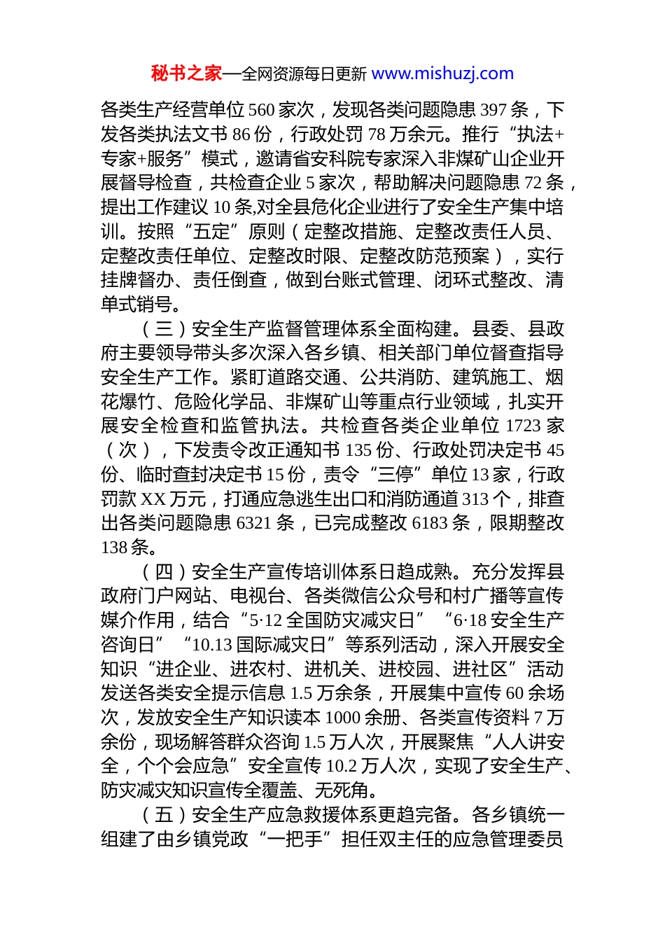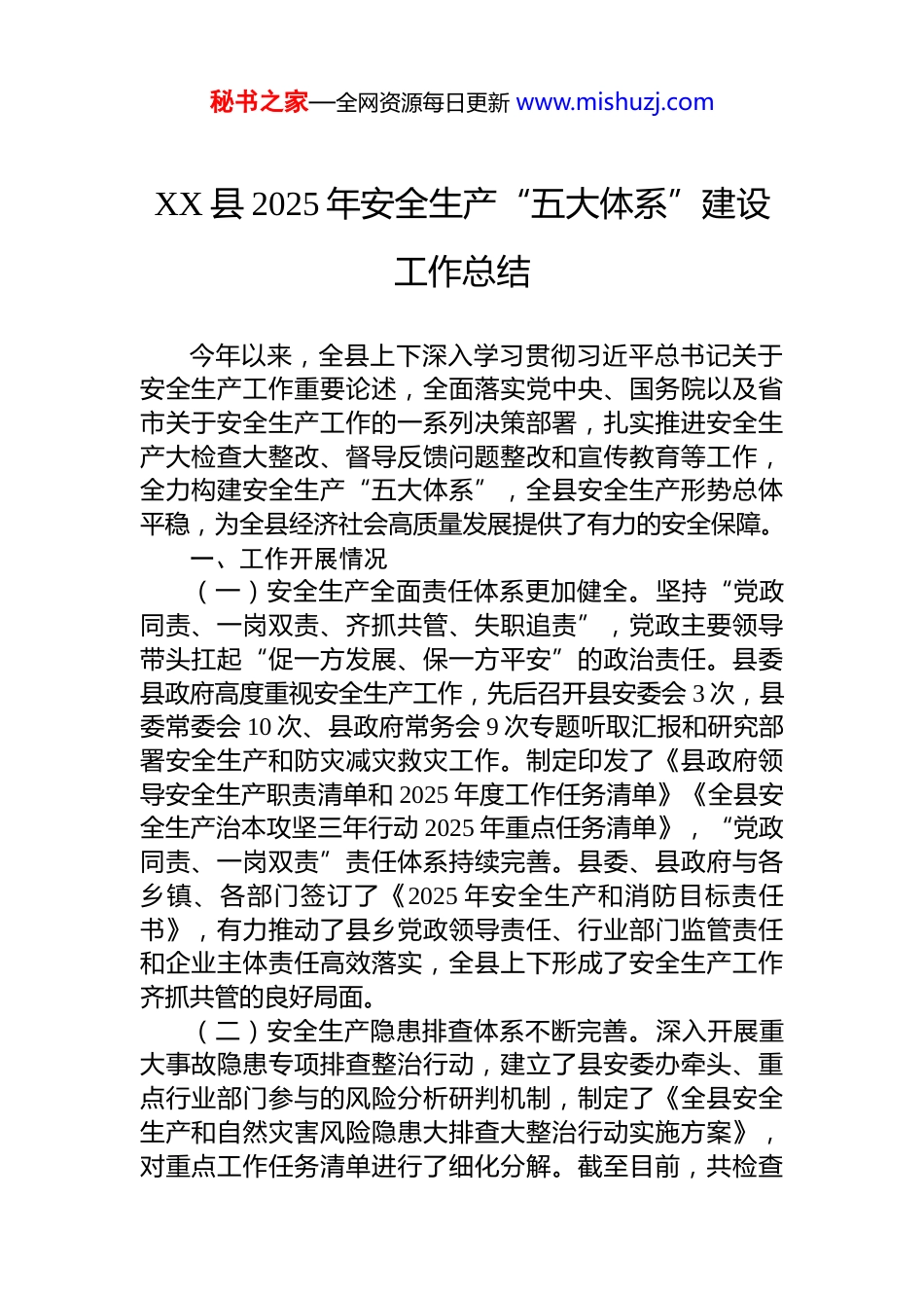 秘书之家—全网资源每日更新 www.mishuzj.comXX 县 2025 年安全生产“五大体系”建设工作总结今年以来,全县上下深入学习贯彻习近平总书记关于安全生产工作重要论述,全面落实党中央、国务院以及省市关于安全生产工作的一系列决策部署,扎实推进安全生产大检查大整改、督导反馈问题整改和宣传教育等工作,全力构建安全生产“五大体系”,全县安全生产形势总体平稳,为全县经济社会高质量发展提供了有力的安全保障。一、工作开展情况(一)安全生产全面责任体系更加健全。坚持“党政同责、一岗双责、齐抓共管、失职追责”,党政主要领导带头扛起“促一方发展、保一方平安”的政治责任。县委县政府高度重视安全生产工作,先后召开县安委会 3 次,县委常委会 10 次、县政府常务会 9 次专题听取汇报和研究部署安全生产和防灾减灾救灾工作。制定印发了《县政府领导安全生产职责清单和 2025 年度工作任务清单》《全县安全生产治本攻坚三年行动 2025 年重点任务清单》,“党政同责、一岗双责”责任体系持续完善。县委、县政府与各乡镇、各部门签订了《2025 年安全生产和消防目标责任书》,有力推动了县乡党政领导责任、行业部门监管责任和企业主体责任高效落实,全县上下形成了安全生产工作齐抓共管的良好局面。(二)安全生产隐患排查体系不断完善。深入开展重大事故隐患专项排查整治行动,建立了县安委办牵头、重点行业部门参与的风险分析研判机制,制定了《全县安全生产和自然灾害风险隐患大排查大整治行动实施方案》,对重点工作任务清单进行了细化分解。截至目前,共检查秘书之家—全网资源每日更新 www.mishuzj.com各类生产经营单位 560 家次,发现各类问题隐患 397 条,下发各类执法文书 86 份,行政处罚 78 万余元。推行“执法+专家+服务”模式,邀请省安科院专家深入非煤矿山企业开展督导检查,共检查企业 5 家次,帮助解决问题隐患 72 条,提出工作建议 10 条,对全县危化企业进行了安全生产集中培训。按照“五定”原则(定整改措施、定整改责任人员、定整改责任单位、定整改时限、定整改防范预案),实行挂牌督办、责任倒查,做到台账式管理、闭环式整改、清单式销号。(三)安全生产监督管理体系全面构建。县委、县政府主要领导带头多次深入各乡镇、相关部门单位督查指导安全生产工作。紧盯道路交通、公共消防、建筑施工、烟花爆竹、危险化学品、非煤矿山等重点行业领域,扎实开展安全检查和监管执法。共检查各类企业单位 1723 家(次),下发责令改正通知书 135 份、行政处罚决定书 45份、临时查封决定书 15 份,责令“三停”单位 13 家,行政罚款 XX 万元,打通应急逃生出口和消防通道 313 个,排查出各类问题隐患 6321 条,已完成整改 6183 条,限期整改138 条。(四)安全生产宣传培训体系日趋成熟。充分发挥县政府门户网站、电视台、各类微信公众号和村广播等宣传媒介作用,结合“5·12 全国防灾减灾日”“6·18 安全生产咨询日”“10.13 国际减灾日”等系列活动,深入开展安全知识“进企业、进农村、进机关、进校园、进社区”活动发送各类安全提示信息 1.5 万余条,开展集中宣传 60 余场次,发放安全生产知识读本 1000 余册、各类宣传资料 7 万余份,现场解答群众咨询 1.5 万人次,开展聚焦“人人讲安全,个个会应急”安全宣传 10.2 万人次,实现了安全生产、防灾减灾知识宣传全覆盖、无死角。(五)安全生产应急救援体系更趋完备。各乡镇统一组建了由乡镇党政“一把手”担任双主任的应急管理委员秘书之家—全网资源每日更新 www.mishuzj.com会,明确了常务副主任,按照标准建立了功能完备、管理规范的应急管理场所,在 344 个行政村(社区)成立了应急管理站,基本建成了组织指挥高效、统筹机制健全、风险防控精准、应急保障有力的基层应急管理体系。在 15 个乡镇开展防灾减灾综合演练 486 场次,实现县乡村(社区)全覆盖。持续加强应急救援物资储备,成功举行地震应急救援综合演练,进一步提升了全县地震等自然灾害应急处置能力。严格落实 24 小时值班制度,针对特殊节点开展联合研判会商,及时下发预警信息,确保汛情、险情等指令及时准确上传下达,进一步提升了应急综合处突能力。