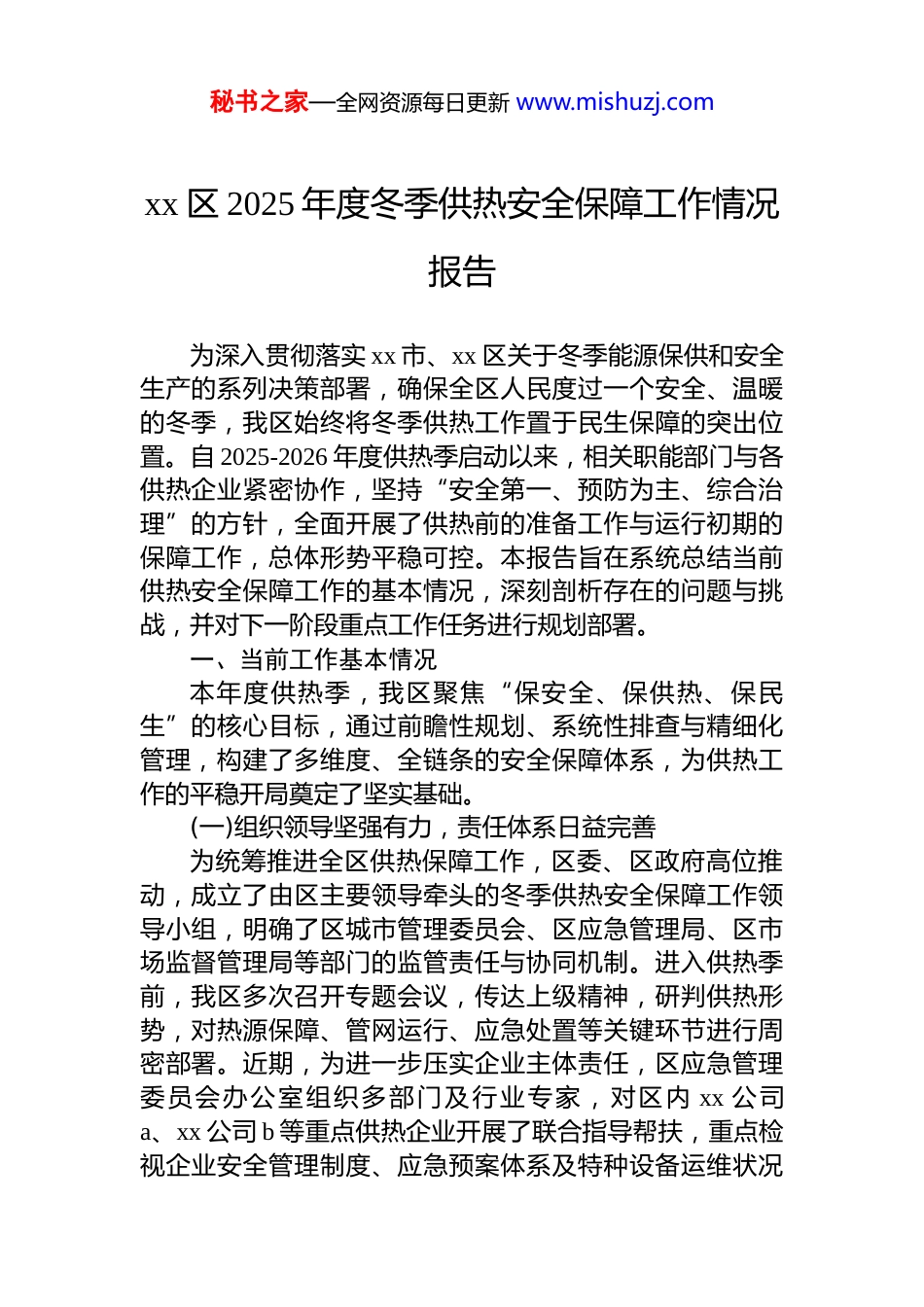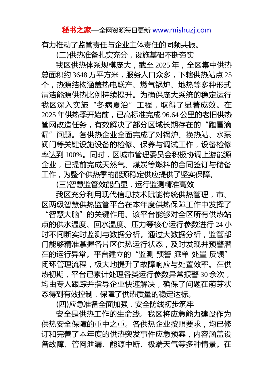 秘书之家—全网资源每日更新 www.mishuzj.comxx 区 2025 年度冬季供热安全保障工作情况报告为深入贯彻落实 xx 市、xx 区关于冬季能源保供和安全生产的系列决策部署,确保全区人民度过一个安全、温暖的冬季,我区始终将冬季供热工作置于民生保障的突出位置。自 2025-2026 年度供热季启动以来,相关职能部门与各供热企业紧密协作,坚持“安全第一、预防为主、综合治理”的方针,全面开展了供热前的准备工作与运行初期的保障工作,总体形势平稳可控。本报告旨在系统总结当前供热安全保障工作的基本情况,深刻剖析存在的问题与挑战,并对下一阶段重点工作任务进行规划部署。一、当前工作基本情况本年度供热季,我区聚焦“保安全、保供热、保民生”的核心目标,通过前瞻性规划、系统性排查与精细化管理,构建了多维度、全链条的安全保障体系,为供热工作的平稳开局奠定了坚实基础。(一)组织领导坚强有力,责任体系日益完善为统筹推进全区供热保障工作,区委、区政府高位推动,成立了由区主要领导牵头的冬季供热安全保障工作领导小组,明确了区城市管理委员会、区应急管理局、区市场监督管理局等部门的监管责任与协同机制。进入供热季前,我区多次召开专题会议,传达上级精神,研判供热形势,对热源保障、管网运行、应急处置等关键环节进行周密部署。近期,为进一步压实企业主体责任,区应急管理委员会办公室组织多部门及行业专家,对区内 xx 公司a、xx 公司 b 等重点供热企业开展了联合指导帮扶,重点检视企业安全管理制度、应急预案体系及特种设备运维状况秘书之家—全网资源每日更新 www.mishuzj.com有力推动了监管责任与企业主体责任的同频共振。(二)供热准备扎实充分,设施基础不断夯实我区供热体系规模庞大,截至 2025 年,全区集中供热总面积约 3648 万平方米,服务人口众多,下辖供热站点 25个,热源结构涵盖热电联产、燃气锅炉、地热等多种形式清洁能源供热比例持续提升。为确保庞大系统的稳定运行我区深入实施“冬病夏治”工程,取得了显著成效。在2025 年供热季开始前,已高标准完成 96.64 公里的老旧供热管网改造任务,有效解决了部分区域长期存在的“跑冒滴漏”问题。各供热企业全面完成了对锅炉、换热站、水泵阀门等关键设施设备的检修、保养与调试工作,设备检修率达到 100%。同时,区城市管理委员会积极协调上游能源企业,已提前完成天然气、煤炭等燃料的合同签订与储备工作,为整个供热季的能源稳定供应提供了坚实保障。(三)智慧监管效能凸显,运行监测精准高效我区充分利用现代信息技术赋能传统供热管理,市、区两级智慧供热监管平台在本年度供热保障工作中发挥了“智慧大脑”的关键作用。该平台能够对全区所有供热站点的供水温度、回水温度、压力等核心运行参数进行 24 小时不间断实时监测与数据分析。通过大数据分析,监管部门能够精准掌握各片区供热运行状态,及时发现并预警潜在的运行异常。平台建立的“监测-预警-派单-处置-反馈”闭环管理流程,极大地提升了故障响应与处置效率。在供热初期,平台已累计处理各类运行参数异常报警 30 余次,均由专人跟踪并指导企业快速解决,确保了问题在萌芽状态得到有效控制,保障了供热质量的稳定达标。(四)应急准备全面加强,安全防线初步筑牢安全是供热工作的生命线。我区将应急能力建设作为供热安全保障的重中之重。各供热企业按照要求,均已修订和完善了本年度的供热突发事件应急预案,内容涵盖设备故障、管网泄漏、能源中断、极端天气等多种情景。在秘书之家—全网资源每日更新 www.mishuzj.com区应急管理部门的指导下,各企业均组建了专业的应急抢险队伍,并实行 24 小时备勤制度,确保一旦发生突发状况能够迅速出动。同时,对抢修车辆、备用泵机、管材、焊接设备等应急救援物资进行了全面盘点与补充,建立了物资储备清单。近期开展的联合指导帮扶工作,也着重检查了企业应急预案的实操性、应急队伍的备勤状态和应急物资的完备情况,推动企业应急准备工作从“纸上”落到“实处”,为应对各类供热突发事件构筑了坚固的第一道防线。二、当前存在的突出问题在肯定成绩的同时,必须清醒地认...