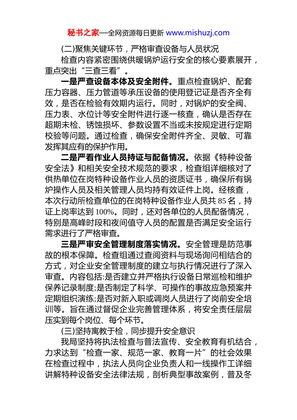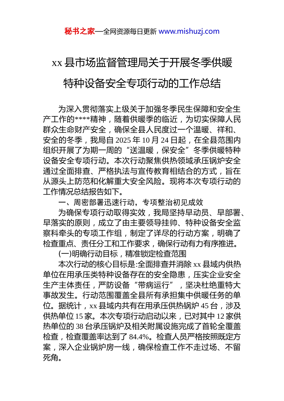 秘书之家—全网资源每日更新 www.mishuzj.comxx 县市场监督管理局关于开展冬季供暖特种设备安全专项行动的工作总结为深入贯彻落实上级关于加强冬季民生保障和安全生产工作的****精神,随着供暖季的临近,为切实保障人民群众生命财产安全,确保全县人民度过一个温暖、祥和、安全的冬季,我局自 2025 年 10 月 24 日起,在全县范围内组织开展了为期一周的“送温暖,保安全”冬季供暖特种设备安全专项行动。本次行动聚焦供热领域承压锅炉安全通过全面排查、严格执法与宣传教育相结合的方式,旨在从源头上防范和化解重大安全风险。现将本次专项行动的工作情况总结报告如下。一、周密部署迅速行动,专项整治初见成效为确保专项行动取得实效,我局坚持早动员、早部署、早落实的原则,成立了由主要领导挂帅、特种设备安全监察科牵头的专项工作组,制定了详尽的行动方案,明确了检查重点、责任分工和工作要求,确保行动有力有序推进。(一)明确行动目标,精准锁定检查范围本次行动的核心目标是:全面排查并消除 xx 县域内供热单位在用承压类特种设备存在的安全隐患,压实企业安全生产主体责任,严防设备“带病运行”,坚决杜绝重特大事故发生。行动范围覆盖全县所有承担集中供暖任务的单位。据统计,xx 县域内共有在用承压供热锅炉 45 台,涉及供热单位 15 家。本次专项行动启动以来,已对其中 12 家供热单位的 38 台承压锅炉及相关附属设施完成了首轮全覆盖检查,检查覆盖率达到了 84.4%。检查人员严格按照既定方案,深入企业锅炉房一线,确保检查工作不走过场、不留死角。秘书之家—全网资源每日更新 www.mishuzj.com(二)聚焦关键环节,严格审查设备与人员状况检查内容紧密围绕供暖锅炉运行安全的核心要素展开,重点突出“三查三看”。一是严查设备本体及安全附件。重点检查锅炉、配套压力容器、压力管道等承压设备的使用登记证是否齐全有效,是否在检验有效期内运行。同时,对锅炉的安全阀、压力表、水位计等安全附件进行逐一核查,确认是否存在超期未检、锈蚀损坏、参数设置不当或未按规定进行定期校验等问题。通过检查,确保安全附件齐全、灵敏、可靠发挥其应有的保护作用。二是严看作业人员持证与配备情况。依据《特种设备安全法》和相关安全技术规范的要求,检查组详细核对了供热单位在岗特种设备作业人员的资质证书,确保所有锅炉操作人员及相关管理人员均持有效证件上岗。经核查,本次行动所检查单位的在岗特种设备作业人员共 85 名,持证上岗率达到 100%。同时,还对各单位的人员配备情况,特别是高峰时段和夜间值守人员的配置是否满足安全运行需求进行了严格审查。三是严审安全管理制度落实情况。安全管理是防范事故的根本保障。检查组通过查阅资料与现场询问相结合的方式,对企业安全管理制度的建立与执行情况进行了深入审查。内容包括:是否建立并严格执行设备日常巡检和维护保养记录制度;是否制定了科学、可操作的事故应急预案并定期组织演练;是否对新入职或调岗人员进行了岗前安全培训等。旨在通过督促企业完善管理体系,将安全责任层层压实到每个岗位、每个环节。(三)坚持寓教于检,同步提升安全意识我局坚持将执法检查与普法宣传、安全教育有机结合,力求达到“检查一家、规范一家、教育一片”的社会效果在检查过程中,执法人员向企业负责人和一线操作工详细讲解特种设备安全法律法规,剖析典型事故案例,普及冬秘书之家—全网资源每日更新 www.mishuzj.com季锅炉安全操作与应急处置知识。行动期间,累计组织现场安全教育 5 场次,受训人员达 85 人;同时,向各供热单位发放了《冬季供热锅炉安全操作手册》及相关宣传海报共计 500 余份。此外,充分利用我局官方微信公众号“xx 市场监管”等新媒体平台,发布冬季取暖安全提示和风险预警信息,累计阅读量超过 3000 人次,有效提升了社会公众的安全意识和风险防范能力。二、聚焦短板深刻剖析,风险隐患亟待整改通过本次专项行动的初步排查,xx 县冬季供暖特种设备安全状况总体稳定可控,未发现严重威胁公共安全的重大隐患。但检查中也暴露出部分单位在安全管理细节、制度执行和人员意识等方...