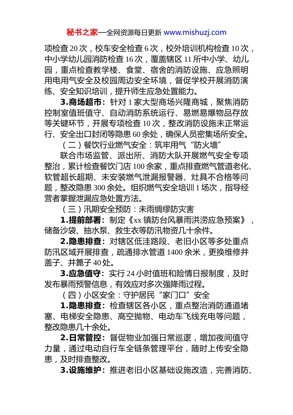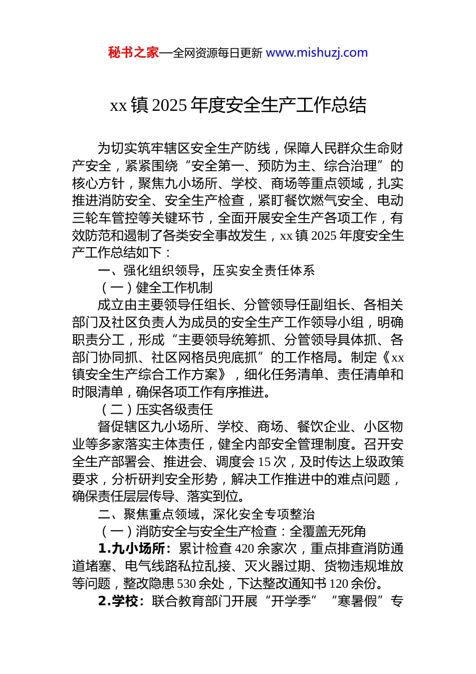 秘书之家—全网资源每日更新 www.mishuzj.comxx 镇 2025 年度安全生产工作总结为切实筑牢辖区安全生产防线,保障人民群众生命财产安全,紧紧围绕“安全第一、预防为主、综合治理”的核心方针,聚焦九小场所、学校、商场等重点领域,扎实推进消防安全、安全生产检查,紧盯餐饮燃气安全、电动三轮车管控等关键环节,全面开展安全生产各项工作,有效防范和遏制了各类安全事故发生,xx 镇 2025 年度安全生产工作总结如下:一、强化组织领导,压实安全责任体系(一)健全工作机制成立由主要领导任组长、分管领导任副组长、各相关部门及社区负责人为成员的安全生产工作领导小组,明确职责分工,形成“主要领导统筹抓、分管领导具体抓、各部门协同抓、社区网格员兜底抓”的工作格局。制定《xx镇安全生产综合工作方案》,细化任务清单、责任清单和时限清单,确保各项工作有序推进。(二)压实各级责任督促辖区九小场所、学校、商场、餐饮企业、小区物业等多家落实主体责任,健全内部安全管理制度。召开安全生产部署会、推进会、调度会 15 次,及时传达上级政策要求,分析研判安全形势,解决工作推进中的难点问题,确保责任层层传导、落实到位。二、聚焦重点领域,深化安全专项整治(一)消防安全与安全生产检查:全覆盖无死角1.九小场所:累计检查 420 余家次,重点排查消防通道堵塞、电气线路私拉乱接、灭火器过期、货物违规堆放等问题,整改隐患 530 余处,下达整改通知书 120 余份。2.学校:联合教育部门开展“开学季”“寒暑假”专秘书之家—全网资源每日更新 www.mishuzj.com项检查 20 次,校车安全检查 6 次,校外培训机构检查 10 次,中小学幼儿园消防检查 16 次,覆盖辖区 11 所中小学、幼儿园,重点检查教学楼、食堂、宿舍的消防设施、应急照明用电用气安全及校园周边安全环境,督促学校开展消防演练、安全知识培训,提升师生应急处置能力。3.商场超市:针对 1 家大型商场兴隆商城,聚焦消防控制室值班值守、自动消防系统运行、易燃易爆物品存放等关键环节,开展专项检查 10 次,整改消防设施未正常运行、安全出口封闭等隐患 60 余处,确保人员密集场所安全。(二)餐饮行业燃气安全:筑牢用气“防火墙”联合市场监管、派出所、消防大队开展燃气安全专项整治,累计检查餐饮门店 100 余家,重点排查燃气管道老化、软管超长超期、未安装燃气泄漏报警器、灶具不合格等问题,整改隐患 300 余处。组织燃气安全培训 1 场次,指导经营者掌握泄漏应急处置方法。(三)汛期安全预防:未雨绸缪防灾害1.提前部署:制定《xx 镇防台风暴雨洪涝应急预案》,储备沙袋、抽水泵、救生衣等防汛物资几十余件。2.隐患排查:对辖区低洼路段、老旧小区等多处重点防汛区域开展排查,疏通排水管道 1400 余米,更换维修井盖子、井篦子 40 处。3.应急值守:实行 24 小时值班和险情日报制度,及时发布暴雨预警信息,有效应对多次强降雨过程。(四)小区安全:守护居民“家门口”安全1.隐患排查:检查辖区各小区,重点整治消防通道堵塞、电梯安全隐患、高空抛物、电动车飞线充电等问题,整改隐患几十余处。2.日常管控:督促物业加强日常巡逻,增加夜间值守力量,通过电动自行车全链条管理平台,随时上传安全隐患,及时排查整改。3.设施维护:推进老旧小区基础设施改造,完善消防、秘书之家—全网资源每日更新 www.mishuzj.com排水设施,从根本上降低安全风险。三、强化宣传教育,提升全民安全意识以“安全生产月”“119 消防宣传月”为契机,开展多形式宣传活动。利用社区微信群推送安全知识百余条。组织应急演练 3 场次,覆盖 1000 余人次,重点普及消防安全、燃气安全、居家安全、交通安全等知识,营造“人人讲安全、事事为安全”的良好氛围。四、存在的问题1.部分经营主体和群众安全意识薄弱,九小场所、小型餐饮门店存在隐患整改不彻底、屡改屡犯的情况。2.基层监管力量不足,网格员专业能力有限,对复杂安全隐患的排查精准度不够。 3.部分老旧小区、九小场所基础设施老化,消防设施不完善、排水系统不畅等问题较大。五、下一年度工作计划(一)进一...