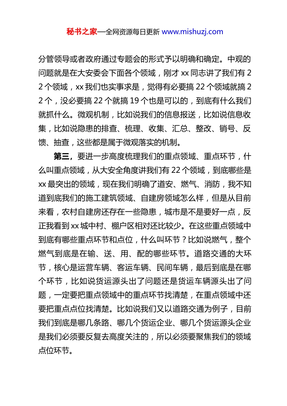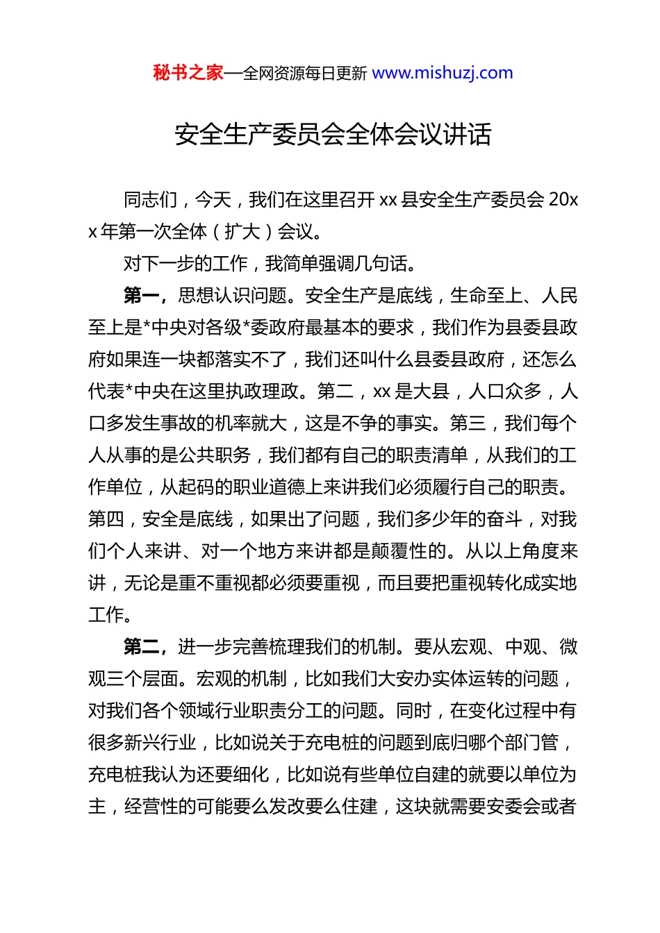 秘书之家—全网资源每日更新 www.mishuzj.com安全生产委员会全体会议讲话同志们,今天,我们在这里召开 xx 县安全生产委员会 20xx 年第一次全体(扩大)会议。对下一步的工作,我简单强调几句话。第一,思想认识问题。安全生产是底线,生命至上、人民至上是*中央对各级*委政府最基本的要求,我们作为县委县政府如果连一块都落实不了,我们还叫什么县委县政府,还怎么代表*中央在这里执政理政。第二,xx 是大县,人口众多,人口多发生事故的机率就大,这是不争的事实。第三,我们每个人从事的是公共职务,我们都有自己的职责清单,从我们的工作单位,从起码的职业道德上来讲我们必须履行自己的职责。第四,安全是底线,如果出了问题,我们多少年的奋斗,对我们个人来讲、对一个地方来讲都是颠覆性的。从以上角度来讲,无论是重不重视都必须要重视,而且要把重视转化成实地工作。第二,进一步完善梳理我们的机制。要从宏观、中观、微观三个层面。宏观的机制,比如我们大安办实体运转的问题,对我们各个领域行业职责分工的问题。同时,在变化过程中有很多新兴行业,比如说关于充电桩的问题到底归哪个部门管,充电桩我认为还要细化,比如说有些单位自建的就要以单位为主,经营性的可能要么发改要么住建,这块就需要安委会或者秘书之家—全网资源每日更新 www.mishuzj.com分管领导或者政府通过专题会的形式予以明确和确定。中观的问题就是在大安委会下面各个领域,刚才 xx 同志讲了我们有 22 个领域,xx 我们也实事求是,觉得有必要搞 22 个领域就搞 22 个,没必要搞 22 个就搞 19 个也是可以的,到底有什么我们就抓什么。微观机制,比如说我们的信息报送,比如说信息收集,比如说隐患的排查、梳理、收集、汇总、整改、销号、反馈、抽查,这些都是属于微观落实的机制。第三,要进一步高度梳理我们的重点领域、重点环节,什么叫重点领域,从大安全角度讲我们有 22 个领域,到底哪些是xx 最突出的领域,现在我们明确了道安、燃气、消防,我不知道到底我们的施工建筑领域、自建房领域怎么样,但是从目前来看,农村自建房还存在一些隐患,城市是不是要好一点,反正我看到 xx 城中村、棚户区相对还比较少。在这些重点领域中到底有哪些重点环节和点位,什么叫环节?比如说燃气,整个燃气到底是在输、送、用、配的哪些环节。道路交通的大环节,核心是运营车辆、客运车辆、民间车辆,最后到底是在哪个环节,比如说货运源头出了问题还是货运车辆源头出了问题,一定要把重点领域中的重点环节找清楚,在重点领域中还要把重点点位找清楚。比如说我们又以道路交通为例子,目前我们到底是哪几条路、哪几个货运企业、哪几个货运源头企业是我们必须要反复去高度关注的,所以必须要聚焦我们的领域点位环节。秘书之家—全网资源每日更新 www.mishuzj.com第四,要进一步提高我们的工作方法。第一,大排查大曝光大整治,排查曝光这一块我们不仅仅在安委会,下来 xx 县长可以再安排一下,政府常务会可以把各类底线工作每次就要拍,单独拍安全生产我估计量不够,但是把各类底线工作弄起来曝光,我们主动曝自己的光,通过曝光更多的目的是首先自己发现问题,自己发现问题总比上级、社会、舆论、老百姓帮我们发现好嘛,这是主动的问题,所以一定要把大排查大整治大曝光的问题落到实处。这里面可能就涉及到政府办的问题,宣传部的问题,然后是几个底线工作行业部门的问题,特别是联系常务的副主任,请也再安排一下,还可以把这个工作做得更细一点。第二个方法,在发现隐患整改闭环上要盯紧,大家都讲这些地方发现了很多隐患,到底最后整改没有?落实没有?销号没有?我们属地发现的隐患怎么到我们行业,行业发现的隐患怎么到安办,大家形成一个信息对成机制,怎么对称?我觉得我们目前搞集中整治的时候,必须每个行业牵头部门明确一名信息员,每个乡镇的信息员采取周报制往安办报,安办那里信息汇总,报哪些内容?第一,工作开展了一些什么,第二,发现的隐患有多少,第三,针对隐患整治做了哪些,喊他们自己报,报完了安办可以组织抽查检查督导,通过这种闭环的过程安办就可以更加有...