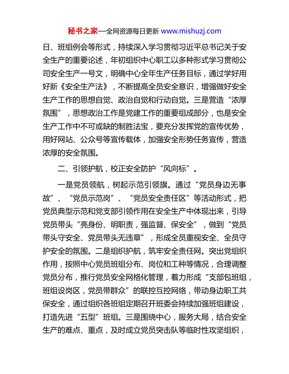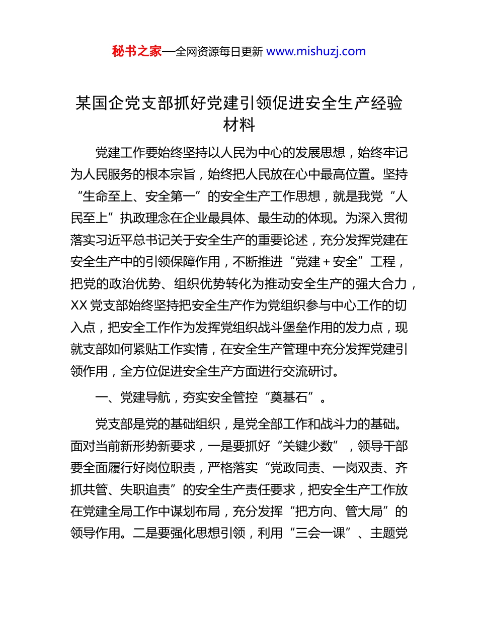 秘书之家—全网资源每日更新 www.mishuzj.com某国企党支部抓好党建引领促进安全生产经验材料党建工作要始终坚持以人民为中心的发展思想,始终牢记为人民服务的根本宗旨,始终把人民放在心中最高位置。坚持“生命至上、安全第一”的安全生产工作思想,就是我党“人民至上”执政理念在企业最具体、最生动的体现。为深入贯彻落实习近平总书记关于安全生产的重要论述,充分发挥党建在安全生产中的引领保障作用,不断推进“党建+安全”工程,把党的政治优势、组织优势转化为推动安全生产的强大合力,XX 党支部始终坚持把安全生产作为党组织参与中心工作的切入点,把安全工作作为发挥党组织战斗堡垒作用的发力点,现就支部如何紧贴工作实情,在安全生产管理中充分发挥党建引领作用,全方位促进安全生产方面进行交流研讨。一、党建导航,夯实安全管控“奠基石”。党支部是党的基础组织,是党全部工作和战斗力的基础。面对当前新形势新要求,一是要抓好“关键少数”,领导干部要全面履行好岗位职责,严格落实“党政同责、一岗双责、齐抓共管、失职追责”的安全生产责任要求,把安全生产工作放在党建全局工作中谋划布局,充分发挥“把方向、管大局”的领导作用。二是要强化思想引领,利用“三会一课”、主题党秘书之家—全网资源每日更新 www.mishuzj.com日、班组例会等形式,持续深入学习贯彻习近平总书记关于安全生产的重要论述,年初组织中心职工以多种形式学习贯彻公司安全生产一号文,明确中心全年生产任务目标,通过学好用好新《安全生产法》,不断提高全员安全意识,增强做好安全生产工作的思想自觉、政治自觉和行动自觉。三是营造“浓厚氛围”,思想政治工作是党建工作的重要组成部分,也是安全生产工作中不可或缺的制胜法宝,要充分发挥党的宣传优势,用好网站、公众号等宣传载体,加强安全形势任务宣传,营造浓厚的安全氛围。二、引领护航,校正安全防护“风向标”。一是党员领航,树起示范引领旗。通过“党员身边无事故”、“党员示范岗”、“党员安全责任区”等活动形式,把党员典型示范和党支部引领作用在安全生产中体现出来,引导党员带头“亮身份、明职责,强监督、保安全”,做到“党员带头守安全、党员带头无违章”,形成全员重视安全、全员守护安全的氛围。二是组织护航,筑牢安全责任网。突出党组织作用,按照中心党员班组分布、岗位和工种等情况,合理调整党员分布,推行党员安全网格化管理,着力形成“支部包班组,班组设岗区,党员带群众”的联控互控网络,带动身边职工共保安全,通过组织各班组定期召开班委会持续加强班组建设,打造先进“五型”班组。三是围绕中心,服务大局,结合安全生产的难点、重点,及时成立党员突击队等临时性攻坚组织,秘书之家—全网资源每日更新 www.mishuzj.com使广大党员成为安全生产战线的标兵与模范;引导党员特别是专业技术人员加强对生产现场的监督管理,严格查处违章指挥、违章作业、违反劳动纪律等行为,真正做到不安全不生产;持续推进开展“低标准”治理与安全专项整治活动,让广大党员带头执行好安全操作规程,守住安全生产底线,增强红线意识。三、专业助航,积聚服务保障“磁力场”。一是支部把抓好职工安全学习和安全思想教育放在基层党支部建设的重要位置,从思想根源解决安全意识薄弱的问题,深入贯彻落实集团公司、中新能化公司以及公司工作会会议精神,将安全教育纳入到“三会一课”和主题党日中来,将组织生活会与安全事故案例反思会结合开展,使党支部成为守住安全生产红线、底线的坚强堡垒。二是坚持党建带群建,通过开展技术比武、合理化建议征集、安全大讨论、事故应急演练等活动,及时自查、反省工作方面存在的问题与不足,不断提高职工技能操作水平与防范化解风险能力,促进安全生产教育取得更明显的实效。三是发挥基层党组织的桥梁纽带作用,深入推进“我为群众办实事”实践活动,把做好安全生产管理与服务职工群众、维护职工群众利益结合起来,把广大职工群众紧紧凝聚到党组织周围;通过党员群众结对子形式共学技能促进步,进一步完善职工队伍,补齐安全短板。四、委员巡航,强化机制约束“紧箍咒”。秘...
