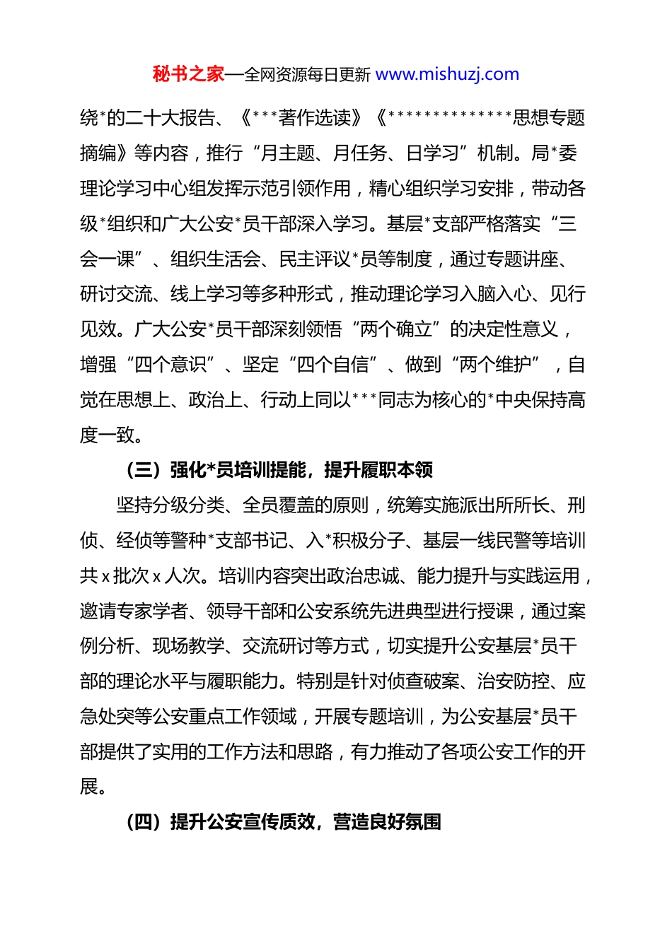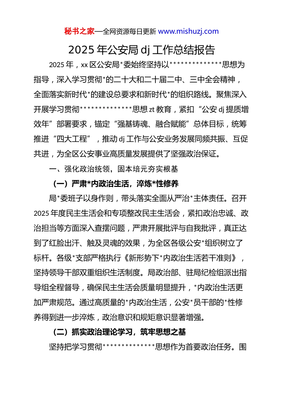 秘书之家—全网资源每日更新 www.mishuzj.com2025 年公安局 dj 工作总结报告2025 年,xx 区公安局*委始终坚持以**************思想为指导,深入学习贯彻*的二十大和二十届二中、三中全会精神,全面落实新时代*的建设总要求和新时代*的组织路线。聚焦深入开展学习贯彻**************思想 zt 教育,紧扣“公安 dj 提质增效年”部署要求,锚定“强基铸魂、融合赋能”总体目标,统筹推进“四大工程”,推动 dj 工作与公安业务发展同频共振、互促共进,为全区公安事业高质量发展提供了坚强政治保证。一、强化政治统领,固本培元夯实根基(一)严肃*内政治生活,淬炼*性修养局*委班子以身作则,带头落实全面从严治*主体责任。召开2025 年度民主生活会和专项整改民主生活会,紧扣政治忠诚、政治担当等方面深入查摆问题,严肃开展批评与自我批评,真正达到了红脸出汗、触及灵魂的效果,为全区各级公安*组织树立了标杆。各级*支部严格执行《新形势下*内政治生活若干准则》,坚持领导干部双重组织生活制度。局政治部、驻局纪检组派出指导组全程督导,确保民主生活会质量明显提升,*内政治生活更加严肃规范。通过高质量的*内政治生活,公安*员干部的*性修养得到进一步淬炼,政治意识和规矩意识显著增强。(二)抓实政治理论学习,筑牢思想之基坚持把学习贯彻**************思想作为首要政治任务。围秘书之家—全网资源每日更新 www.mishuzj.com绕*的二十大报告、《***著作选读》《**************思想专题摘编》等内容,推行“月主题、月任务、日学习”机制。局*委理论学习中心组发挥示范引领作用,精心组织学习安排,带动各级*组织和广大公安*员干部深入学习。基层*支部严格落实“三会一课”、组织生活会、民主评议*员等制度,通过专题讲座、研讨交流、线上学习等多种形式,推动理论学习入脑入心、见行见效。广大公安*员干部深刻领悟“两个确立”的决定性意义,增强“四个意识”、坚定“四个自信”、做到“两个维护”,自觉在思想上、政治上、行动上同以***同志为核心的*中央保持高度一致。(三)强化*员培训提能,提升履职本领坚持分级分类、全员覆盖的原则,统筹实施派出所所长、刑侦、经侦等警种*支部书记、入*积极分子、基层一线民警等培训共 x 批次 x 人次。培训内容突出政治忠诚、能力提升与实践运用,邀请专家学者、领导干部和公安系统先进典型进行授课,通过案例分析、现场教学、交流研讨等方式,切实提升公安基层*员干部的理论水平与履职能力。特别是针对侦查破案、治安防控、应急处突等公安重点工作领域,开展专题培训,为公安基层*员干部提供了实用的工作方法和思路,有力推动了各项公安工作的开展。(四)提升公安宣传质效,营造良好氛围秘书之家—全网资源每日更新 www.mishuzj.com深化公安 dj 宣传矩阵建设,充分利用各类媒体平台,广泛宣传公安 dj 成果和先进典型。2025 年在《xx 公安 dj 平台》发布公安 dj 信息 x 条,开设“我的从警初心”“理论学习”“晒整改”等专栏,总阅读量达 x 万人次。《xx 公安微先锋》刊发信息 x 篇,《人民公安报》采用稿件 x 篇,《xx 公安微讯》推送 x 篇,形成了多平台联动、立体化宣传格局。通过宣传,展示了全区公安 dj工作的新成效、新亮点,营造了良好的舆论氛围,激发了广大公安*员干部干事创业的热情。二、推动融合共建,多点突破增强效能(一)做强基层所队 dj,筑牢公安战斗堡垒深入实施基层所队 dj“整警推进、整体提升”行动,选优配强基层所队*组织带头人,加强所队“两委”班子建设。开展公安*员“先锋指数”管理,激励*员在公安工作中发挥先锋模范作用。加强基层所队*员活动场所建设,提升服务功能。实施“dj+业务”发展模式,培育壮大公安特色工作品牌,提升公安工作效能。例如,[具体派出所名称]*支部依托信息化手段,发展智慧警务,成立数据研判小组,带领民警破获多起疑难案件,打击效能大幅提升。(二)推进平安建设,维护社会稳定制定出台《关于加强社会治安防控体系建设的实施意见》,整合公安资源、加大投入,通过加强巡逻防控、打击违法犯罪、秘书之家—全网资源每日更新...