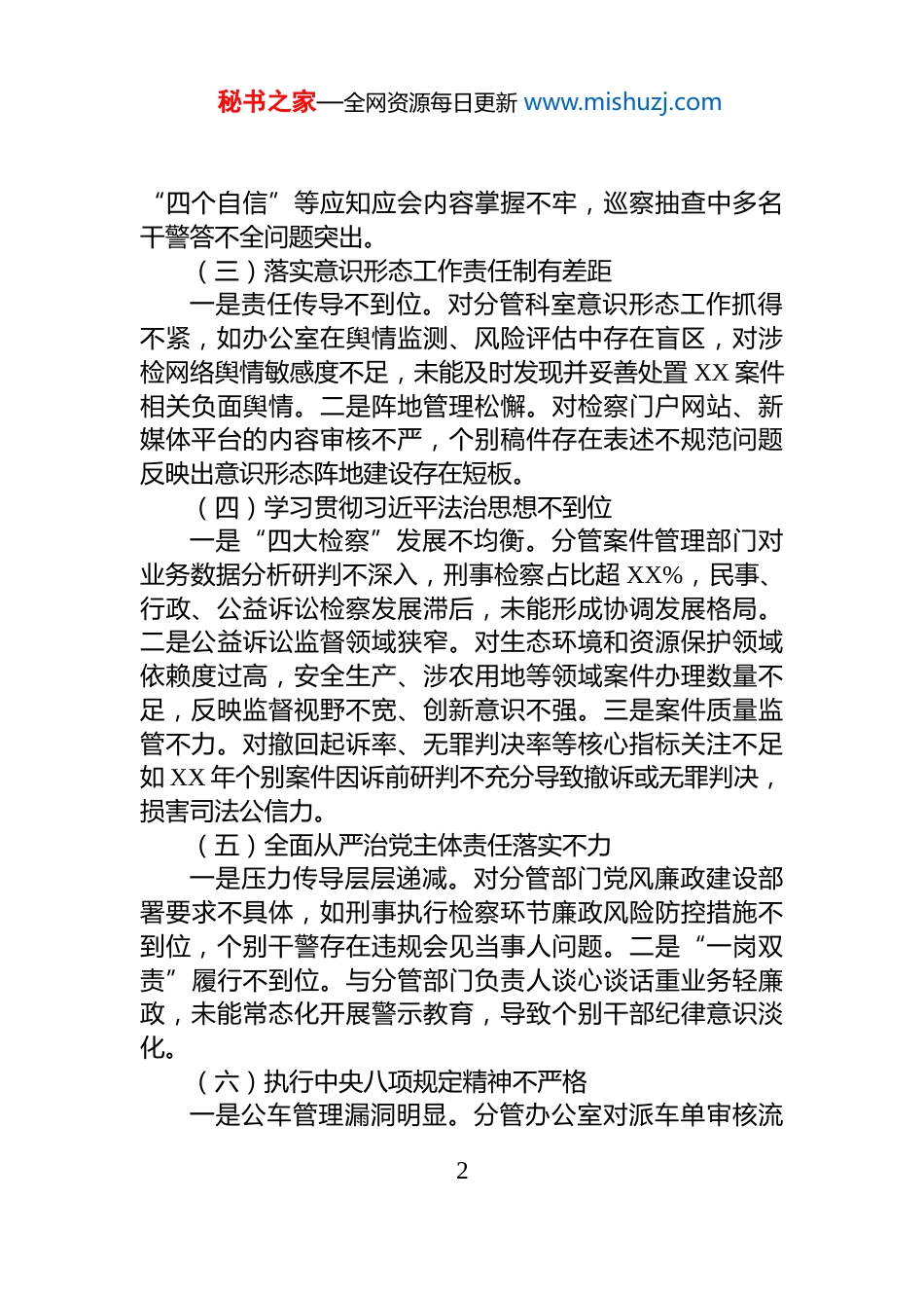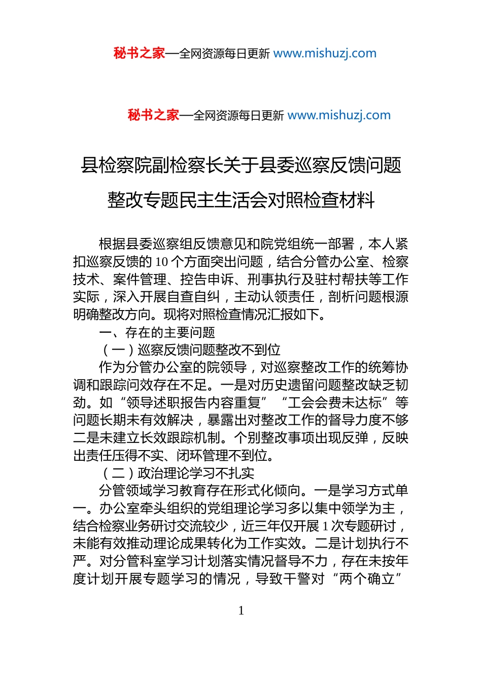 秘书之家—全网资源每日更新 www.mishuzj.com秘书之家—全网资源每日更新 www.mishuzj.com县检察院副检察长关于县委巡察反馈问题整改专题民主生活会对照检查材料根据县委巡察组反馈意见和院党组统一部署,本人紧扣巡察反馈的 10 个方面突出问题,结合分管办公室、检察技术、案件管理、控告申诉、刑事执行及驻村帮扶等工作实际,深入开展自查自纠,主动认领责任,剖析问题根源明确整改方向。现将对照检查情况汇报如下。一、存在的主要问题(一)巡察反馈问题整改不到位作为分管办公室的院领导,对巡察整改工作的统筹协调和跟踪问效存在不足。一是对历史遗留问题整改缺乏韧劲。如“领导述职报告内容重复”“工会会费未达标”等问题长期未有效解决,暴露出对整改工作的督导力度不够二是未建立长效跟踪机制。个别整改事项出现反弹,反映出责任压得不实、闭环管理不到位。(二)政治理论学习不扎实分管领域学习教育存在形式化倾向。一是学习方式单一。办公室牵头组织的党组理论学习多以集中领学为主,结合检察业务研讨交流较少,近三年仅开展 1 次专题研讨,未能有效推动理论成果转化为工作实效。二是计划执行不严。对分管科室学习计划落实情况督导不力,存在未按年度计划开展专题学习的情况,导致干警对“两个确立”1秘书之家—全网资源每日更新 www.mishuzj.com“四个自信”等应知应会内容掌握不牢,巡察抽查中多名干警答不全问题突出。(三)落实意识形态工作责任制有差距一是责任传导不到位。对分管科室意识形态工作抓得不紧,如办公室在舆情监测、风险评估中存在盲区,对涉检网络舆情敏感度不足,未能及时发现并妥善处置 XX 案件相关负面舆情。二是阵地管理松懈。对检察门户网站、新媒体平台的内容审核不严,个别稿件存在表述不规范问题反映出意识形态阵地建设存在短板。(四)学习贯彻习近平法治思想不到位一是“四大检察”发展不均衡。分管案件管理部门对业务数据分析研判不深入,刑事检察占比超 XX%,民事、行政、公益诉讼检察发展滞后,未能形成协调发展格局。二是公益诉讼监督领域狭窄。对生态环境和资源保护领域依赖度过高,安全生产、涉农用地等领域案件办理数量不足,反映监督视野不宽、创新意识不强。三是案件质量监管不力。对撤回起诉率、无罪判决率等核心指标关注不足如 XX 年个别案件因诉前研判不充分导致撤诉或无罪判决,损害司法公信力。(五)全面从严治党主体责任落实不力一是压力传导层层递减。对分管部门党风廉政建设部署要求不具体,如刑事执行检察环节廉政风险防控措施不到位,个别干警存在违规会见当事人问题。二是“一岗双责”履行不到位。与分管部门负责人谈心谈话重业务轻廉政,未能常态化开展警示教育,导致个别干部纪律意识淡化。(六)执行中央八项规定精神不严格一是公车管理漏洞明显。分管办公室对派车单审核流2秘书之家—全网资源每日更新 www.mishuzj.com于形式,存在出差地点模糊、代签审批等问题,暴露出制度执行不严。二是公务接待不规范。对驻村帮扶工作队接待费用审核不细,未按规定收取伙食费,违反基层减负相关规定。(七)财务管理不严分管领域存在财务风险隐患。一是往来账款长期挂账。办公室牵头负责的 XX 万元其他应付款未及时清理,影响财务规范性。二是采购程序缺失。刑事执行装备采购未附审批手续,资产处置收入入账手续不全,暴露内控机制不健全。(八)机关党建工作不严不实一是党建引领作用弱化。分管机关党委期间未将党建工作纳入部门考核体系,XX 年未专题研究党建工作,党建与业务“两张皮”现象突出。二是组织生活形式化。指导机关支部开展组织生活会不严格,批评与自我批评未触及实质问题,民主评议党员走过场。(九)工作作风不实一是服务意识不强。控告申诉窗口存在群众反映问题处理不及时问题,如 XX 年某涉法涉诉信访案件因流转不畅引发重复访。二是纪律执行松散。对驻村帮扶工作队考勤管理宽松软,XX 年 X 季度多人次未签到,影响驻村工作成效。(十)制度机制不健全一是绩效考核不公平。分管部门目标责任奖平均分配,未体现考核等次差异,挫伤干警积极性。二是激励机制缺失。对驻村帮扶干部关心...