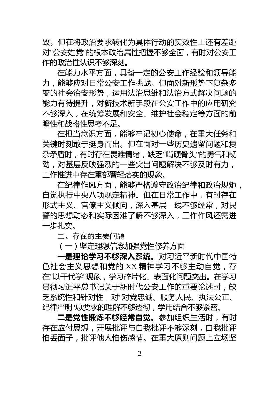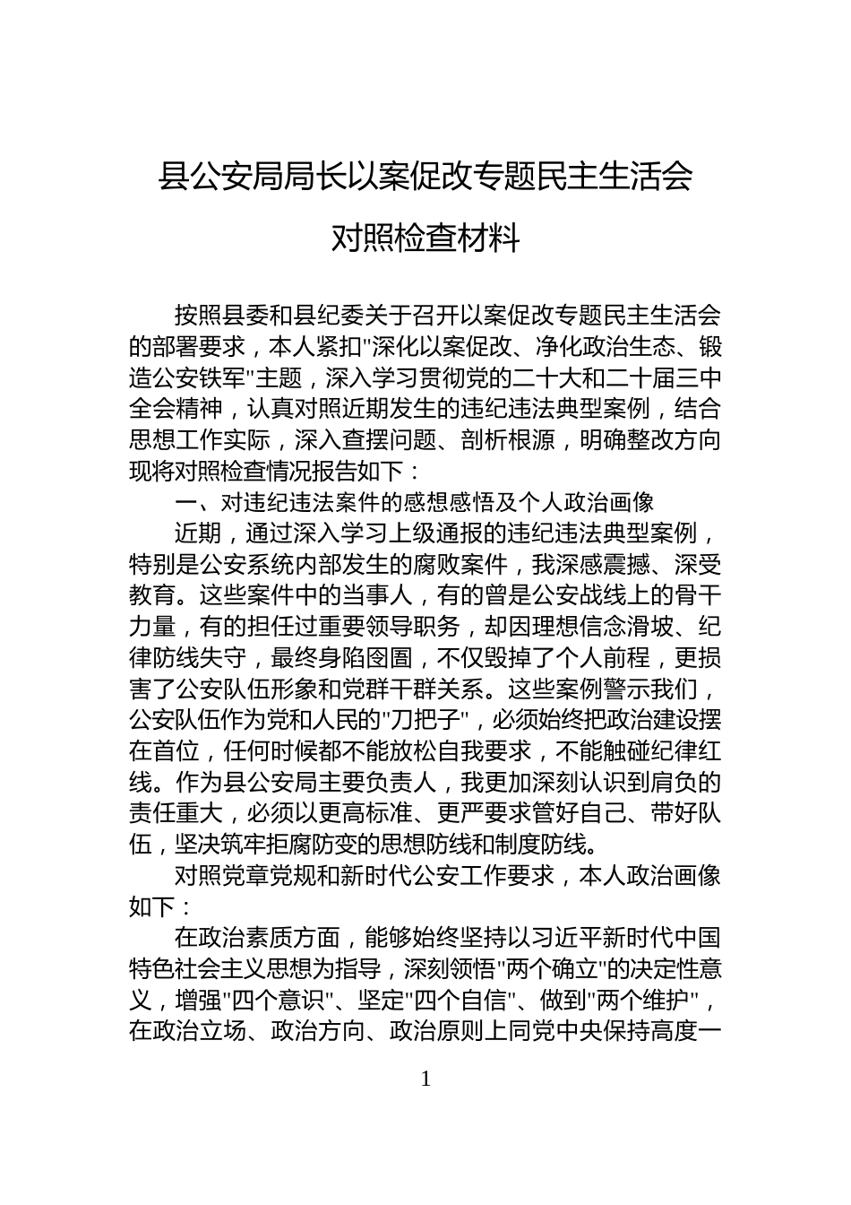 县公安局局长以案促改专题民主生活会对照检查材料按照县委和县纪委关于召开以案促改专题民主生活会的部署要求,本人紧扣"深化以案促改、净化政治生态、锻造公安铁军"主题,深入学习贯彻党的二十大和二十届三中全会精神,认真对照近期发生的违纪违法典型案例,结合思想工作实际,深入查摆问题、剖析根源,明确整改方向现将对照检查情况报告如下:一、对违纪违法案件的感想感悟及个人政治画像近期,通过深入学习上级通报的违纪违法典型案例,特别是公安系统内部发生的腐败案件,我深感震撼、深受教育。这些案件中的当事人,有的曾是公安战线上的骨干力量,有的担任过重要领导职务,却因理想信念滑坡、纪律防线失守,最终身陷囹圄,不仅毁掉了个人前程,更损害了公安队伍形象和党群干群关系。这些案例警示我们,公安队伍作为党和人民的"刀把子",必须始终把政治建设摆在首位,任何时候都不能放松自我要求,不能触碰纪律红线。作为县公安局主要负责人,我更加深刻认识到肩负的责任重大,必须以更高标准、更严要求管好自己、带好队伍,坚决筑牢拒腐防变的思想防线和制度防线。对照党章党规和新时代公安工作要求,本人政治画像如下:在政治素质方面,能够始终坚持以习近平新时代中国特色社会主义思想为指导,深刻领悟"两个确立"的决定性意义,增强"四个意识"、坚定"四个自信"、做到"两个维护",在政治立场、政治方向、政治原则上同党中央保持高度一1致。但在将政治要求转化为具体行动的实效性上还有差距对"公安姓党"的根本政治属性把握不够全面,有时对公安工作的政治性认识不够深刻。在能力水平方面,具备一定的公安工作经验和领导能力,能够应对日常公安工作挑战。但面对新形势下复杂多变的社会治安形势,运用法治思维和法治方式解决问题的能力有待提升,对新技术新手段在公安工作中的应用研究不够深入,在统筹发展和安全、维护社会稳定等方面的前瞻性和战略性思考不足。在担当意识方面,能够牢记初心使命,在重大任务和关键时刻敢于挺身而出。但在面对一些历史遗留问题和复杂矛盾时,有时存在畏难情绪,缺乏"啃硬骨头"的勇气和韧劲,对基层反映强烈的一些突出问题解决不够及时有力,工作推进中存在重部署轻落实的现象。在纪律作风方面,能够严格遵守政治纪律和政治规矩,自觉执行中央八项规定精神。但在日常工作中,有时存在形式主义、官僚主义倾向,深入基层一线不够经常,对民警的思想动态和实际困难了解不够深入,工作作风还需进一步扎实。二、存在的主要问题(一)坚定理想信念加强党性修养方面一是理论学习不够深入系统。对习近平新时代中国特色社会主义思想和党的 XX 精神学习不够主动自觉,存在"以干代学"现象,学习碎片化、表面化问题突出。在学习贯彻习近平总书记关于新时代公安工作的重要论述时,缺乏系统性和针对性,对"对党忠诚、服务人民、执法公正、纪律严明"总要求的理解不够透彻,学用结合不够紧密。二是党性锻炼不够经常自觉。参加组织生活时,有时存在应付思想,开展批评与自我批评不够深刻,自我批评怕丢面子,批评他人怕伤感情。在重大原则问题上立场坚2定,但在一些具体问题上党性原则性体现不够充分,存在"老好人"思想,对一些不良现象和问题批评纠正不够坚决。三是政治敏锐性有待提升。对意识形态领域的复杂形势认识不够清醒,对社会上一些错误言论和不良风气的警惕性不足,缺乏主动抵制和斗争的意识。在处理一些敏感问题时,政治判断力、政治领悟力不够强,没有充分认识到公安工作的政治属性和敏感特性。(二)严格遵纪守法加强纪法意识方面一是纪律规矩执行不够严格。对公安队伍纪律作风建设的重要性认识不够深刻,有时存在"抓大放小"思想,对一些"小节"问题重视不够。在执行各项纪律规定时,标准不高、要求不严,对个别民警的违纪行为处理不够及时坚决,存在失之于宽、失之于软的情况。二是法治思维和法治方式运用不够到位。在推进执法规范化建设上力度不够大,对一些执法不规范问题整治不够彻底。有时在处理复杂案件时,存在重结果轻程序的倾向,对执法全过程记录制度落实不够严格,对执法质量的监督把关不够细致。三是纪律教育不够深入有效。对民警的纪...