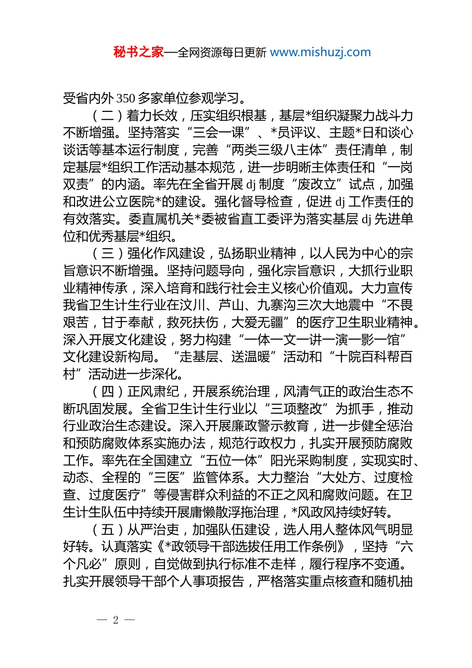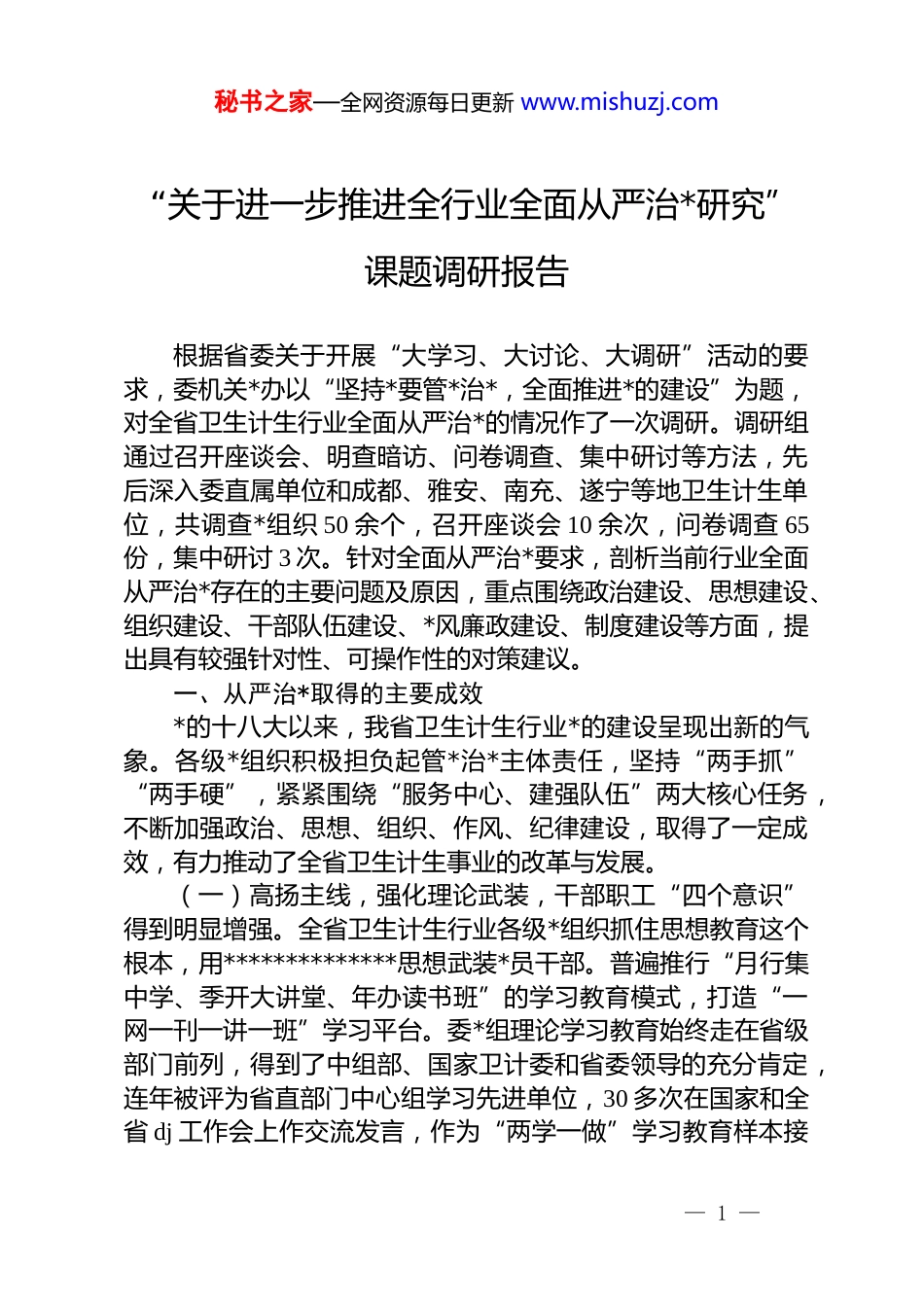 秘书之家—全网资源每日更新 www.mishuzj.com“关于进一步推进全行业全面从严治*研究”课题调研报告根据省委关于开展“大学习、大讨论、大调研”活动的要求,委机关*办以“坚持*要管*治*,全面推进*的建设”为题,对全省卫生计生行业全面从严治*的情况作了一次调研。调研组通过召开座谈会、明查暗访、问卷调查、集中研讨等方法,先后深入委直属单位和成都、雅安、南充、遂宁等地卫生计生单位,共调查*组织 50 余个,召开座谈会 10 余次,问卷调查 65份,集中研讨 3 次。针对全面从严治*要求,剖析当前行业全面从严治*存在的主要问题及原因,重点围绕政治建设、思想建设、组织建设、干部队伍建设、*风廉政建设、制度建设等方面,提出具有较强针对性、可操作性的对策建议。一、从严治*取得的主要成效*的十八大以来,我省卫生计生行业*的建设呈现出新的气象。各级*组织积极担负起管*治*主体责任,坚持“两手抓”“两手硬”,紧紧围绕“服务中心、建强队伍”两大核心任务,不断加强政治、思想、组织、作风、纪律建设,取得了一定成效,有力推动了全省卫生计生事业的改革与发展。(一)高扬主线,强化理论武装,干部职工“四个意识”得到明显增强。全省卫生计生行业各级*组织抓住思想教育这个根本,用**************思想武装*员干部。普遍推行“月行集中学、季开大讲堂、年办读书班”的学习教育模式,打造“一网一刊一讲一班”学习平台。委*组理论学习教育始终走在省级部门前列,得到了中组部、国家卫计委和省委领导的充分肯定,连年被评为省直部门中心组学习先进单位,30 多次在国家和全省 dj 工作会上作交流发言,作为“两学一做”学习教育样本接— 1 —秘书之家—全网资源每日更新 www.mishuzj.com受省内外 350 多家单位参观学习。(二)着力长效,压实组织根基,基层*组织凝聚力战斗力不断增强。坚持落实“三会一课”、*员评议、主题*日和谈心谈话等基本运行制度,完善“两类三级八主体”责任清单,制定基层*组织工作活动基本规范,进一步明晰主体责任和“一岗双责”的内涵。率先在全省开展 dj 制度“废改立”试点,加强和改进公立医院*的建设。强化督导检查,促进 dj 工作责任的有效落实。委直属机关*委被省直工委评为落实基层 dj 先进单位和优秀基层*组织。(三)强化作风建设,弘扬职业精神,以人民为中心的宗旨意识不断增强。坚持问题导向,强化宗旨意识,大抓行业职业精神传承,深入培育和践行社会主义核心价值观。大力宣传我省卫生计生行业在汶川、芦山、九寨沟三次大地震中“不畏艰苦,甘于奉献,救死扶伤,大爱无疆”的医疗卫生职业精神。深入开展文化建设,努力构建“一体一文一讲一演一影一馆”文化建设新构局。“走基层、送温暖”活动和“十院百科帮百村”活动进一步深化。(四)正风肃纪,开展系统治理,风清气正的政治生态不断巩固发展。全省卫生计生行业以“三项整改”为抓手,推动行业政治生态建设。深入开展廉政警示教育,进一步健全惩治和预防腐败体系实施办法,规范行政权力,扎实开展预防腐败工作。率先在全国建立“五位一体”阳光采购制度,实现实时、动态、全程的“三医”监管体系。大力整治“大处方、过度检查、过度医疗”等侵害群众利益的不正之风和腐败问题。在卫生计生队伍中持续开展庸懒散浮拖治理,*风政风持续好转。(五)从严治吏,加强队伍建设,选人用人整体风气明显好转。认真落实《*政领导干部选拔任用工作条例》,坚持“六个凡必”原则,自觉做到执行标准不走样,履行程序不变通。扎实开展领导干部个人事项报告,严格落实重点核查和随机抽— 2 —秘书之家—全网资源每日更新 www.mishuzj.com查规定,对存在漏报、瞒报行为的,严肃进行书面函询或诫勉谈话。严格落实《推进领导干部能上能下规定》,加大对不胜任不适宜担任现职干部调整力度,从严管理、竞争择优、优胜劣汰的导向进一步形成。加强干部学习培养,启动卫生系统“全覆盖、大培训”培训工作,5 年来累计培训 8000 余人。先后选派近 500 名干部到国家卫计委和基层挂职锻炼、援助民族地区彝区。委*组先后出台“1+n”干部人事制度,形成干部选任、动态调整、...